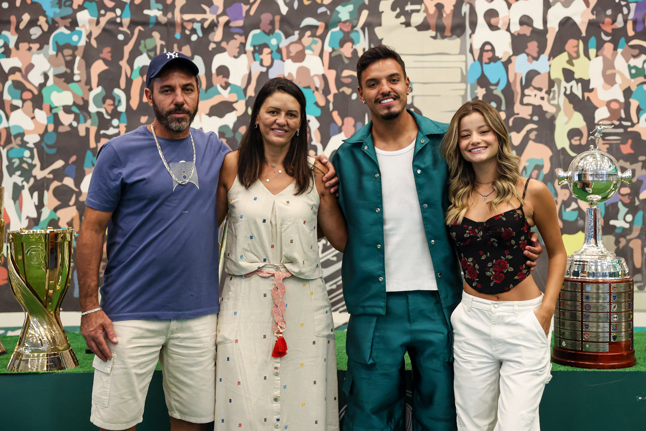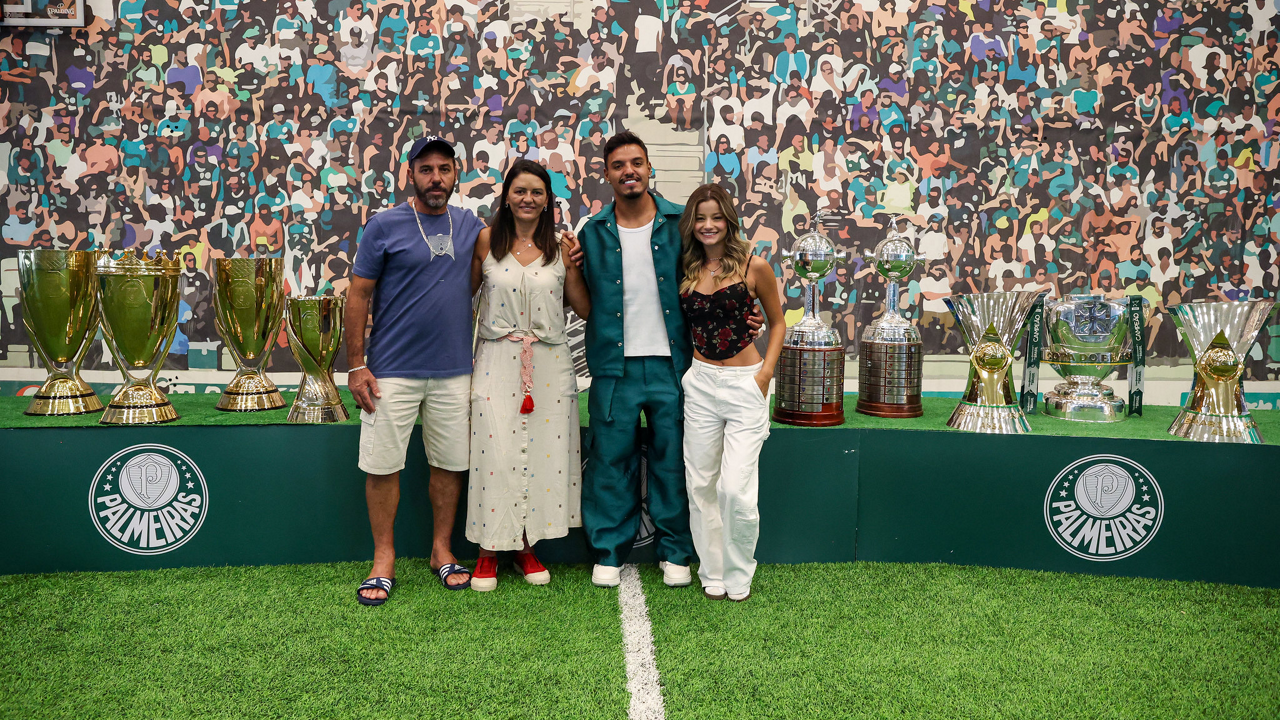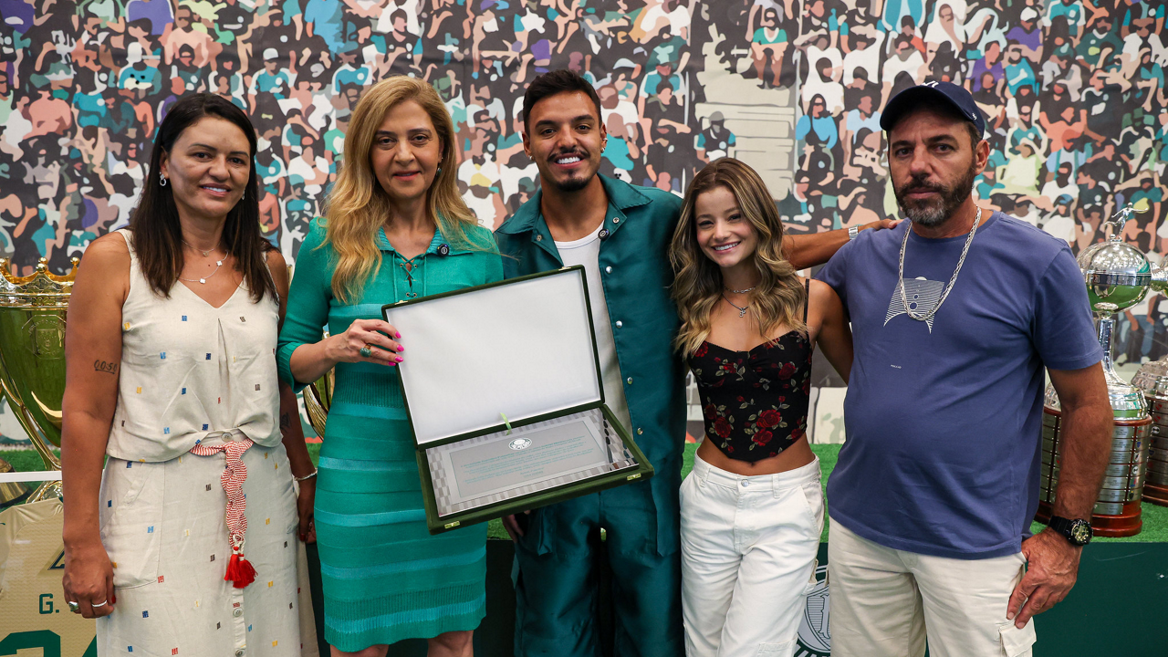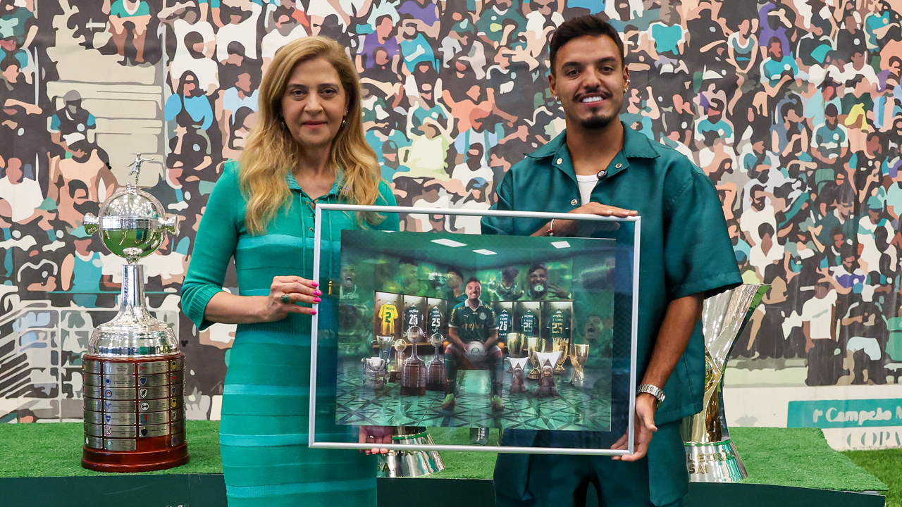 O jogador Gabriel Menino recebe homenagem da presidente Leila Pereira, na Academia de Futebol. (Foto: Fabio Menotti/Palmeiras/by Canon)