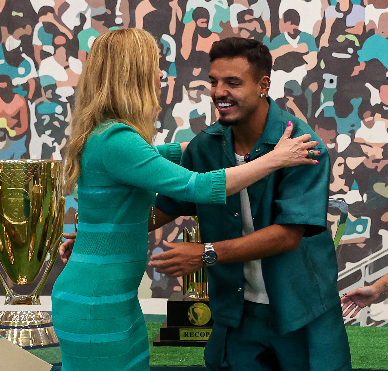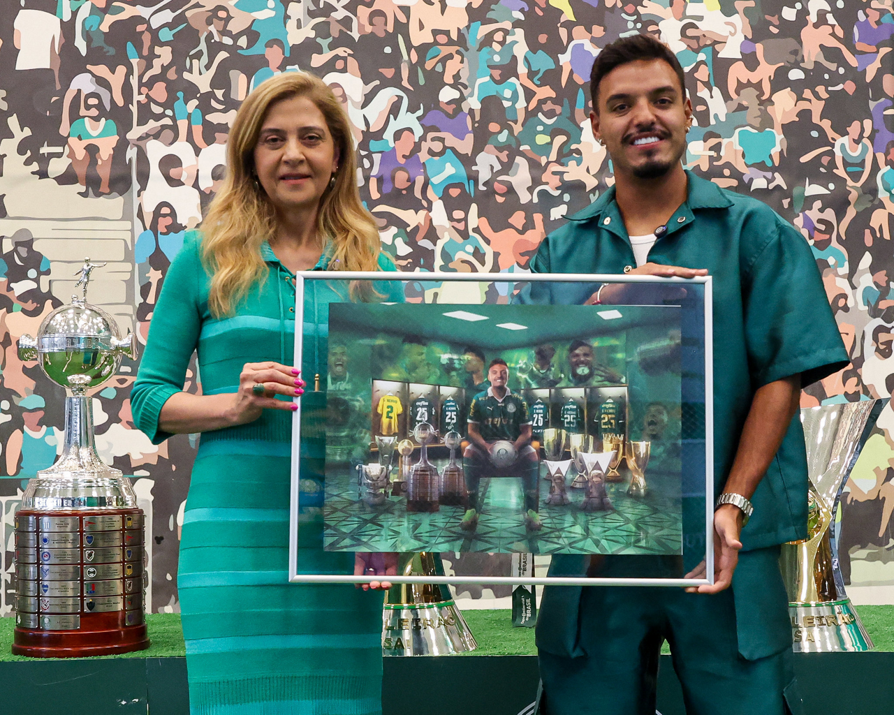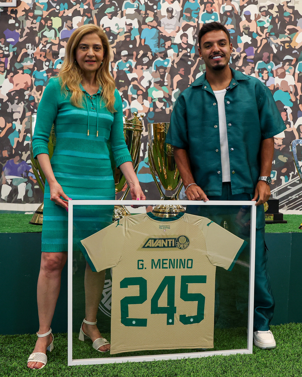 O jogador Gabriel Menino recebe homenagem da presidente Leila Pereira, na Academia de Futebol. (Foto: Fabio Menotti/Palmeiras/by Canon)