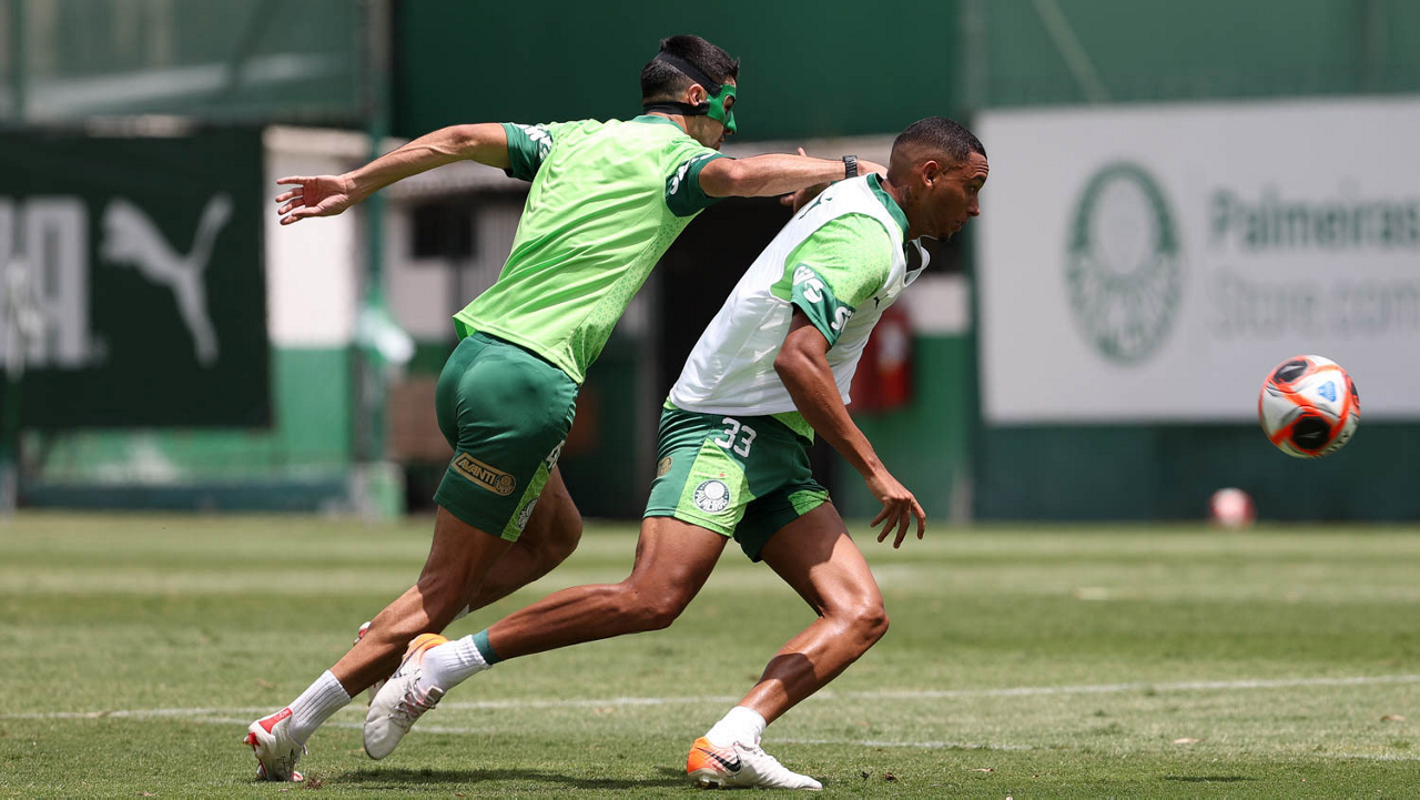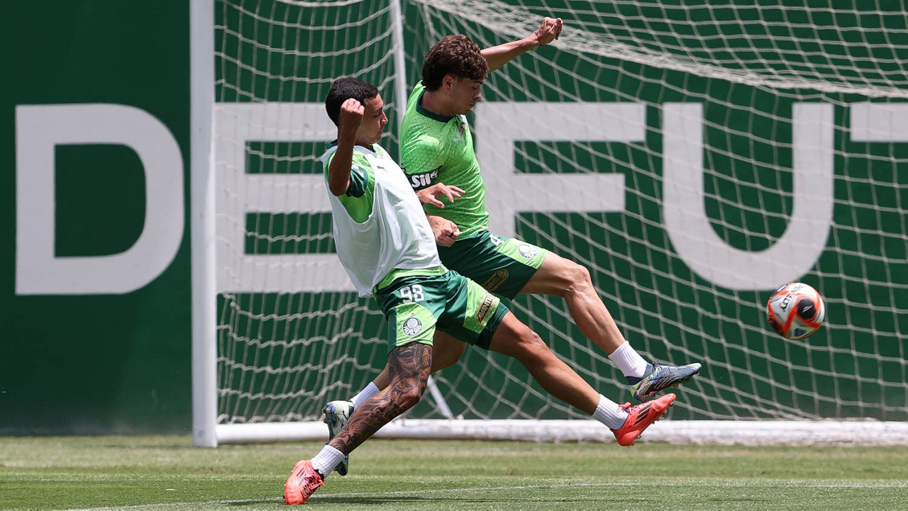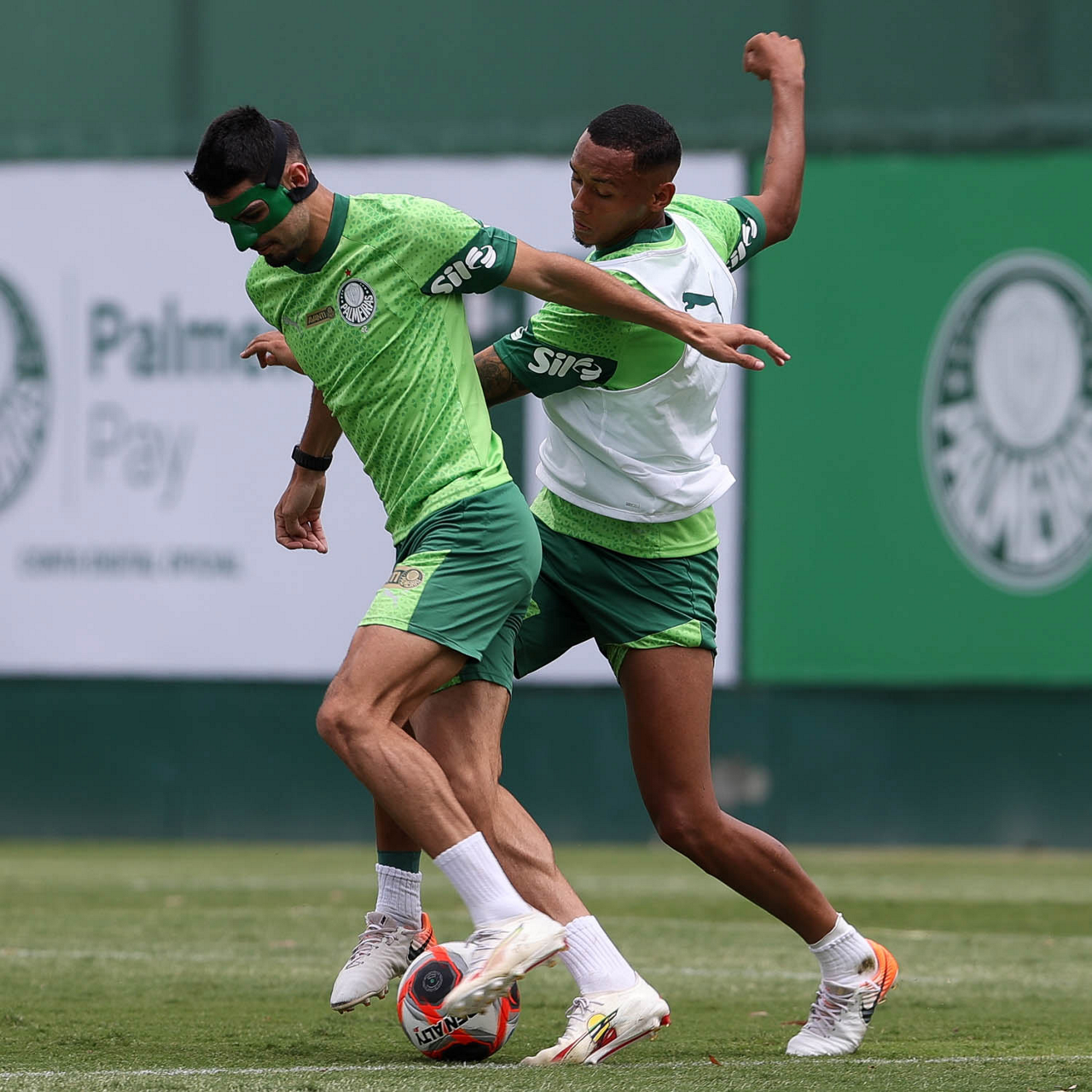 Os jogadores Benedetti e Facundo Torres (D), da SE Palmeiras, durante treinamento, na Academia de Futebol. (Foto: Cesar Greco/Palmeiras/by Canon)