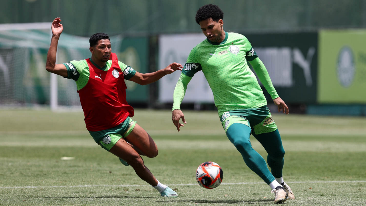 Os jogadores Thalys e Agustín Giay (D), da SE Palmeiras, durante treinamento, na Academia de Futebol. (Foto: Cesar Greco/Palmeiras/by Canon)