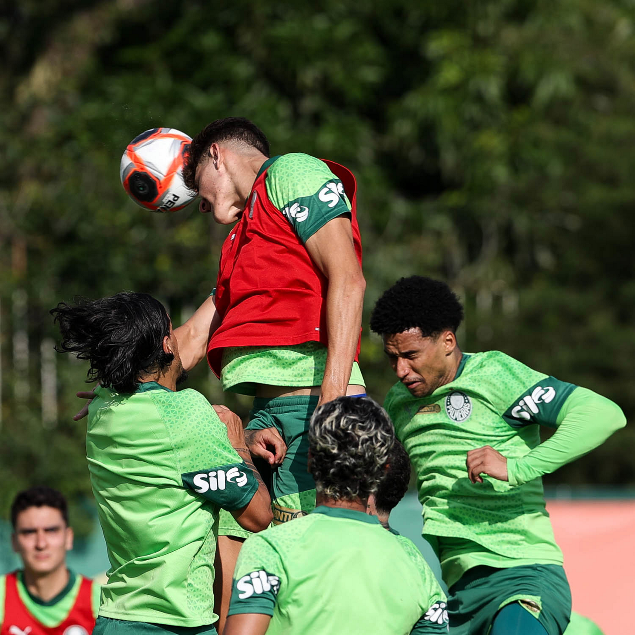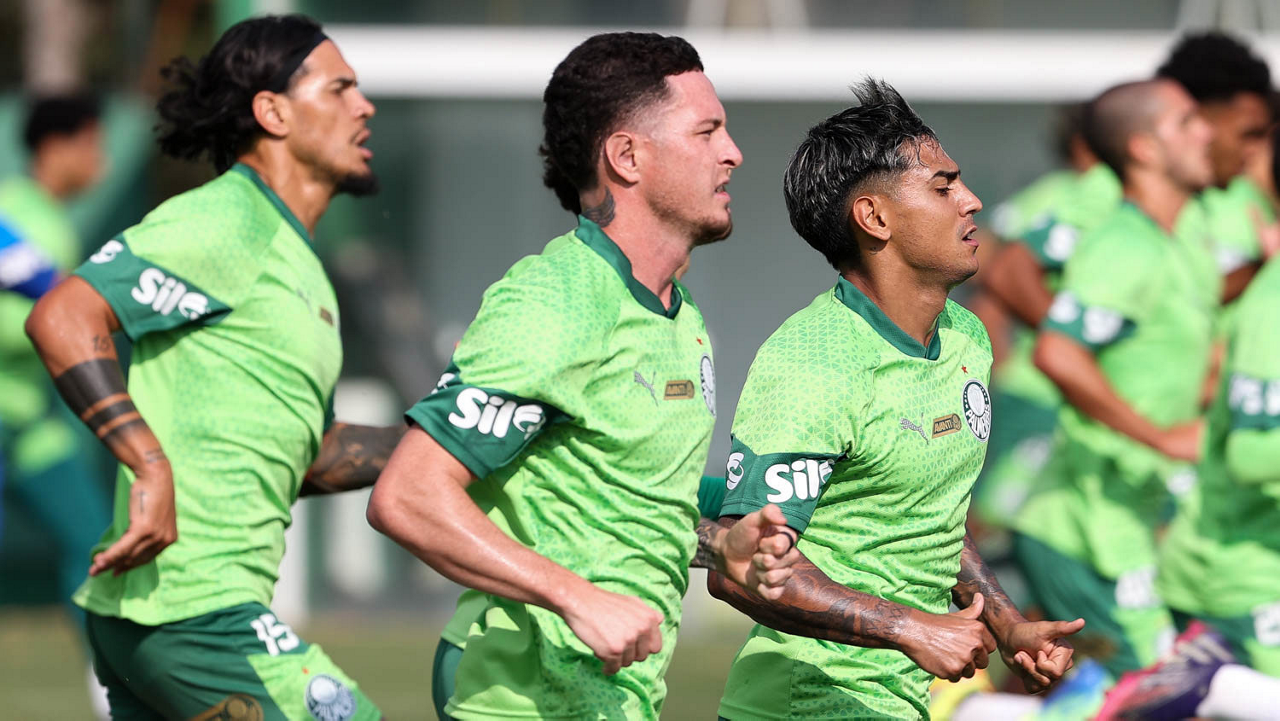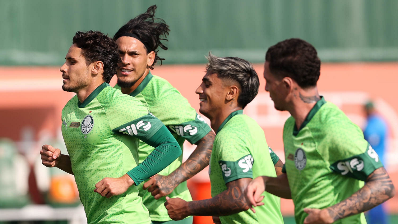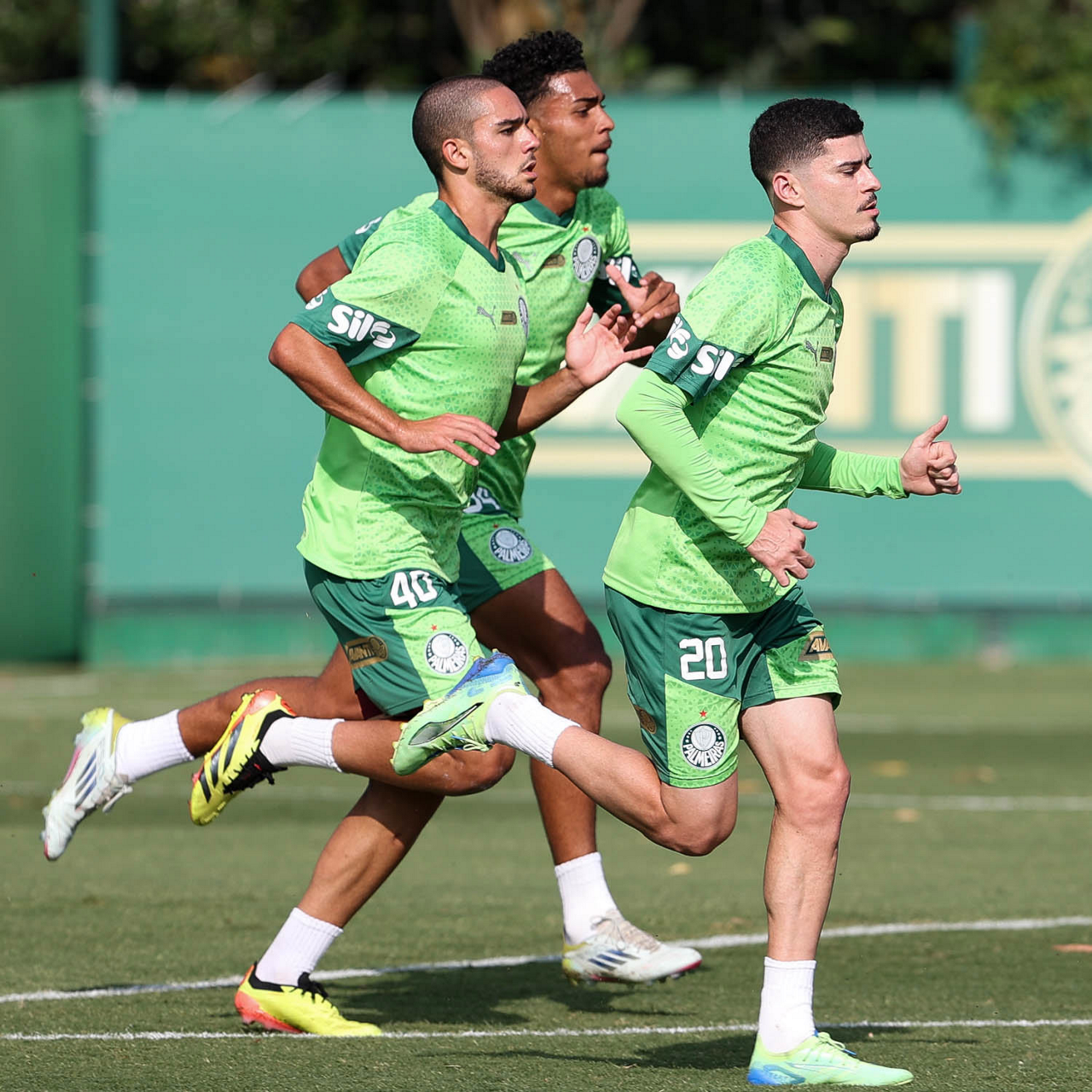 Os jogadores Gustavo Gómez, Benedetti e Murilo (E/D), da SE Palmeiras, durante treinamento, na Academia de Futebol. (Foto: Cesar Greco/Palmeiras/by Canon)
