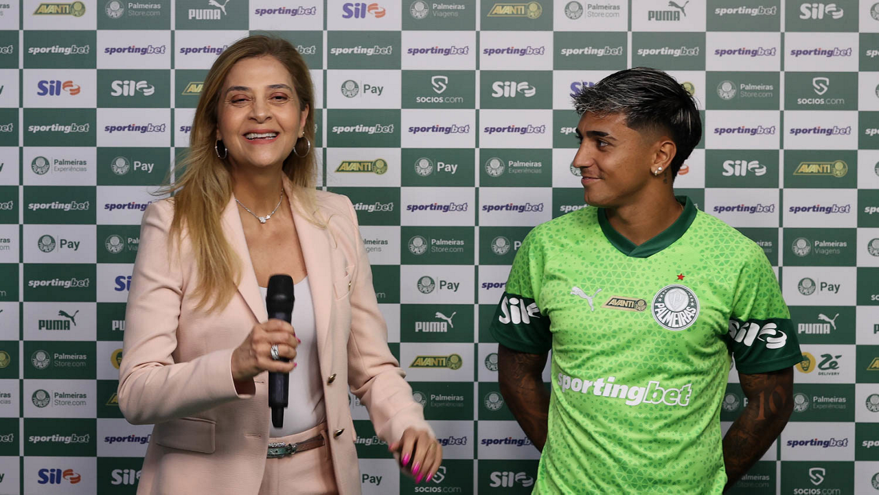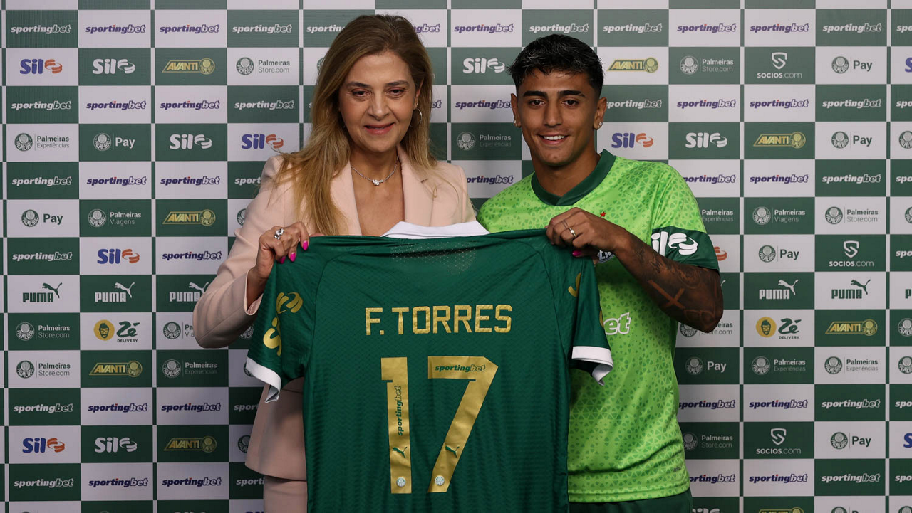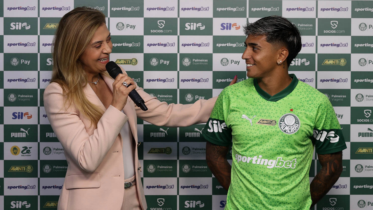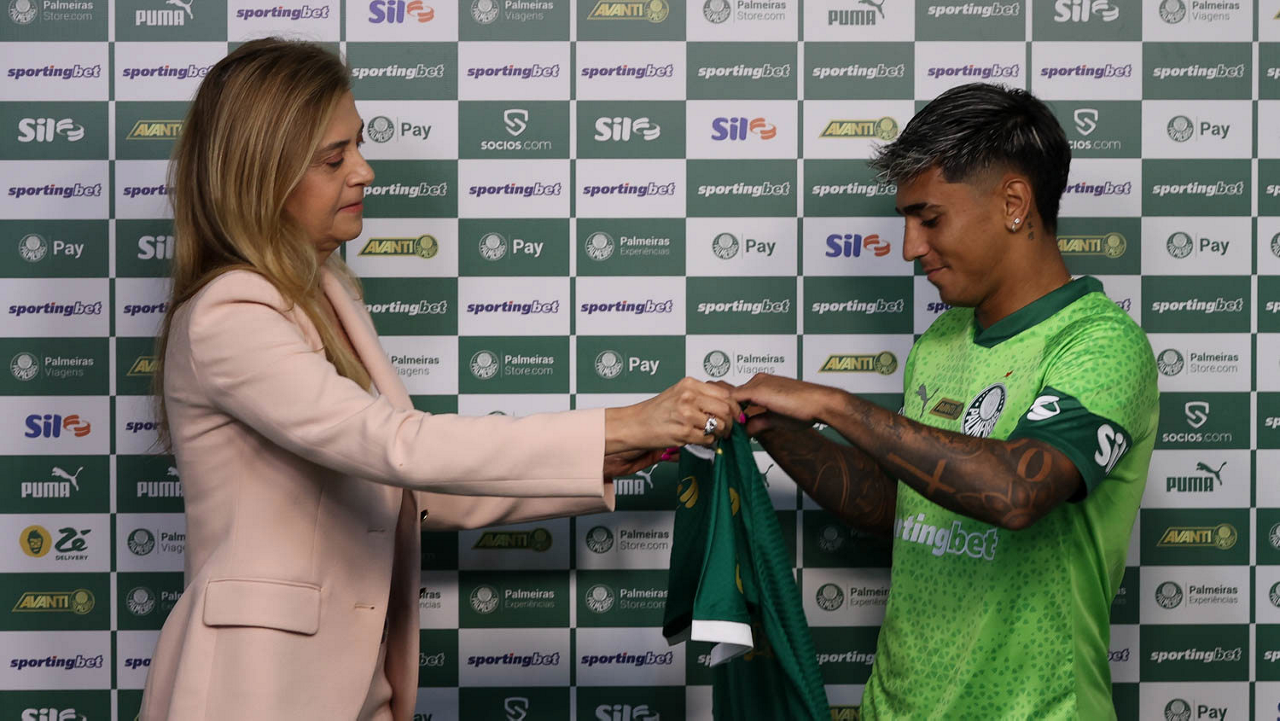 A presidente Leila Pereira, da SE Palmeiras, apresenta o mais novo atleta do clube, o jogador Facundo Torres (D), na Academia de Futebol. (Foto: Cesar Greco/Palmeiras/by Canon)