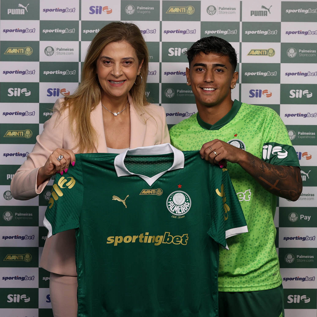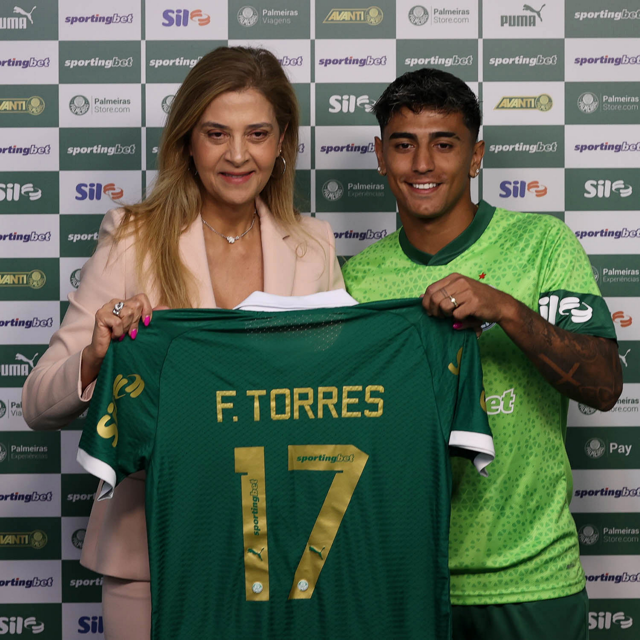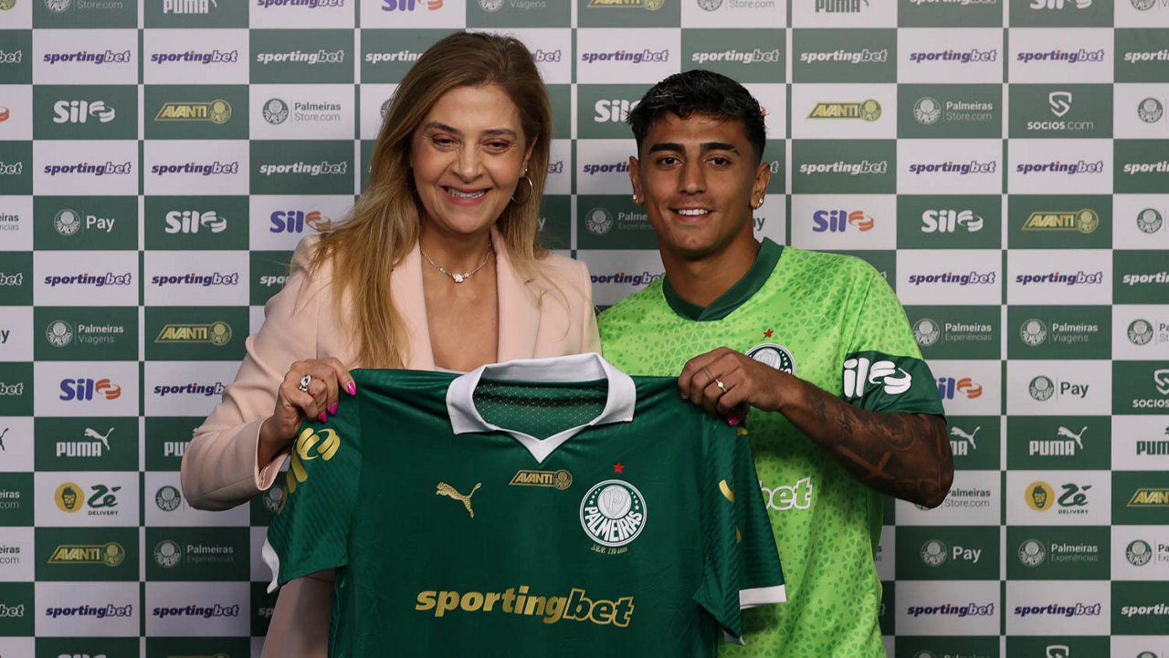 A presidente Leila Pereira, da SE Palmeiras, apresenta o mais novo atleta do clube, o jogador Facundo Torres (D), na Academia de Futebol. (Foto: Cesar Greco/Palmeiras/by Canon)