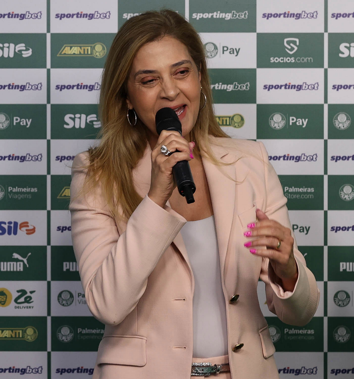 A presidente Leila Pereira, da SE Palmeiras, apresenta o mais novo atleta do clube, o jogador Facundo Torres, na Academia de Futebol. (Foto: Cesar Greco/Palmeiras/by Canon)
