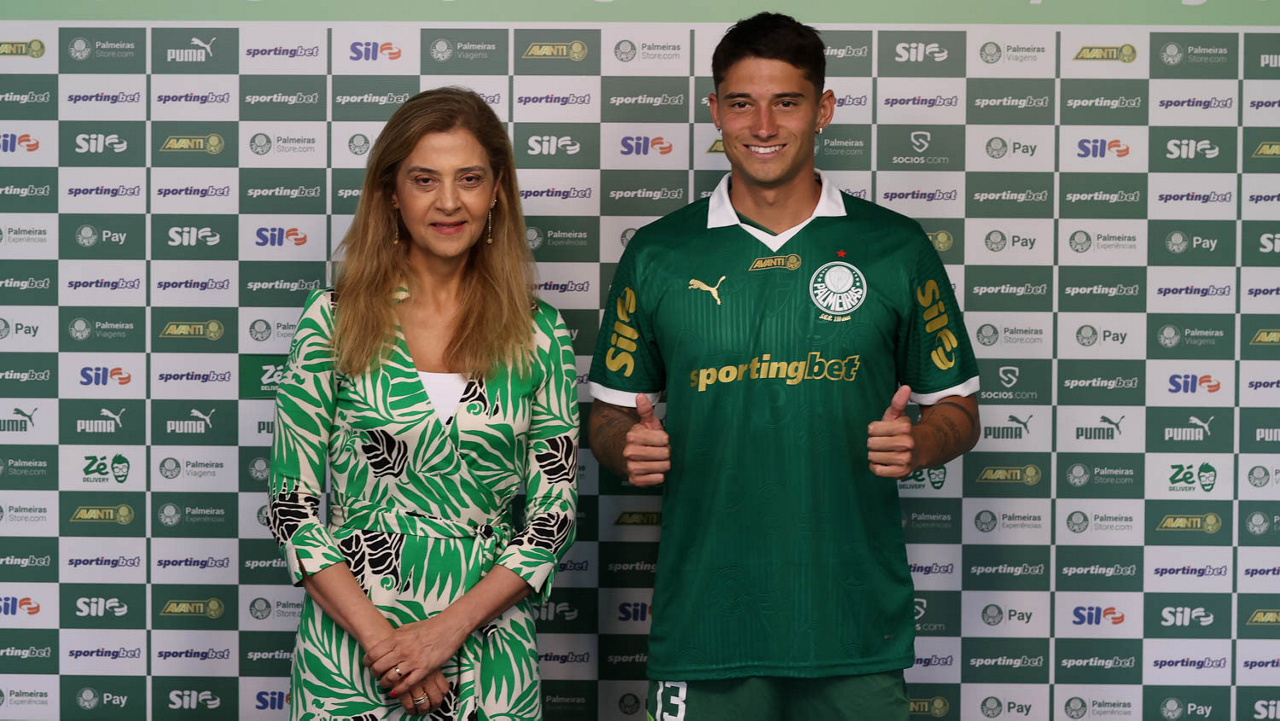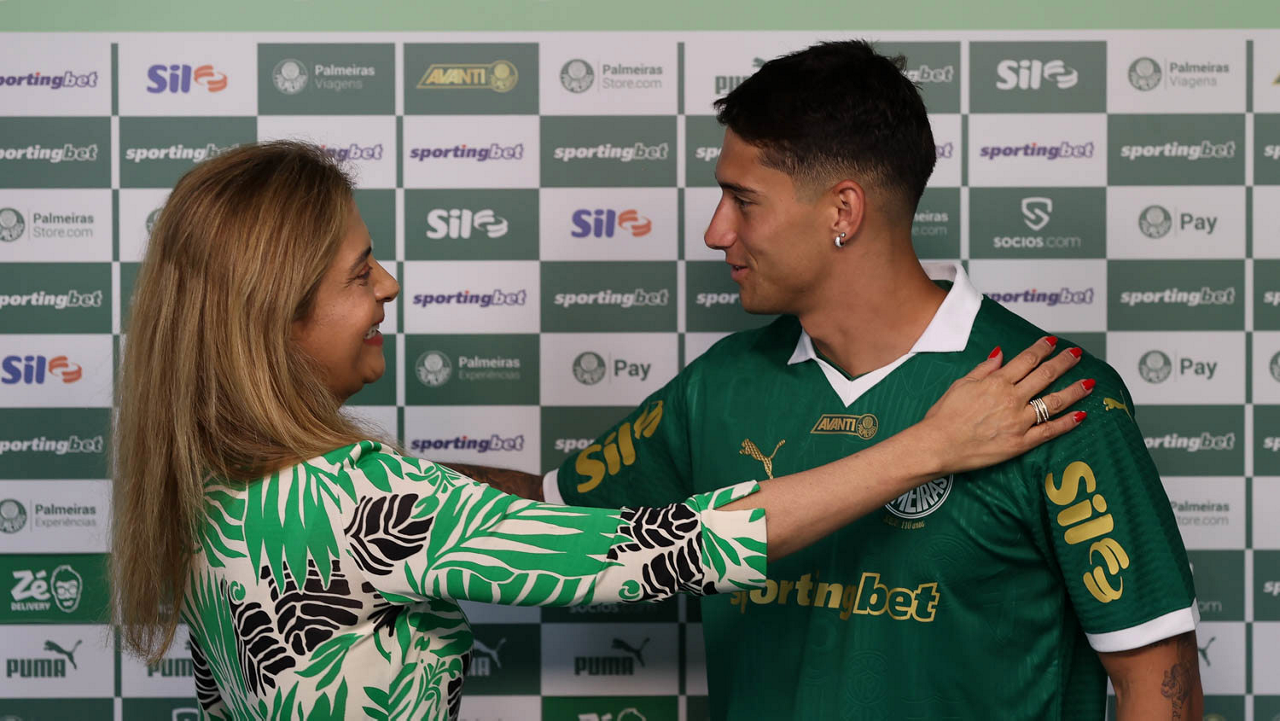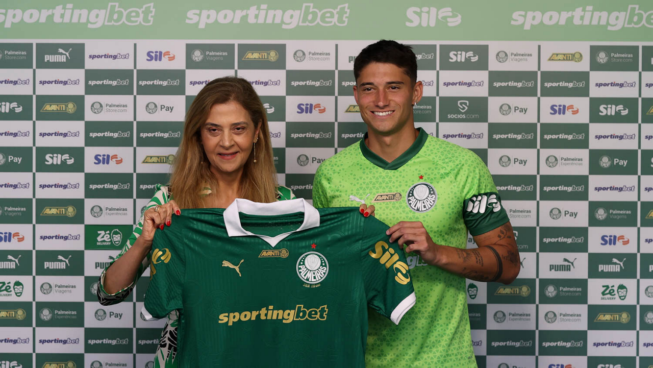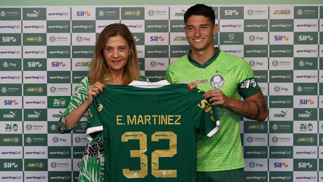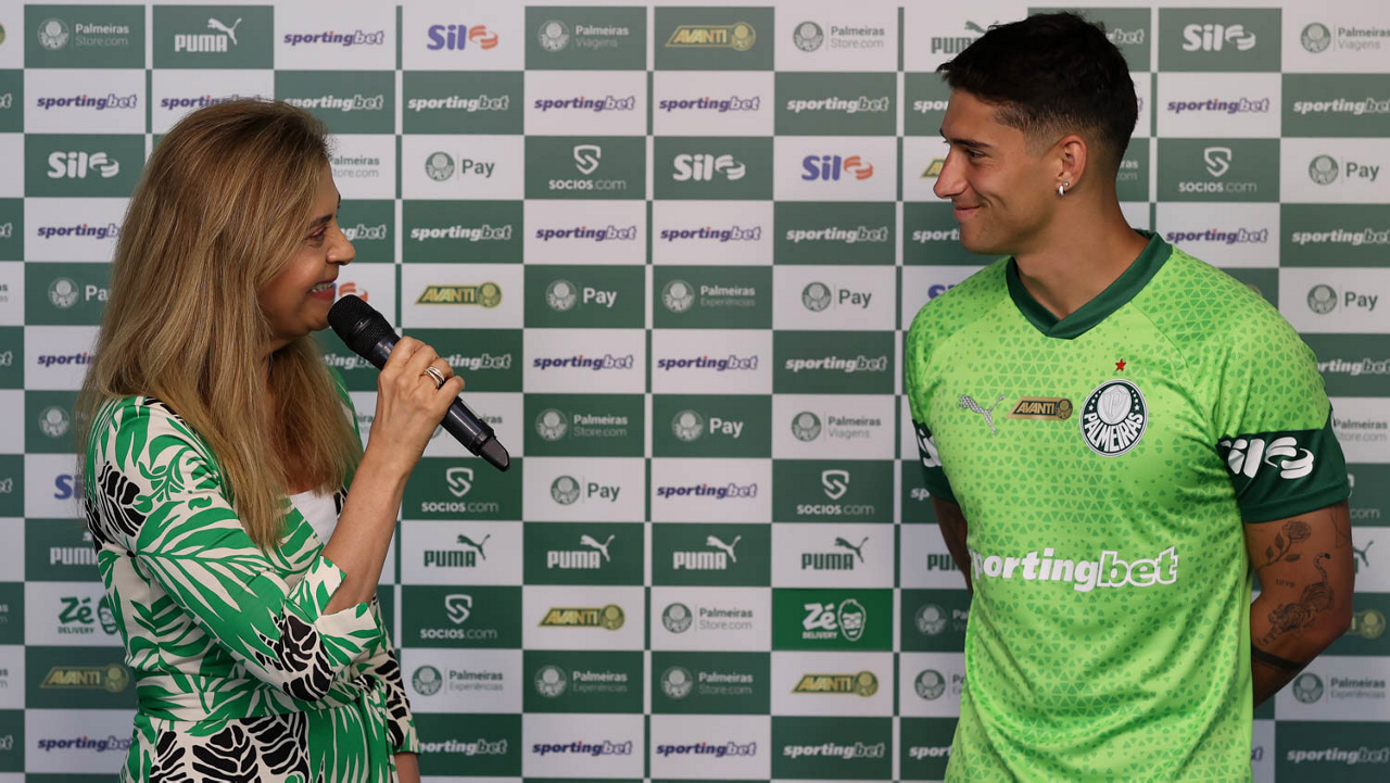 A presidente Leila Pereira, da SE Palmeiras, apresenta o mais novo atleta do clube, Emiliano Martínez, na Academia de Futebol. (Foto: Cesar Greco/Palmeiras/by Canon)