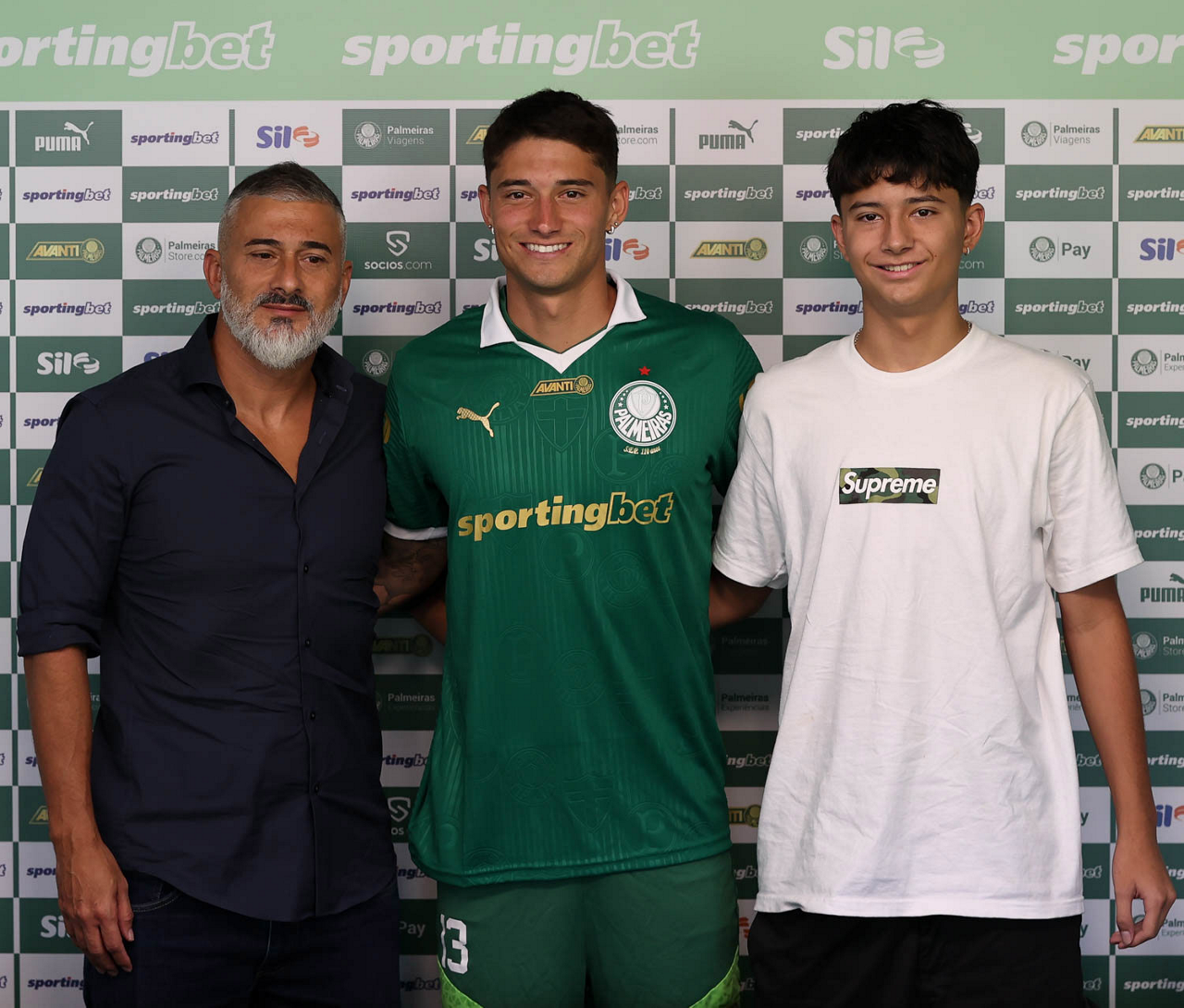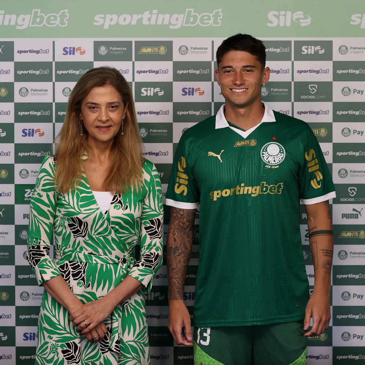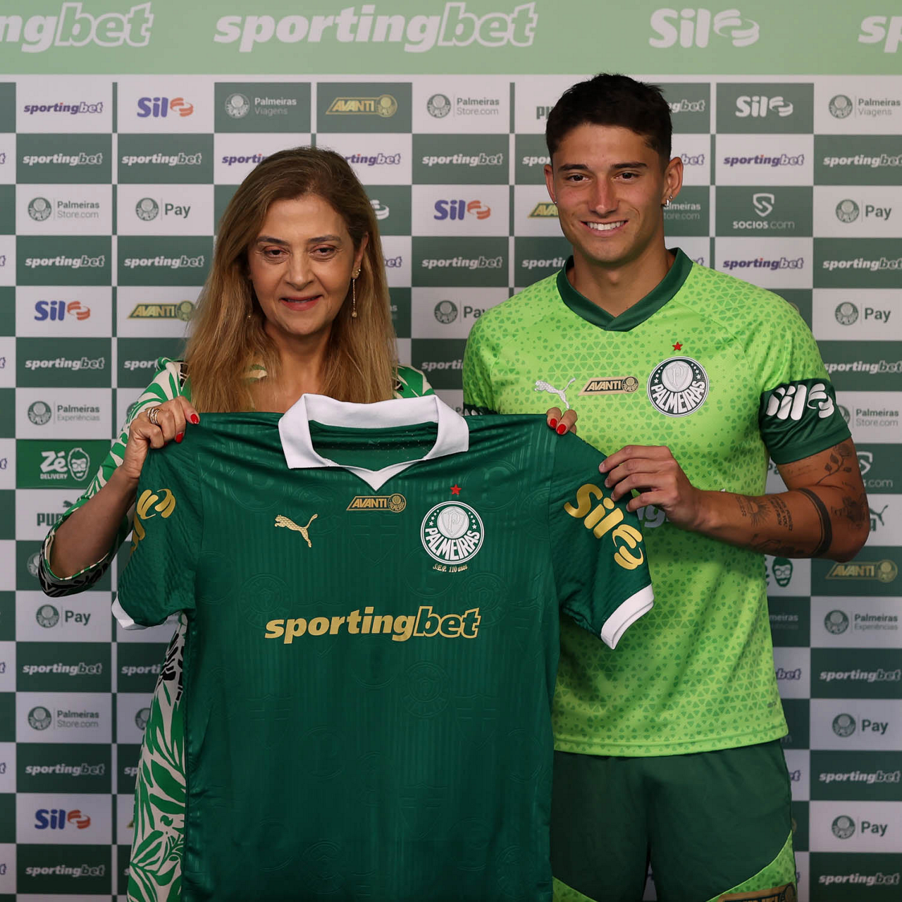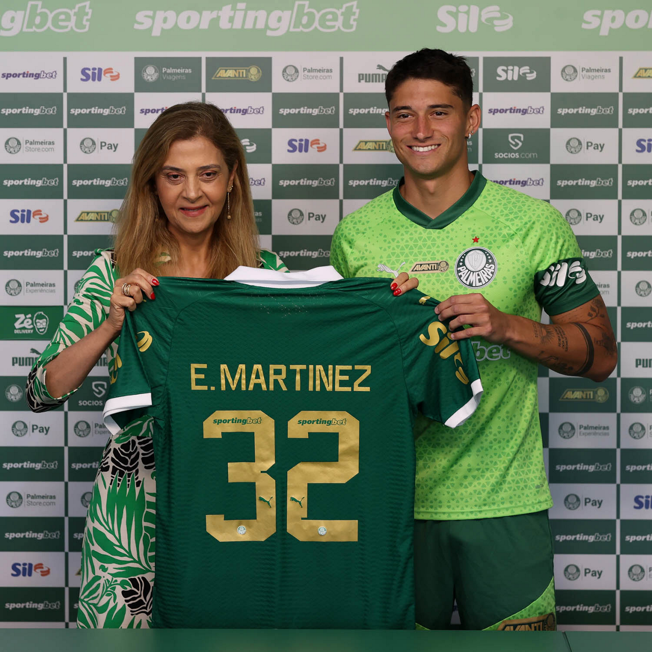 A presidente Leila Pereira, da SE Palmeiras, apresenta o mais novo atleta do clube, Emiliano Martínez, na Academia de Futebol. (Foto: Cesar Greco/Palmeiras/by Canon)