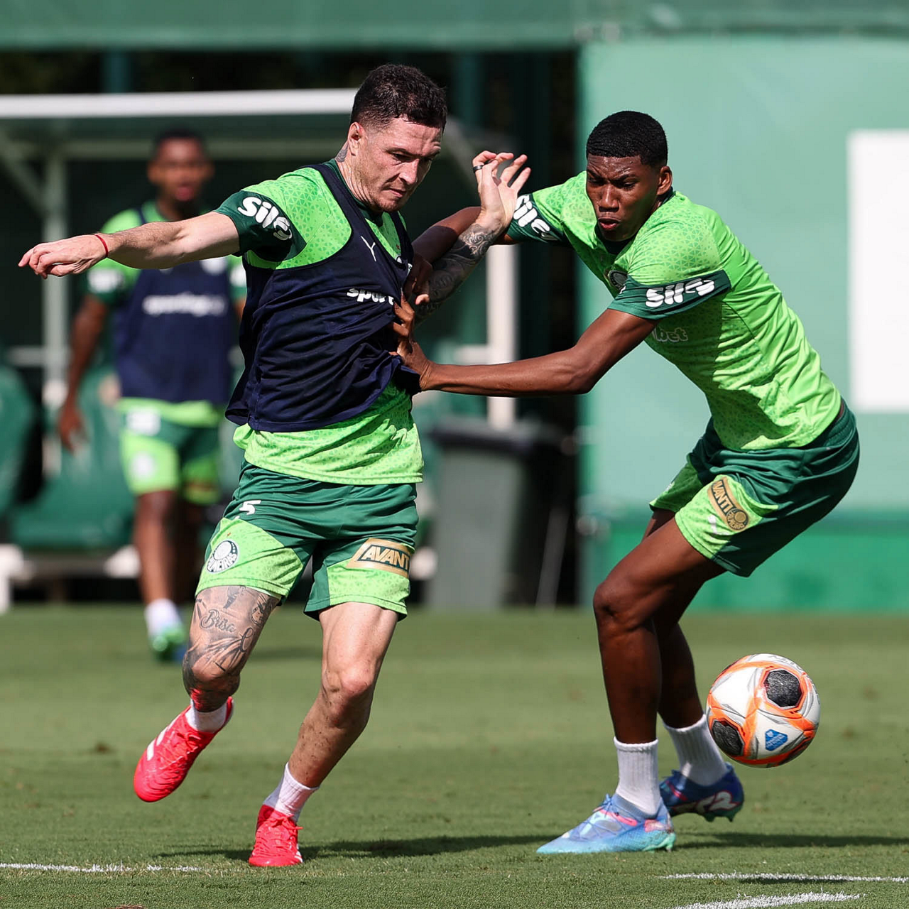 Os jogadores Figueiredo e Emiliano Martínez (D), da SE Palmeiras, durante treinamento, na Academia de Futebol. (Foto: Cesar Greco/Palmeiras/by Canon)