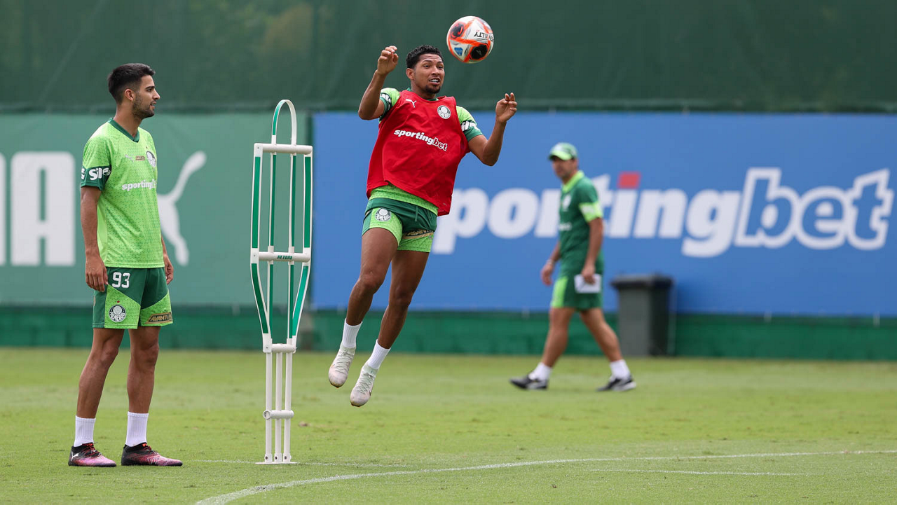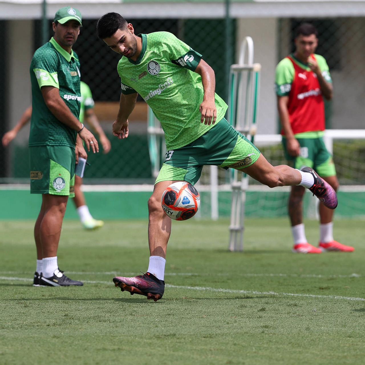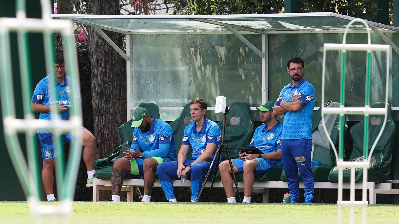 O analista de desempenho Rogerio Abreu, o massagista Alan Gabriel, o médico Victor Soraggi, o fisiologista Vinicius Ponzio e o massagista Paulinho (E/D), da SE Palmeiras, durante treinamento, na Academia de Futebol. (Foto: Cesar Greco/Palmeiras/by Canon)
