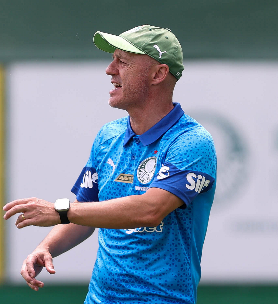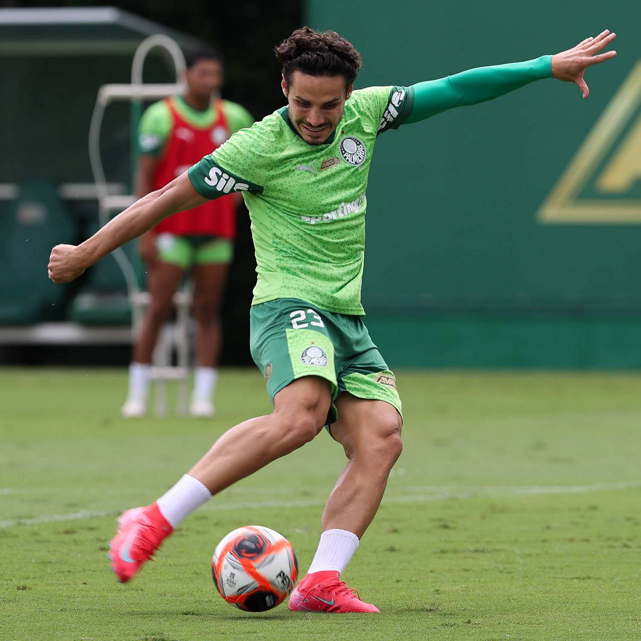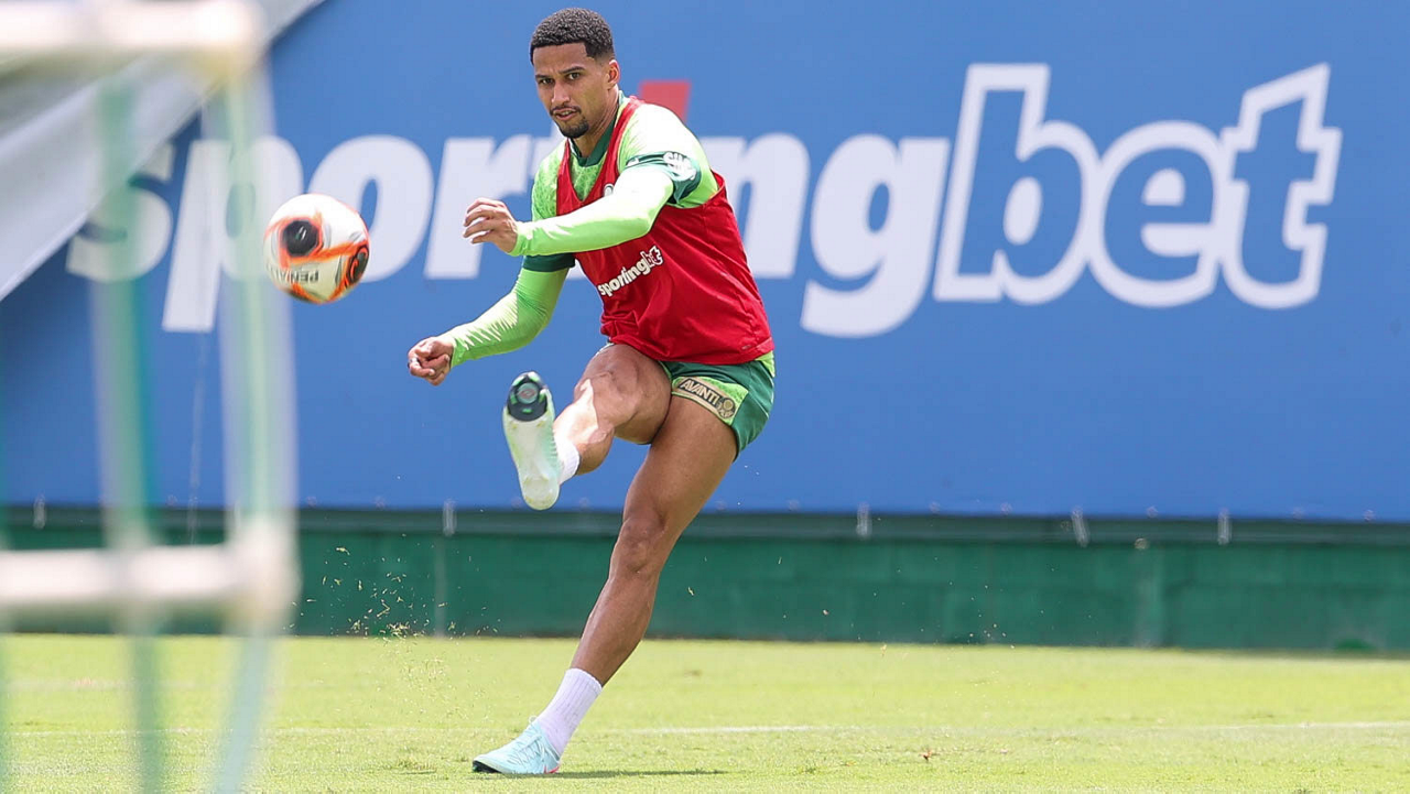 O analista de desempenho Rogerio Abreu, o massagista Alan Gabriel, o médico Victor Soraggi, o fisiologista Vinicius Ponzio e o massagista Paulinho (E/D), da SE Palmeiras, durante treinamento, na Academia de Futebol. (Foto: Cesar Greco/Palmeiras/by Canon)