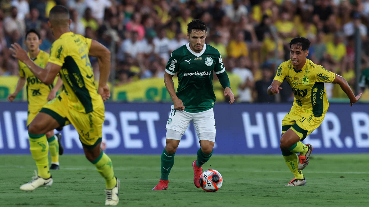 O jogador Raphael Veiga, da SE Palmeiras, comemora seu gol contra a equipe do Mirassol FC, durante partida válida pela fase de grupos, do Campeonato Paulista, Série A1, no Estádio Municipal José Maria de Campos Maia. (Foto: Cesar Greco/Palmeiras/by Canon)