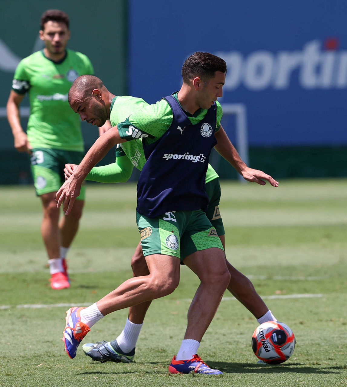 O jogador Flaco López, Emiliano Martínez e Facundo Torres (E/D), da SE Palmeiras, durante treinamento, na Academia de Futebol. (Foto: Cesar Greco/Palmeiras/by Canon)