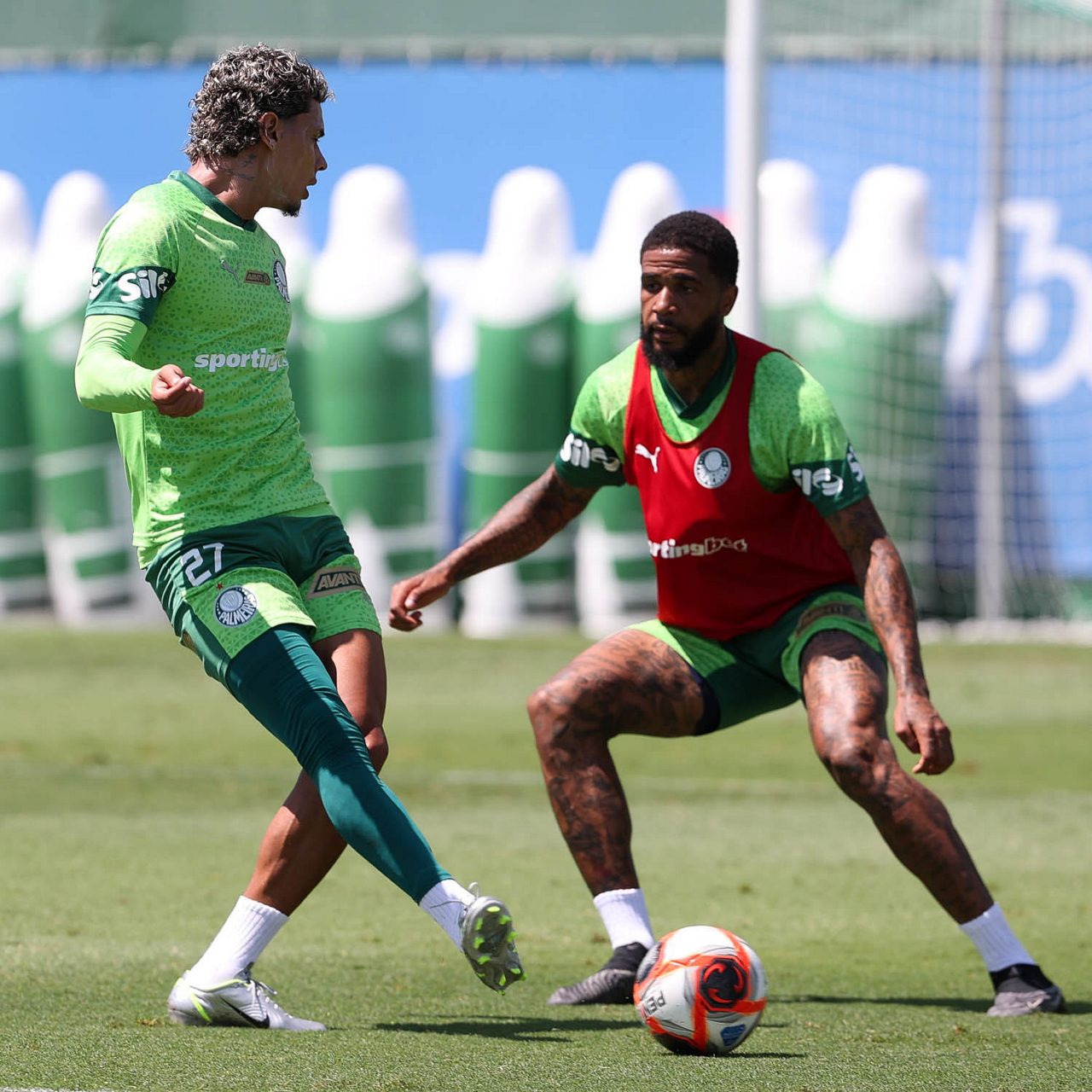 O jogador Flaco López e Emiliano Martínez (D), da SE Palmeiras, durante treinamento, na Academia de Futebol. (Foto: Cesar Greco/Palmeiras/by Canon)