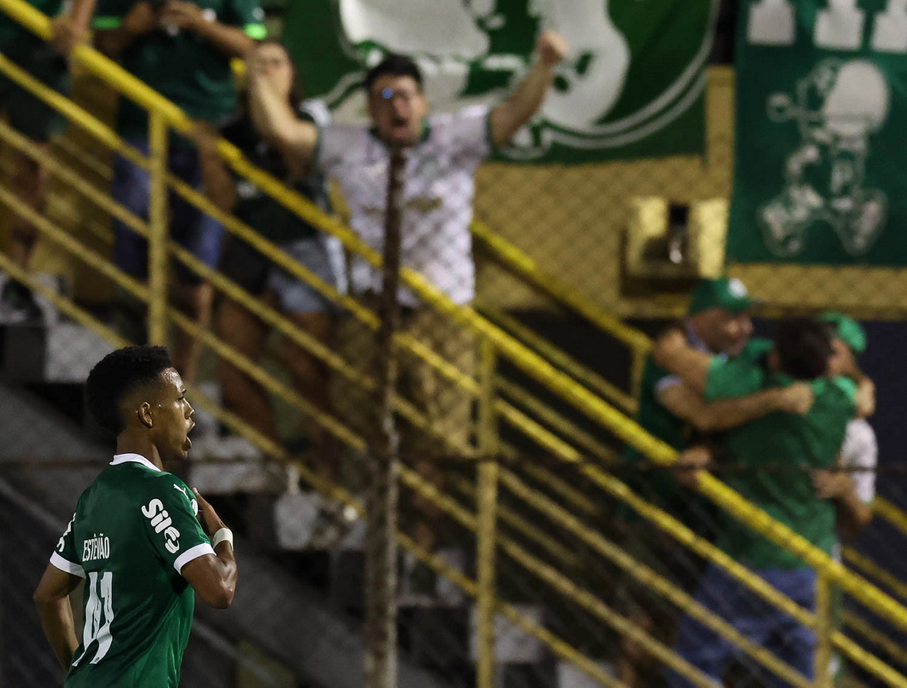 O jogador Estêvão, da SE Palmeiras, comemora seu gol contra a equipe do São Bernardo FC, durante partida válida pela quarta de final, do Campeonato Paulista, Série A1, no Estádio Municipal Primeiro de Maio. (Foto: Cesar Greco/Palmeiras/by Canon)