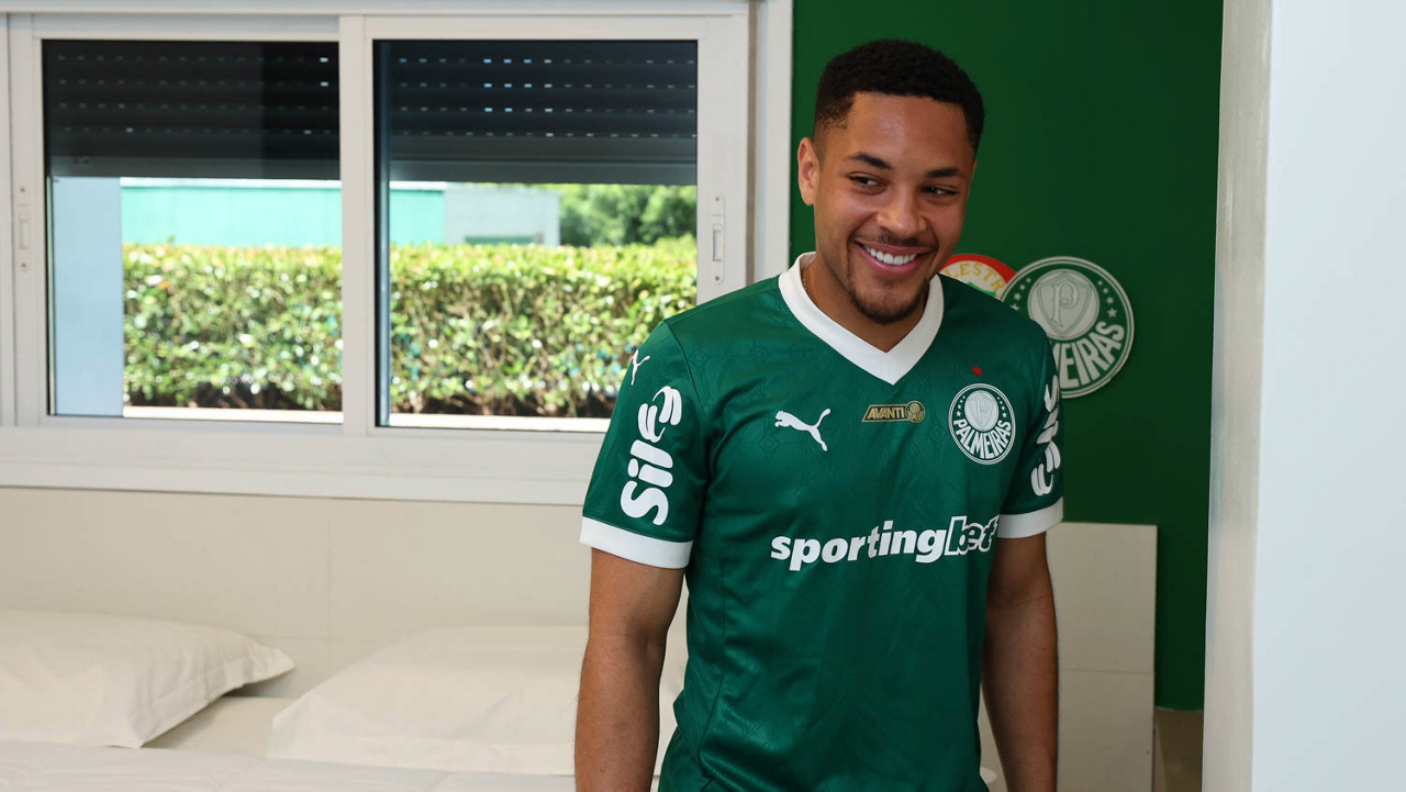 O fisioterapeuta Gustavo Kaschel, o coordenador de fisioterapia Lucas Freitas, o médico Pedro Pontin, os fisioterapeutas Marcelo Gondo e Bruno Presotto, da SE Palmeiras, recebem o mais novo atleta do clube Vitor Roque (C), na Academia de Futebol. (Foto: Cesar Greco/Palmeiras/by Canon)
