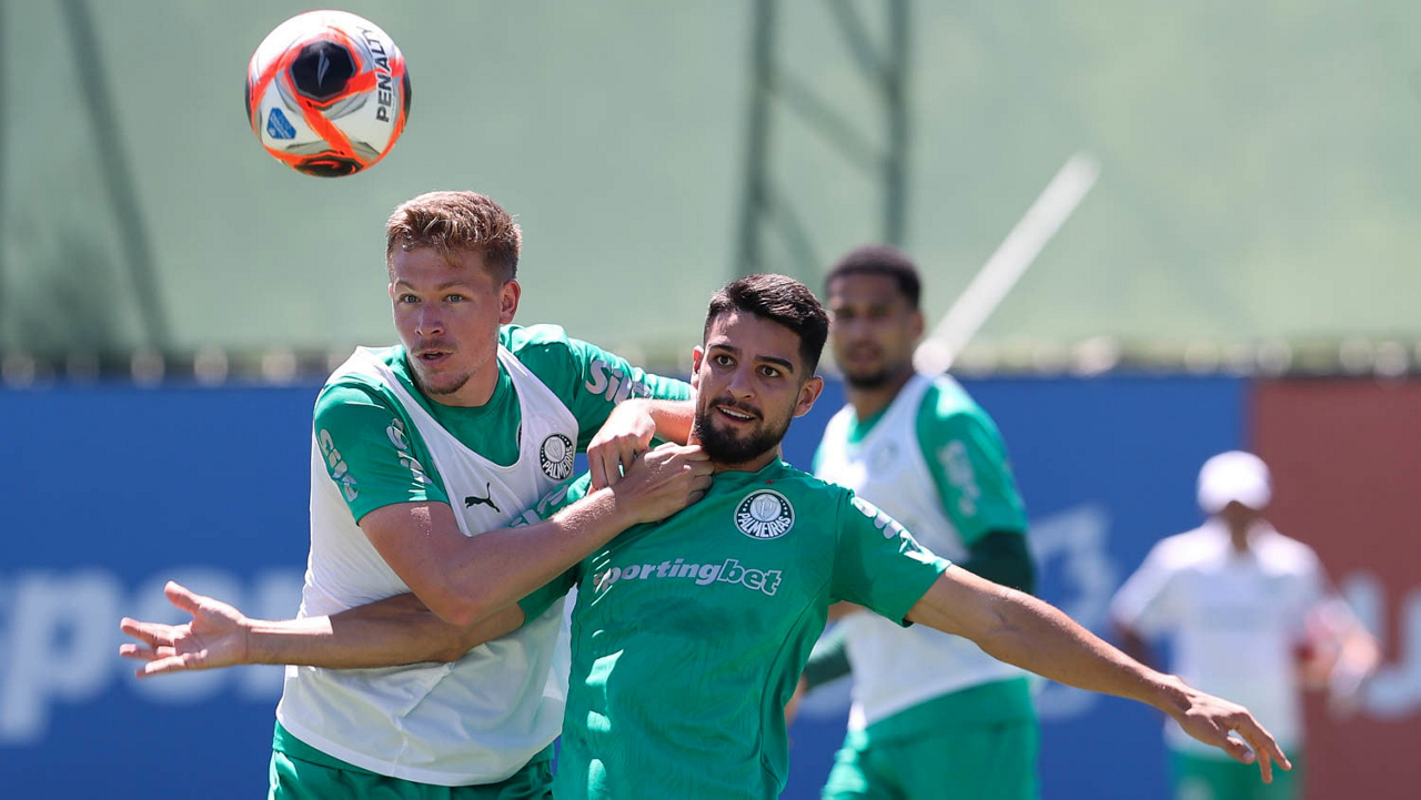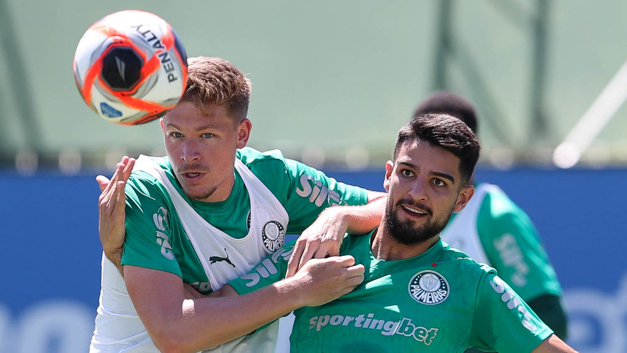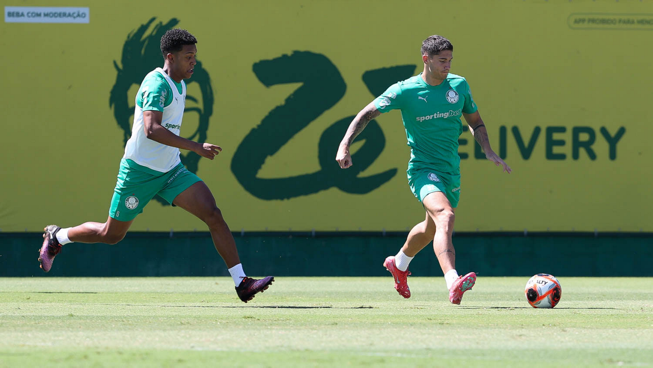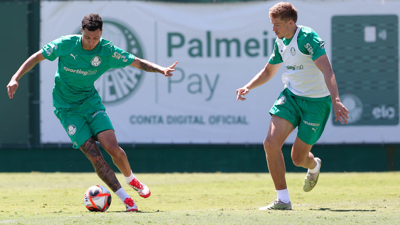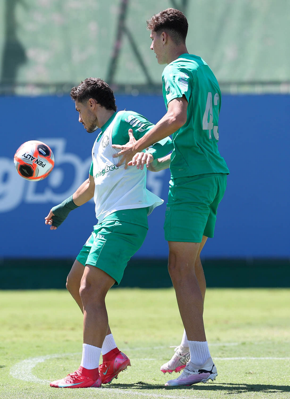 Raphael Veiga e Benedetti (D), da SE Palmeiras, durante treinamento, na Academia de Futebol. (Foto: Cesar Greco/Palmeiras/by Canon)