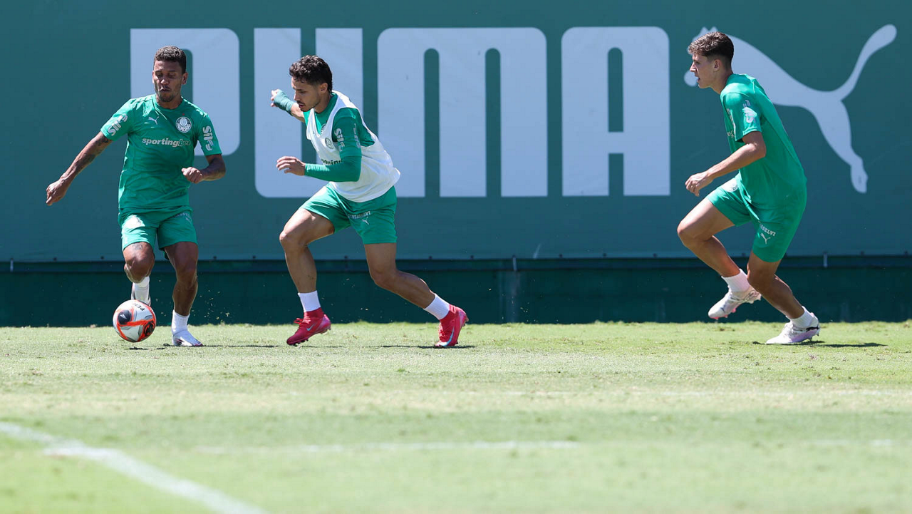 Os jogadores Marcos Rocha, Raphael Veiga e Benedetti (E/D), da SE Palmeiras, durante treinamento, na Academia de Futebol. (Foto: Cesar Greco/Palmeiras/by Canon)