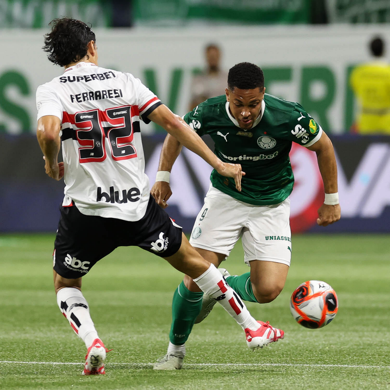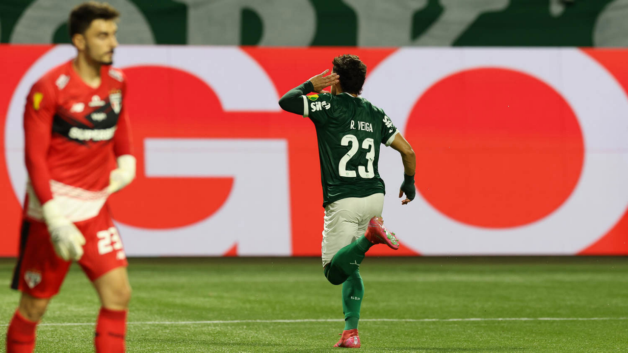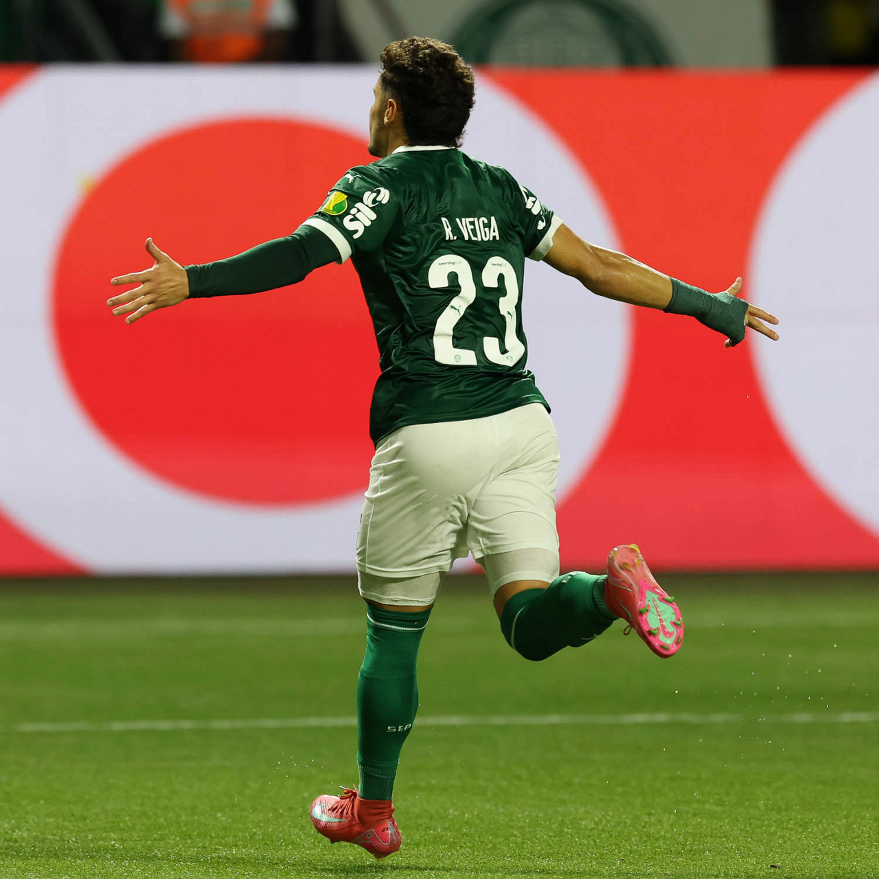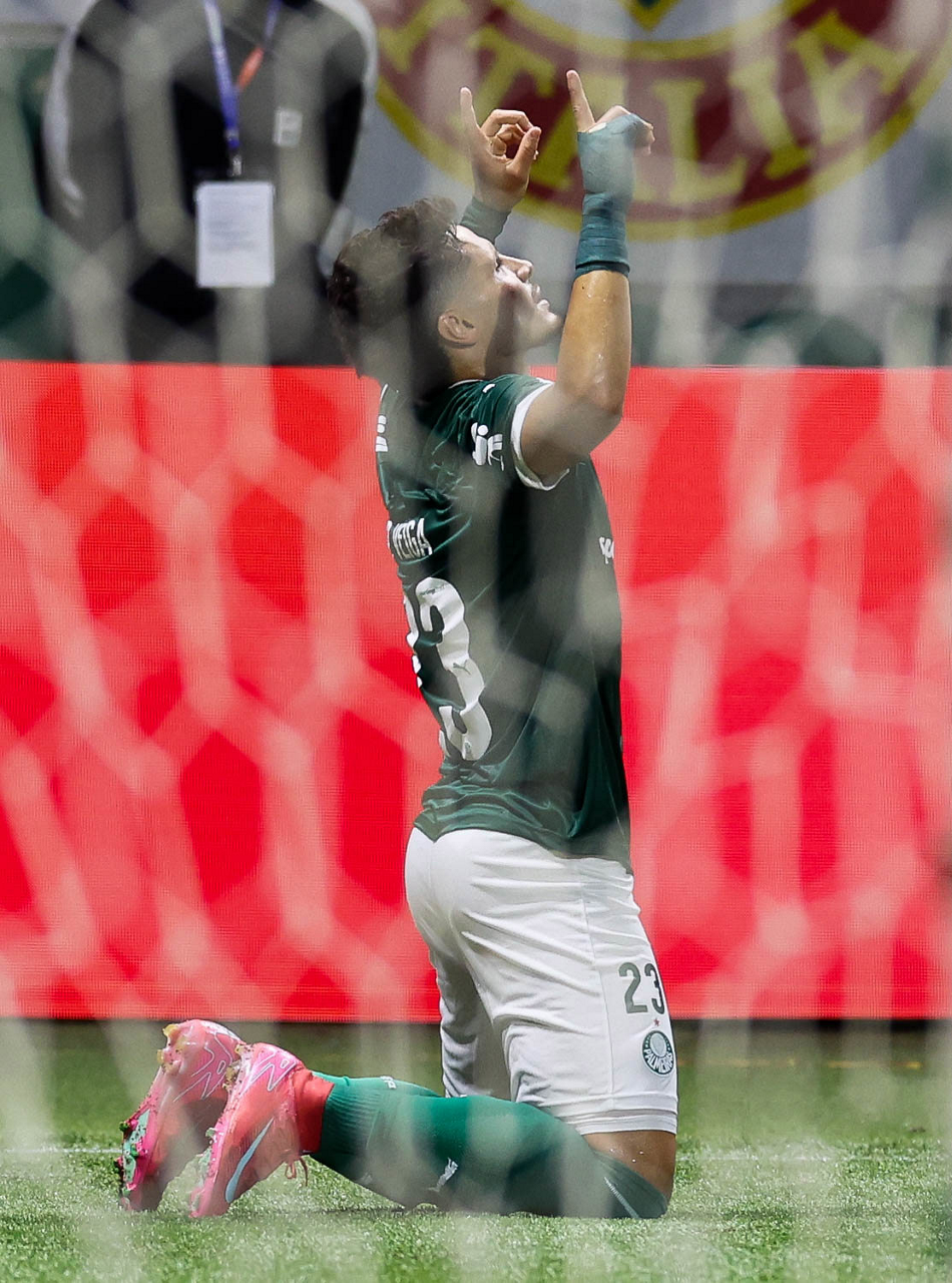 Os jogadores Vanderlan, Raphael Veiga e Flaco López (E/D), da SE Palmeiras, comemoram a classificação para a final contra equipe do São Paulo FC, após partida válida pela semifinal, do Campeonato Paulista, Série A1, na arena Allianz Parque. (Foto: Cesar Greco/Palmeiras/by Canon)