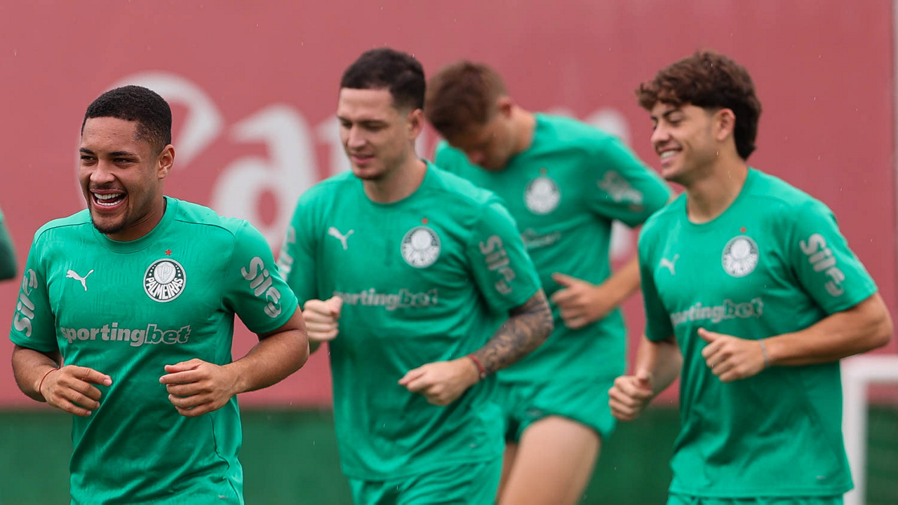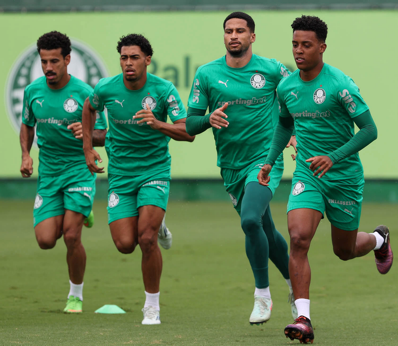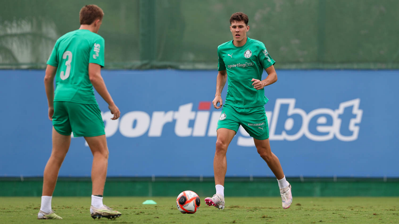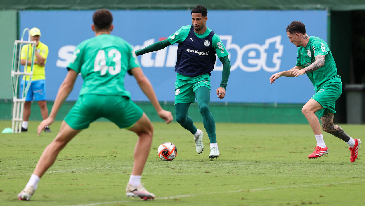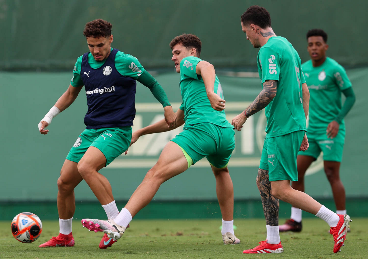 Os jogadores Raphael Veiga, Benedetti e Anibal Moreno (E/D), da SE Palmeiras, durante treinamento, na Academia de Futebol. (Foto: Cesar Greco/Palmeiras/by Canon)