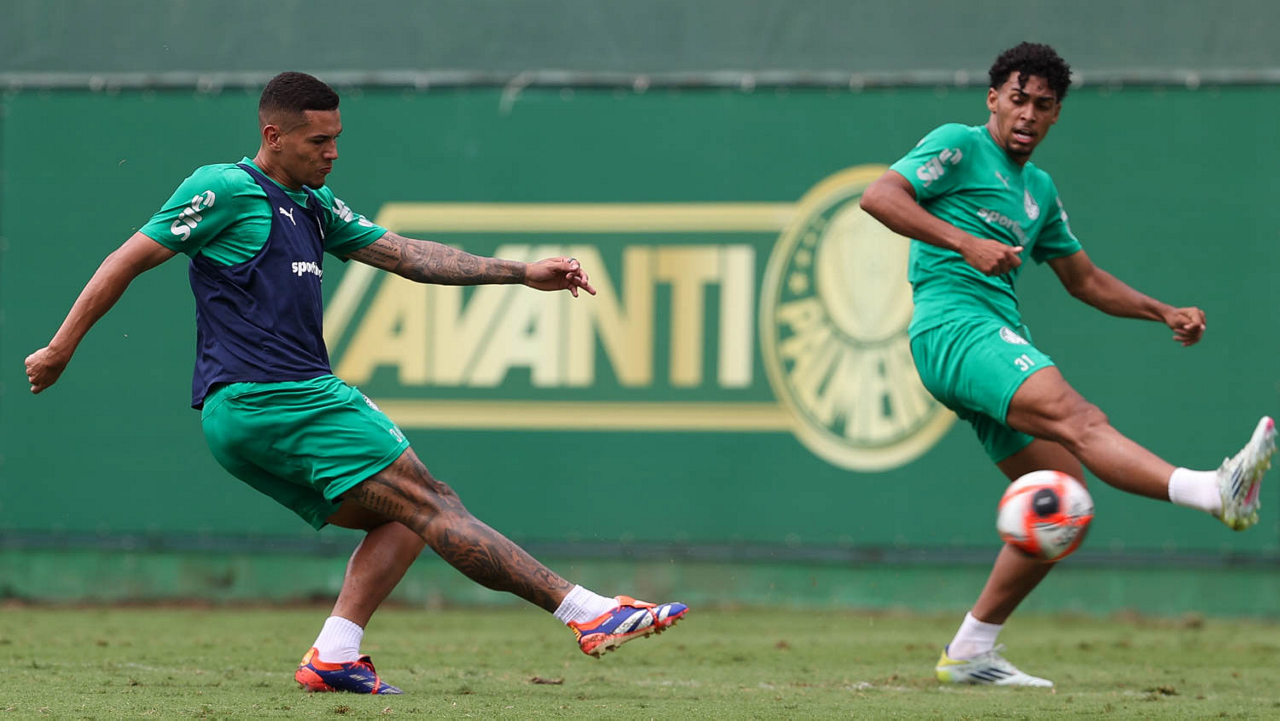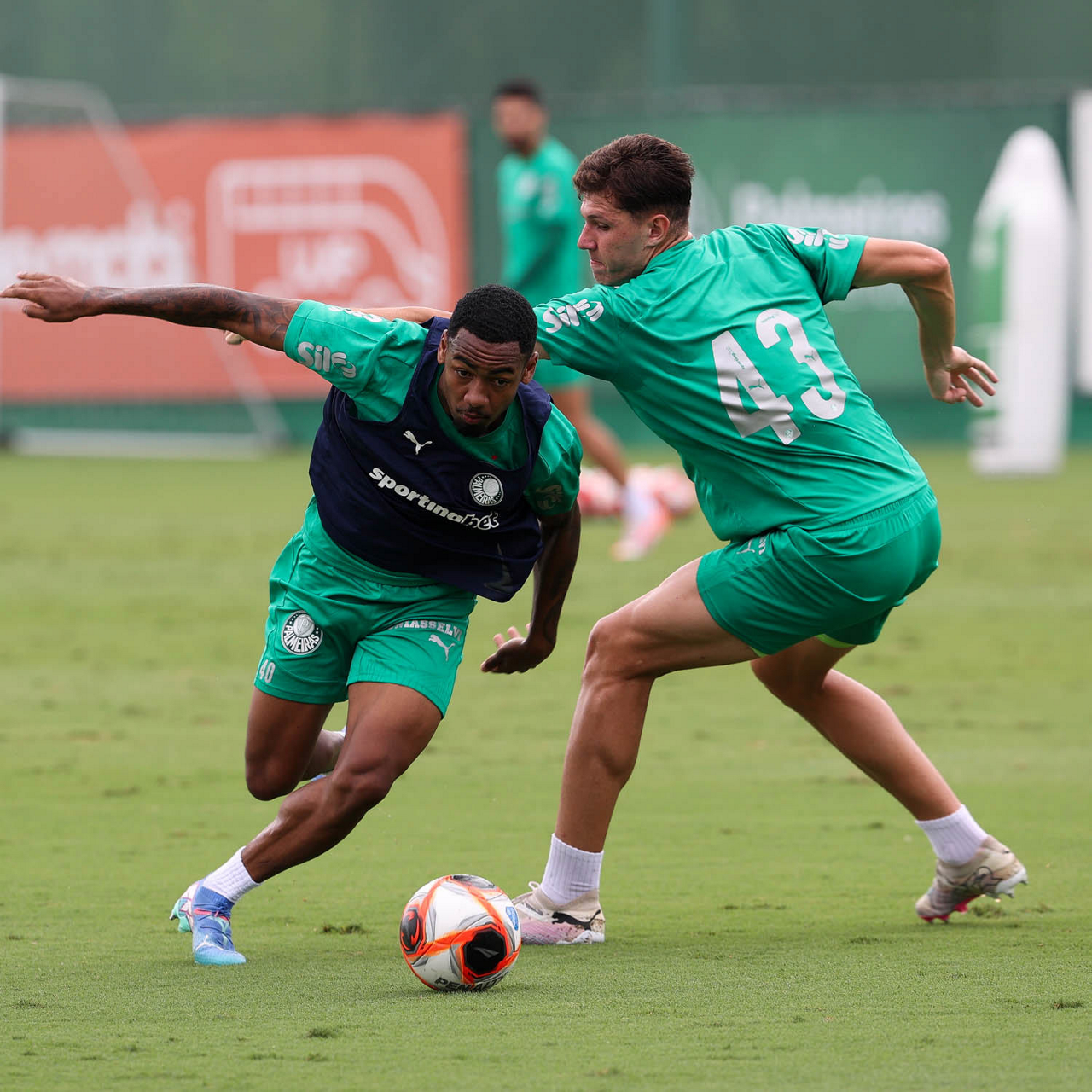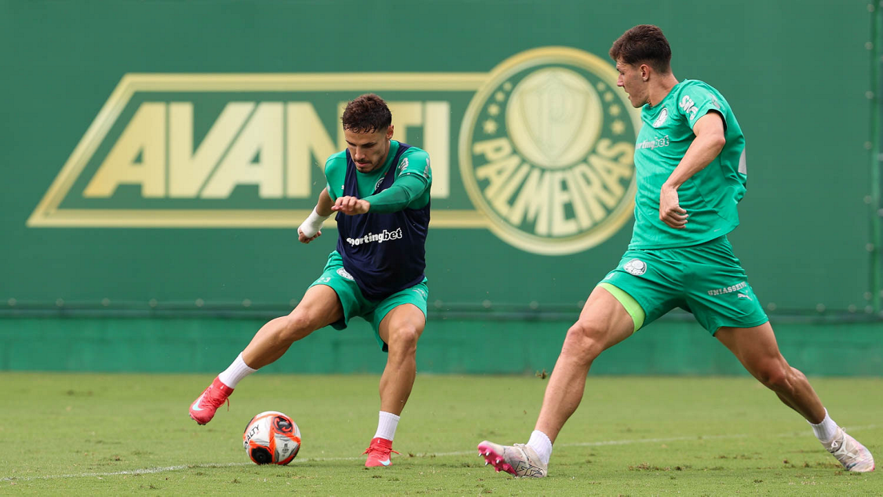 Os jogadores Raphael Veiga e Benedetti (D), da SE Palmeiras, durante treinamento, na Academia de Futebol. (Foto: Cesar Greco/Palmeiras/by Canon)