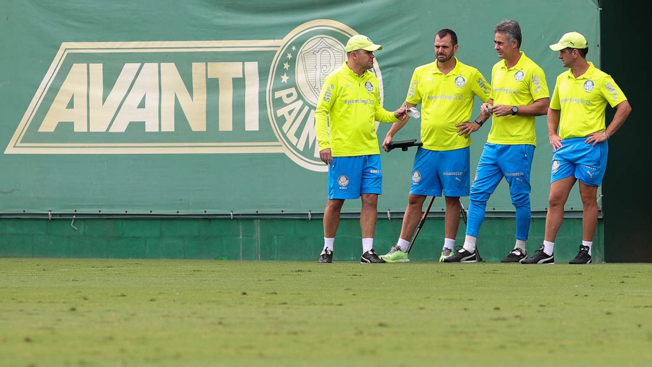 O auxiliar técnico Andrey Lopes, o fisiologista Vinicius Ponzio e os preparadores físico Ângelo Alves e Marco Aurélio (E/D), da SE Palmeiras, durante treinamento, na Academia de Futebol. (Foto: Cesar Greco/Palmeiras/by Canon)