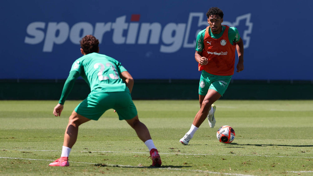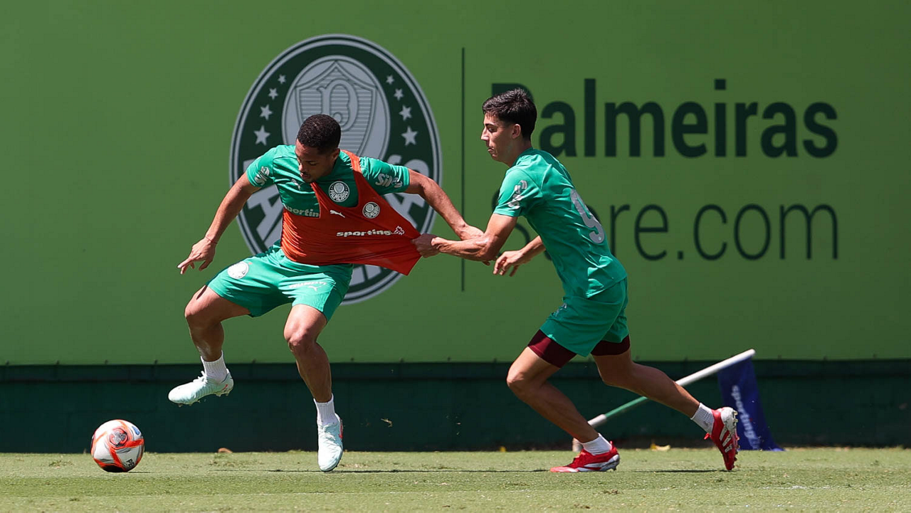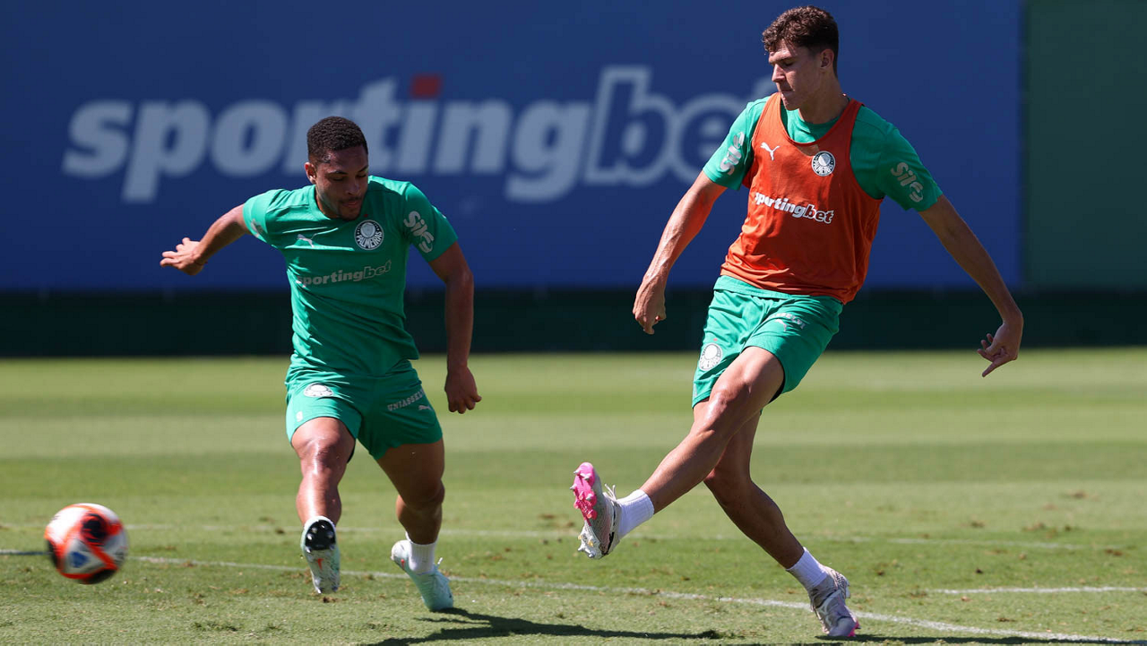 Os jogadores Vanderlan e Vitor Roque (D), da SE Palmeiras, durante treinamento, na Academia de Futebol. (Foto: Cesar Greco/Palmeiras/by Canon)