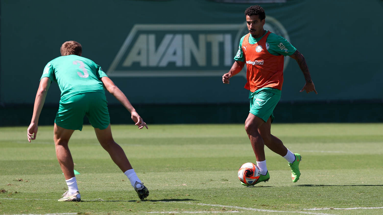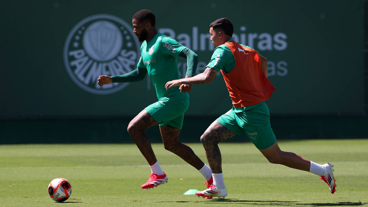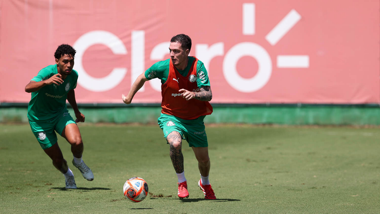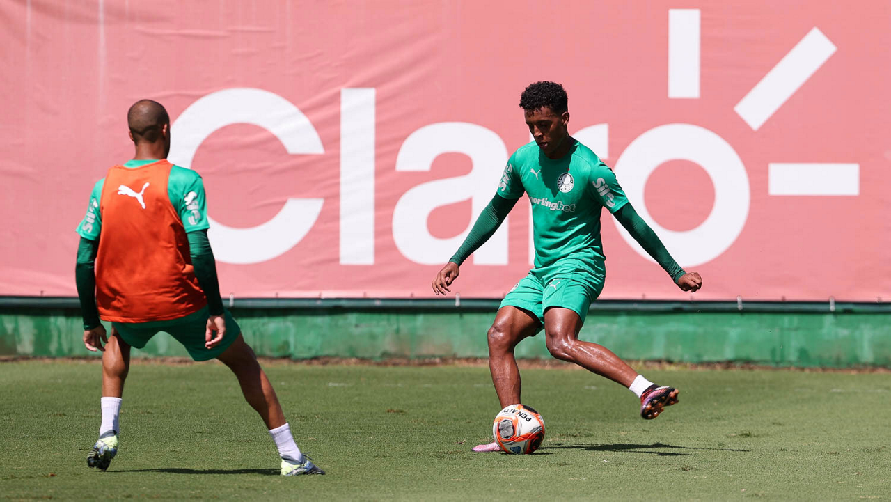 Os jogadores Vanderlan e Vitor Roque (D), da SE Palmeiras, durante treinamento, na Academia de Futebol. (Foto: Cesar Greco/Palmeiras/by Canon)
