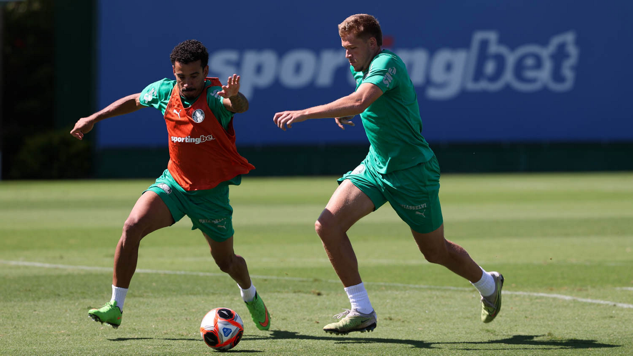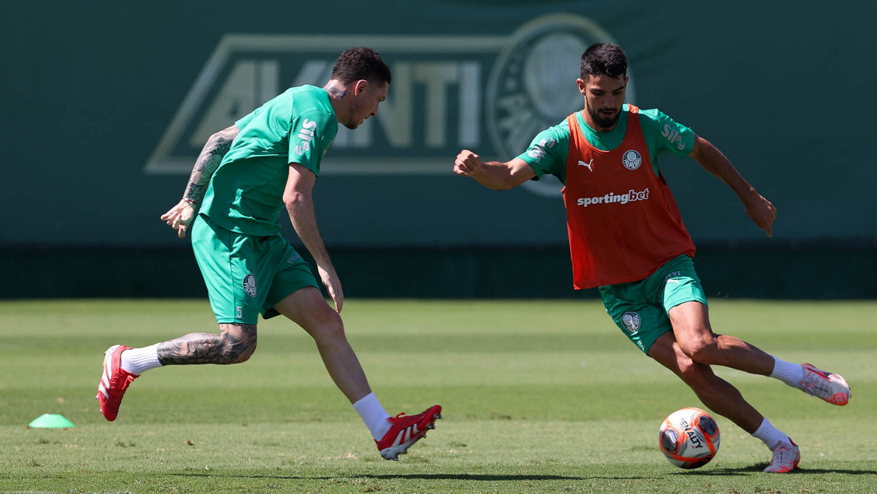 Os jogadores Lucas Evangelista e Bruno Fuchs (D), da SE Palmeiras, durante treinamento, na Academia de Futebol. (Foto: Cesar Greco/Palmeiras/by Canon)