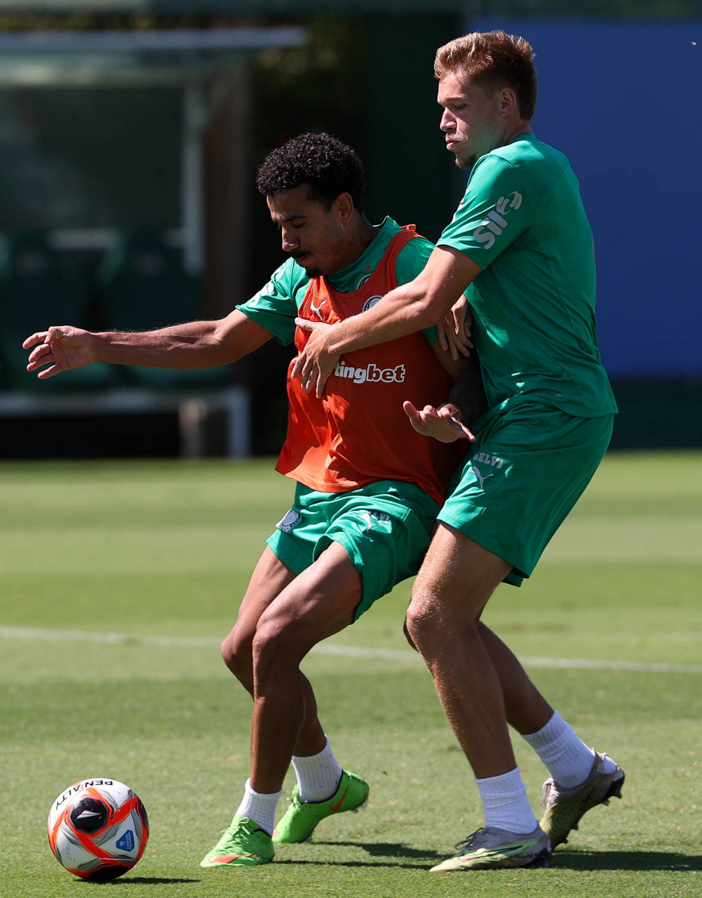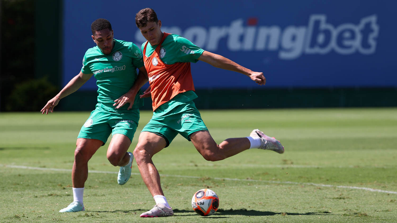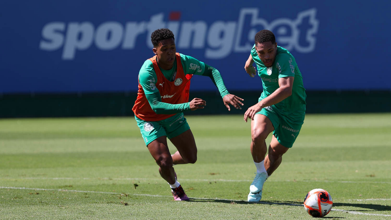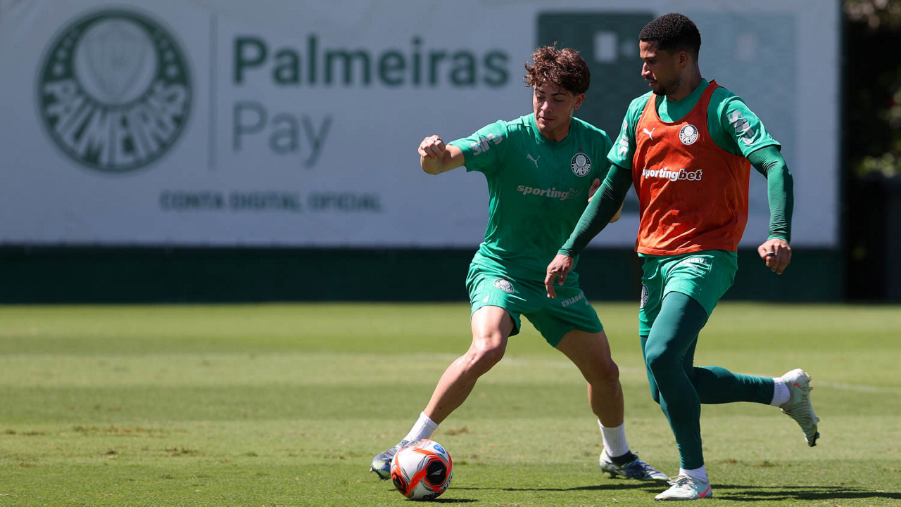 Os jogadores Vitor Roque e Benedetti (D), da SE Palmeiras, durante treinamento, na Academia de Futebol. (Foto: Cesar Greco/Palmeiras/by Canon)