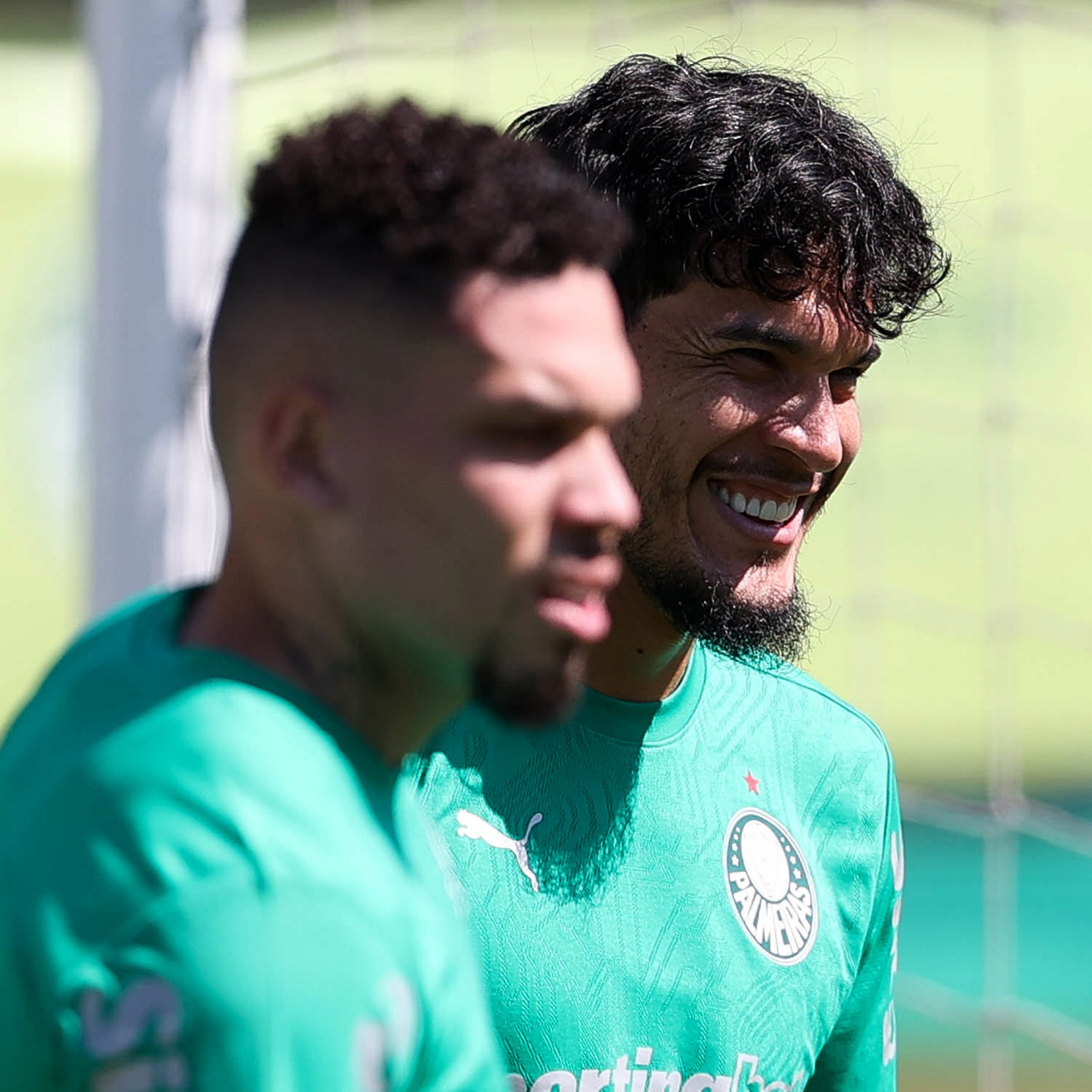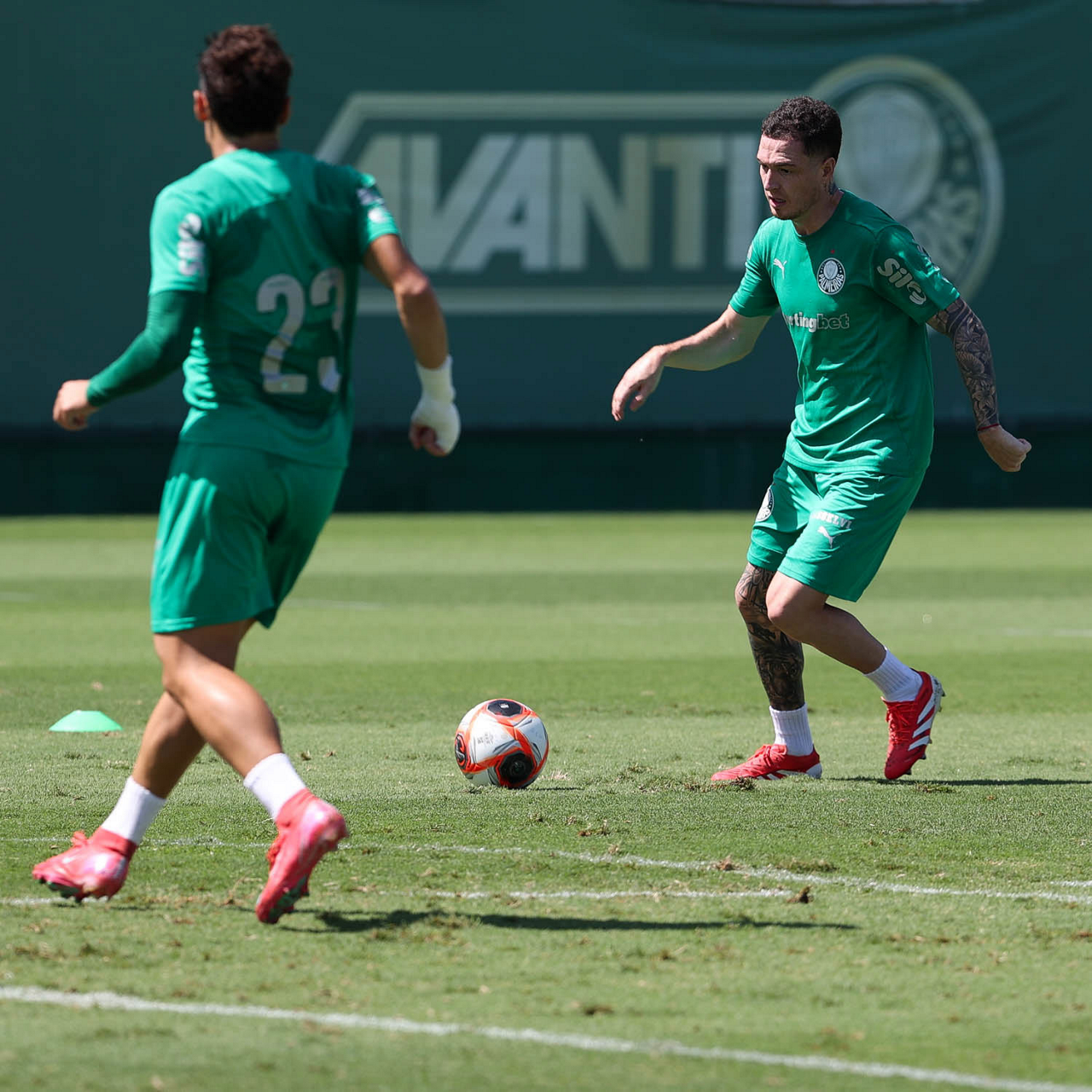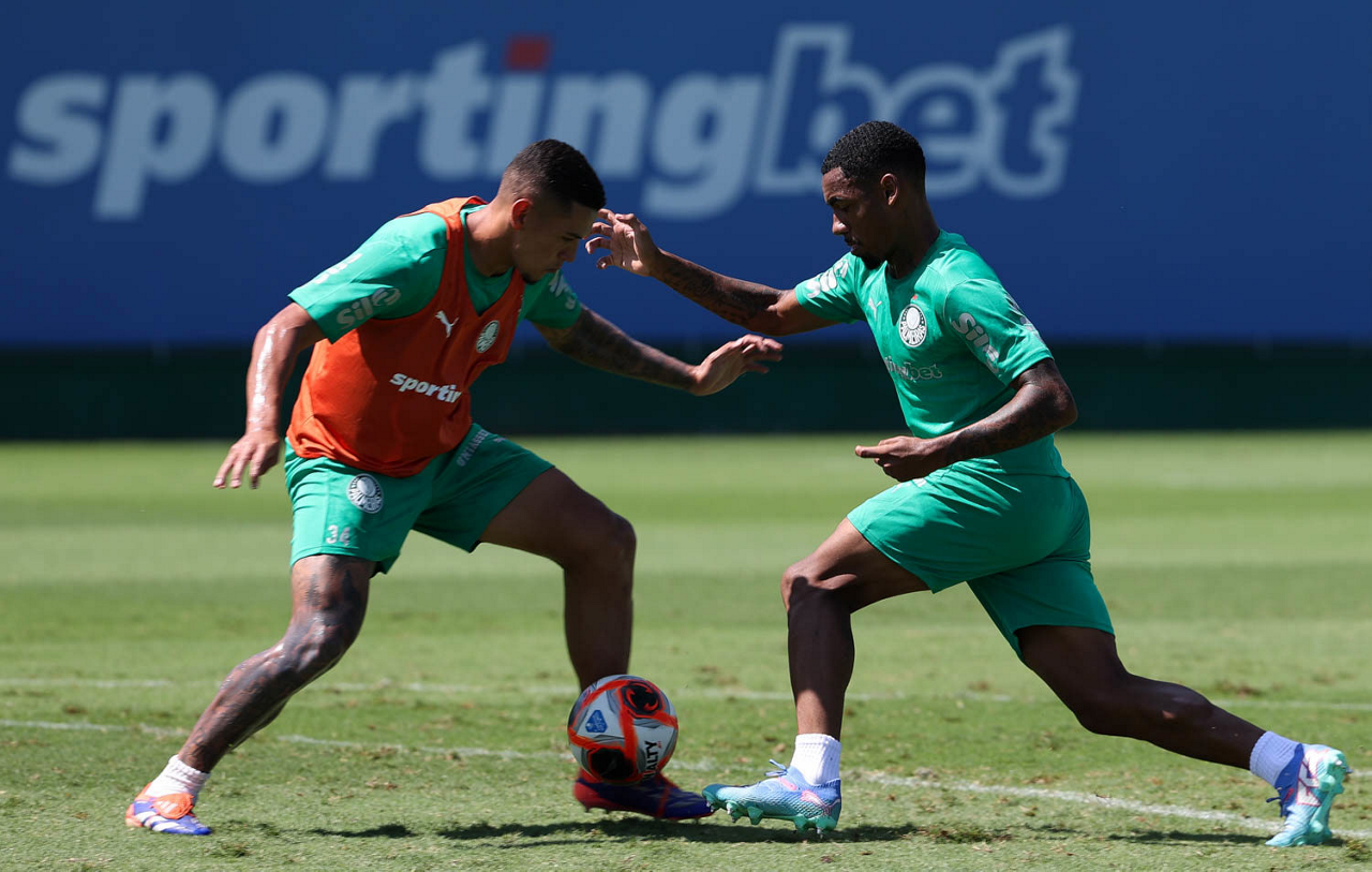Os jogadores Vitor Roque e Benedetti (D), da SE Palmeiras, durante treinamento, na Academia de Futebol. (Foto: Cesar Greco/Palmeiras/by Canon)