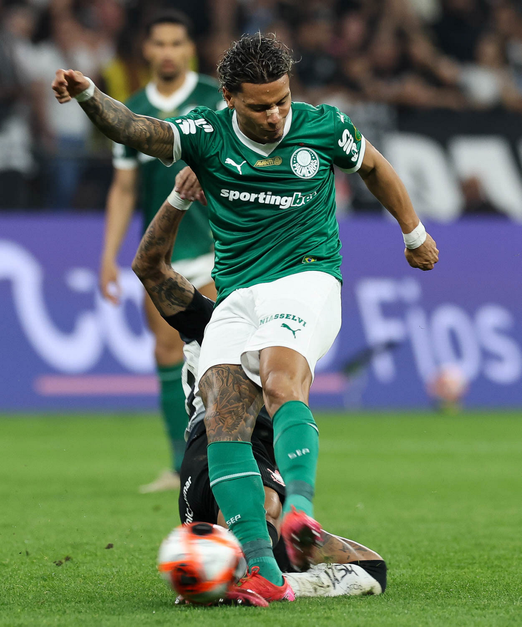 O jogador Richard Ríos, da SE Palmeiras, disputa bola com o jogador do SC Corinthians P, durante partida válida pelas finais, do Campeonato Paulista, Série A1, na Neo Química Arena. (Foto: Cesar Greco/Palmeiras/by Canon)