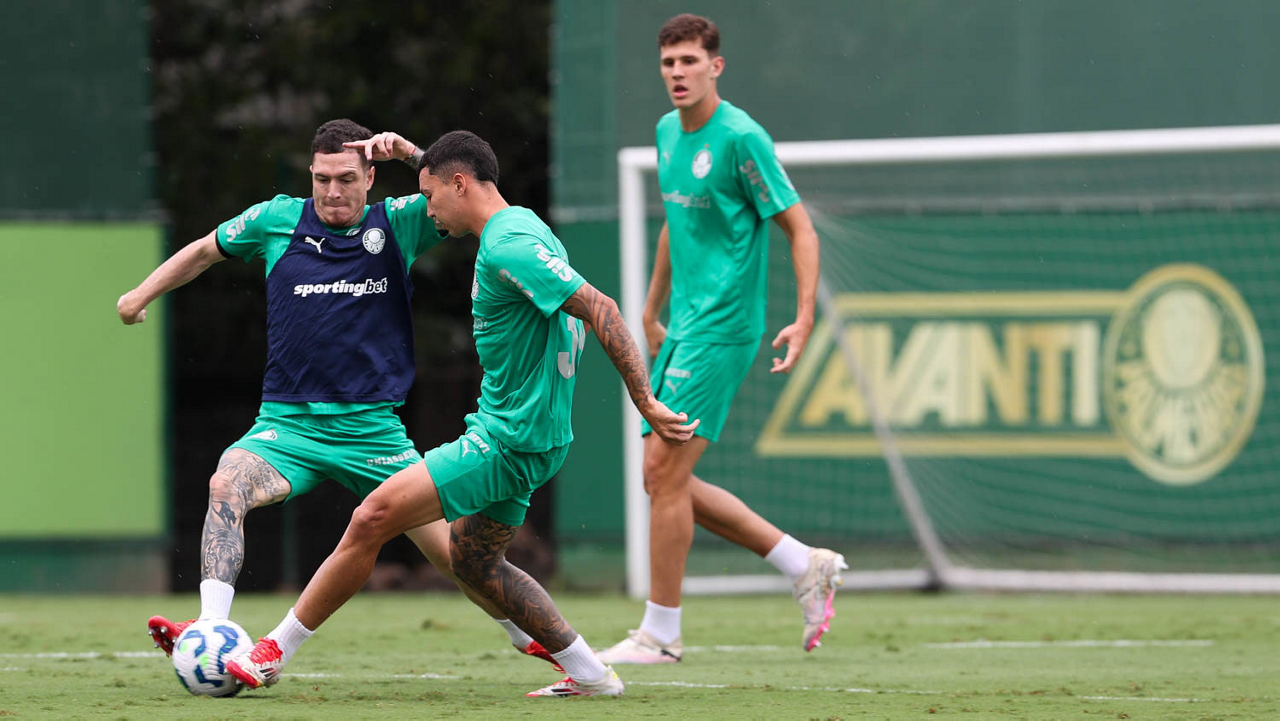 O jogador Paulinho (E), da SE Palmeiras, durante treinamento, na Academia de Futebol. (Foto: Cesar Greco/Palmeiras/by Canon)
