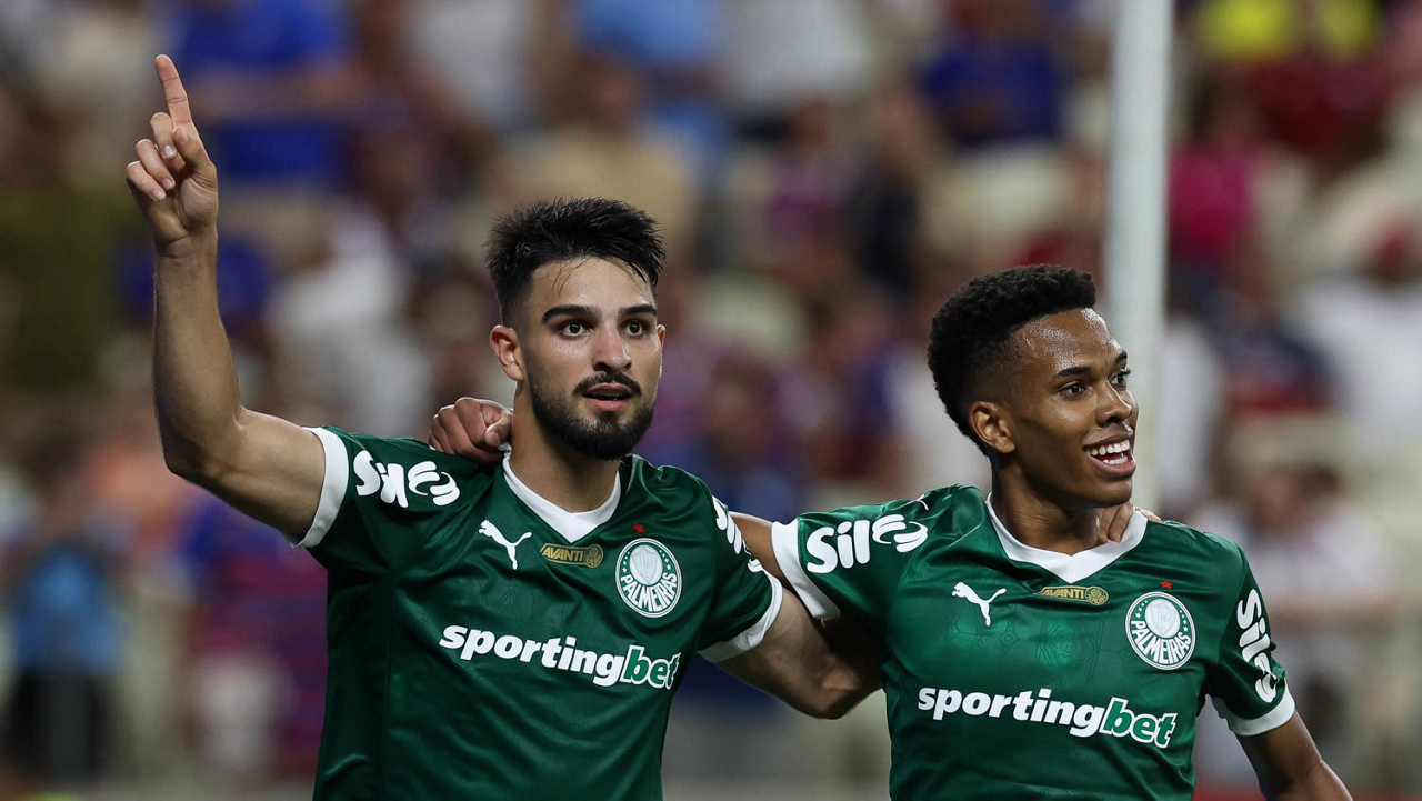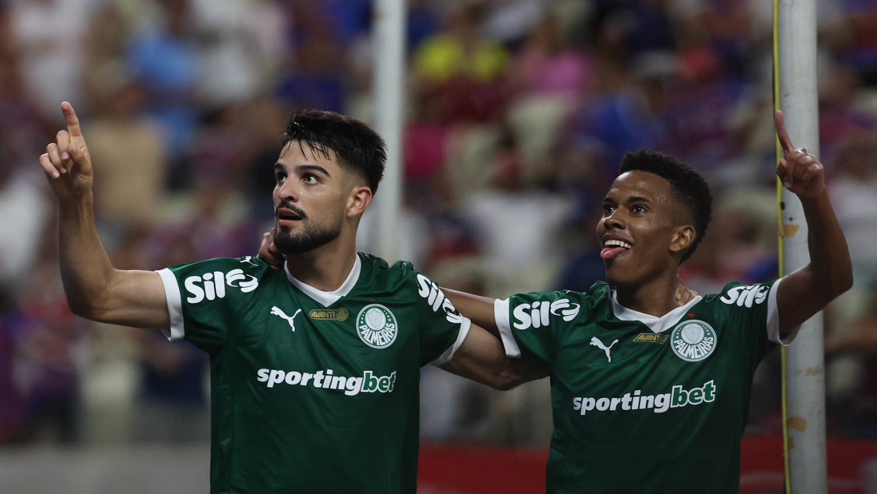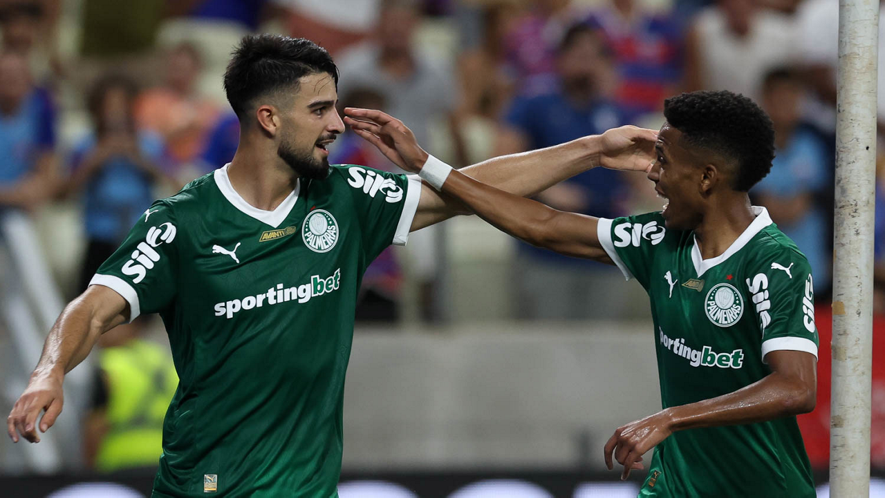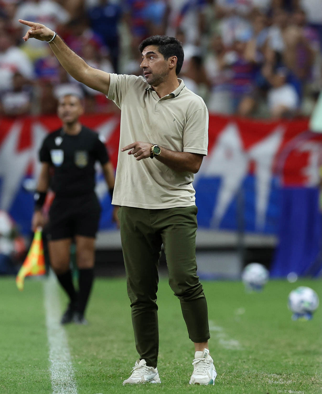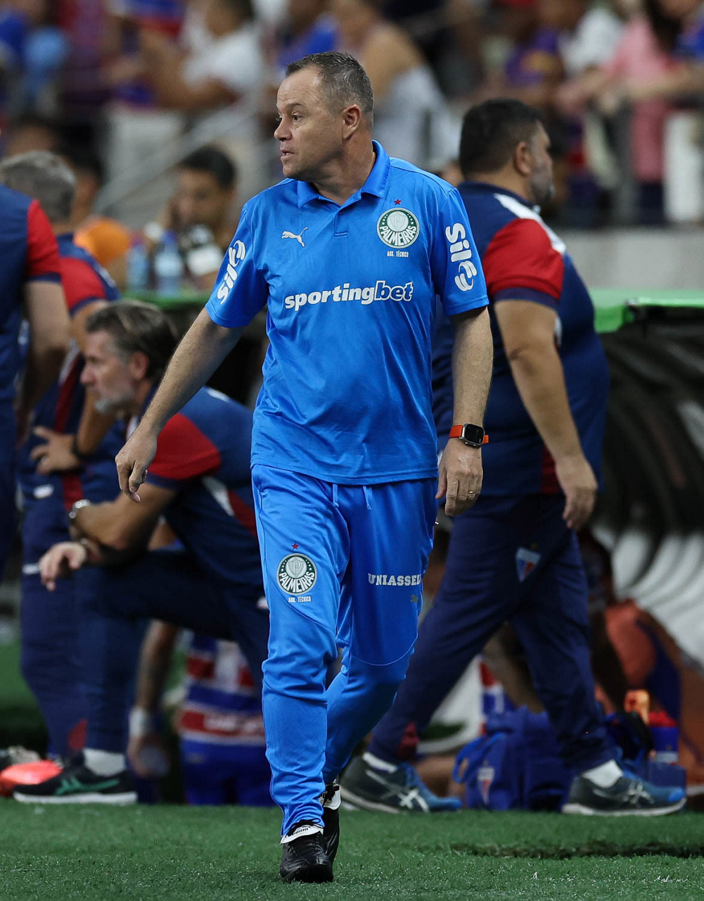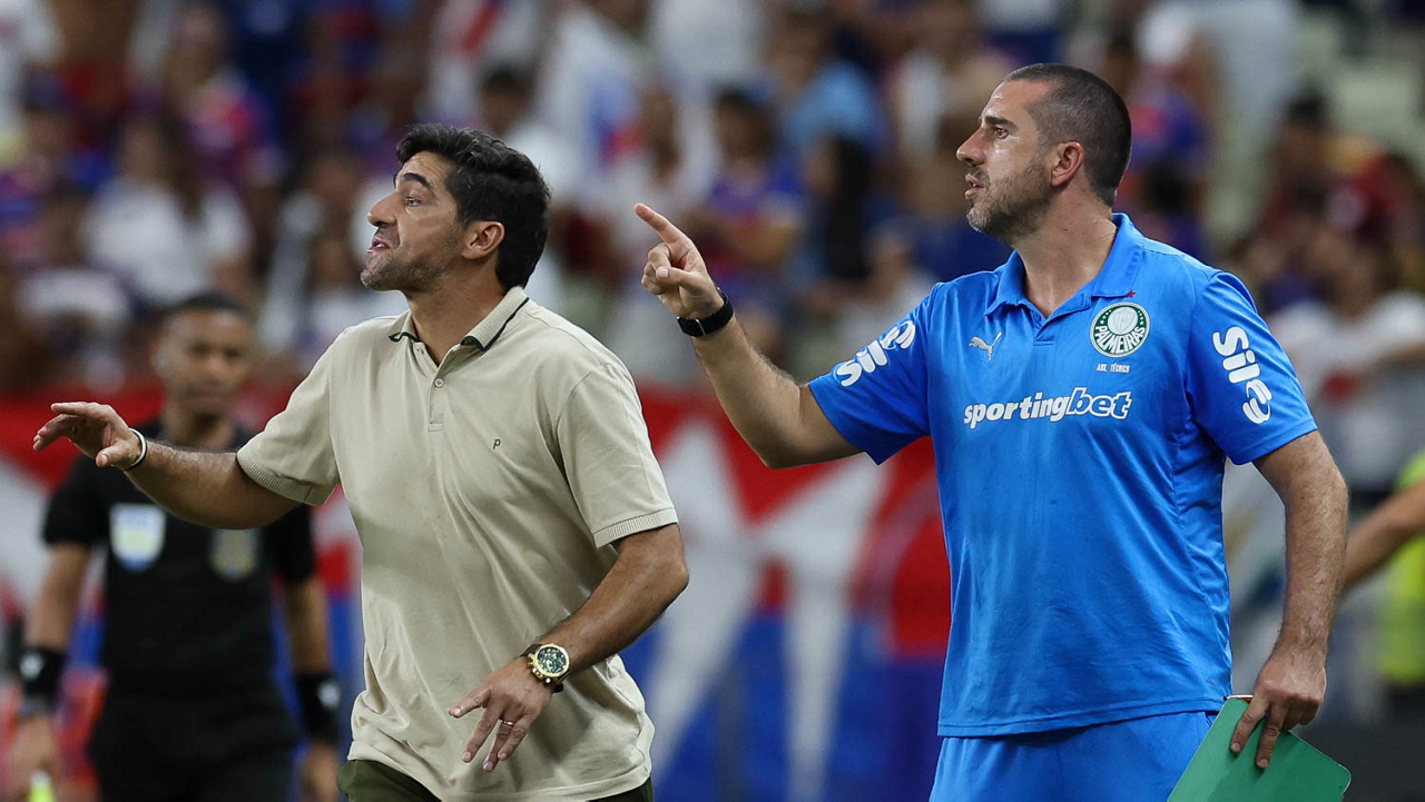 O técnico Abel Ferreira e o preparador físico João Martins (D), da SE Palmeiras, em jogo contra a equipe do Fortaleza EC, durante partida válida pela quinta rodada, do Campeonato Brasileiro, Série A, na Arena Castelão. (Foto: Cesar Greco/Palmeiras/by Canon)
