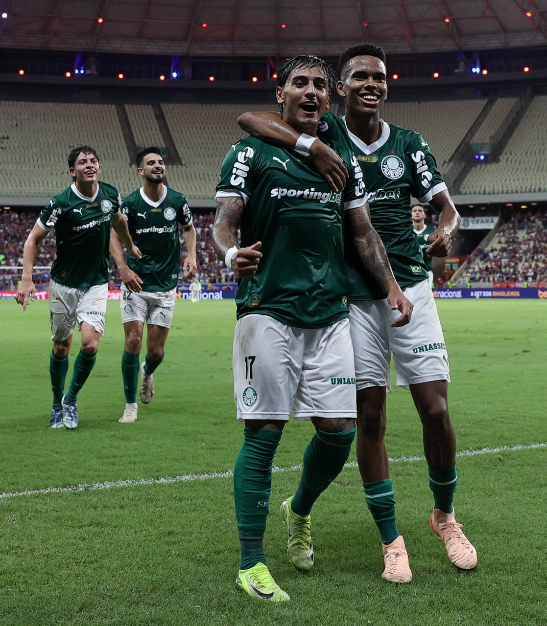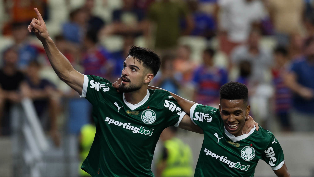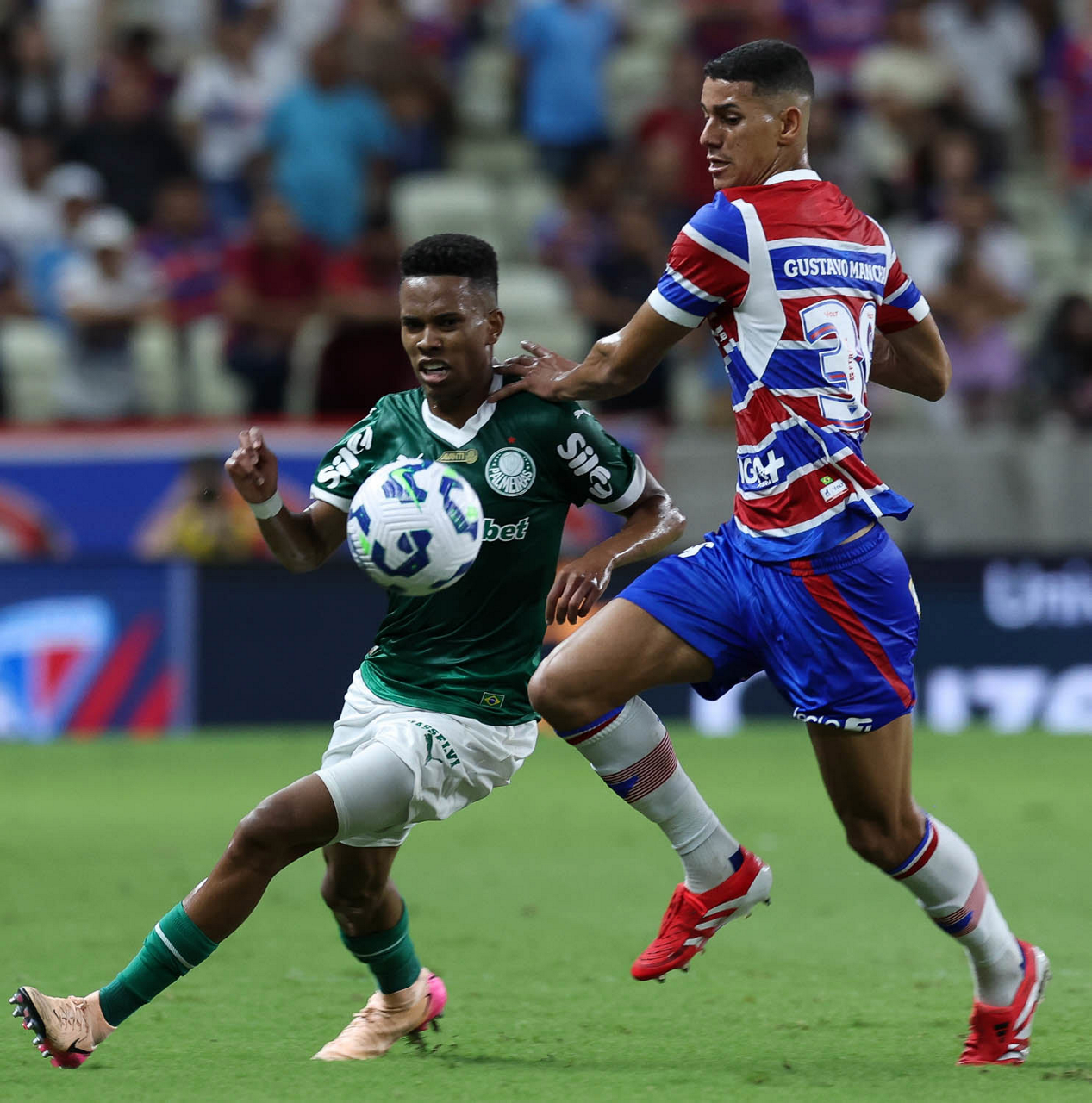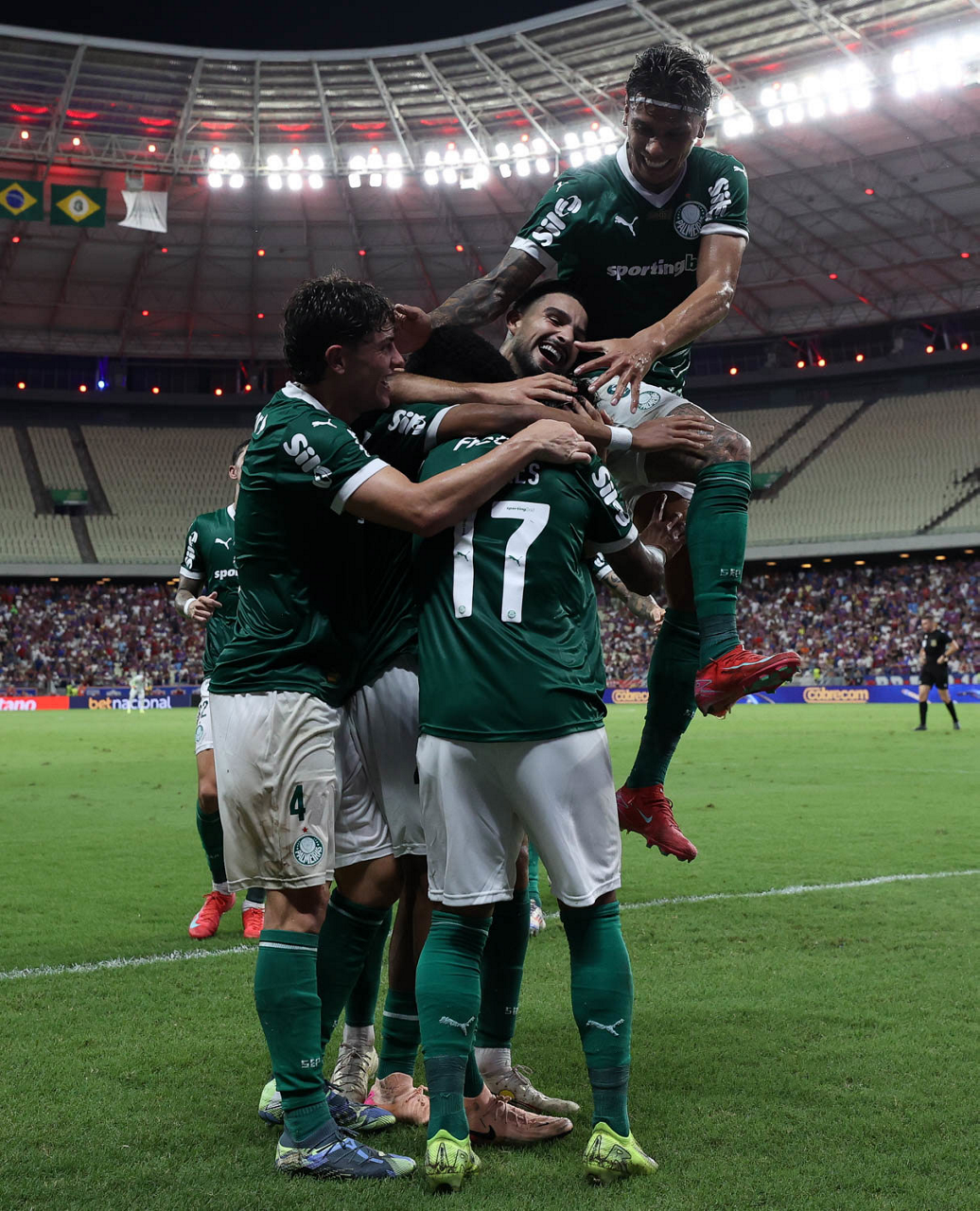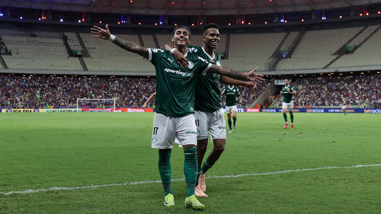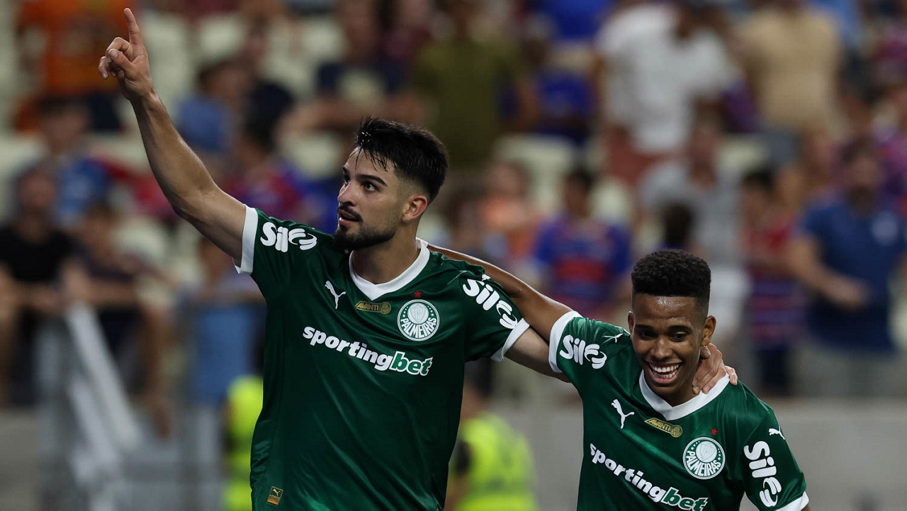 O técnico Abel Ferreira e o preparador físico João Martins (D), da SE Palmeiras, em jogo contra a equipe do Fortaleza EC, durante partida válida pela quinta rodada, do Campeonato Brasileiro, Série A, na Arena Castelão. (Foto: Cesar Greco/Palmeiras/by Canon)
