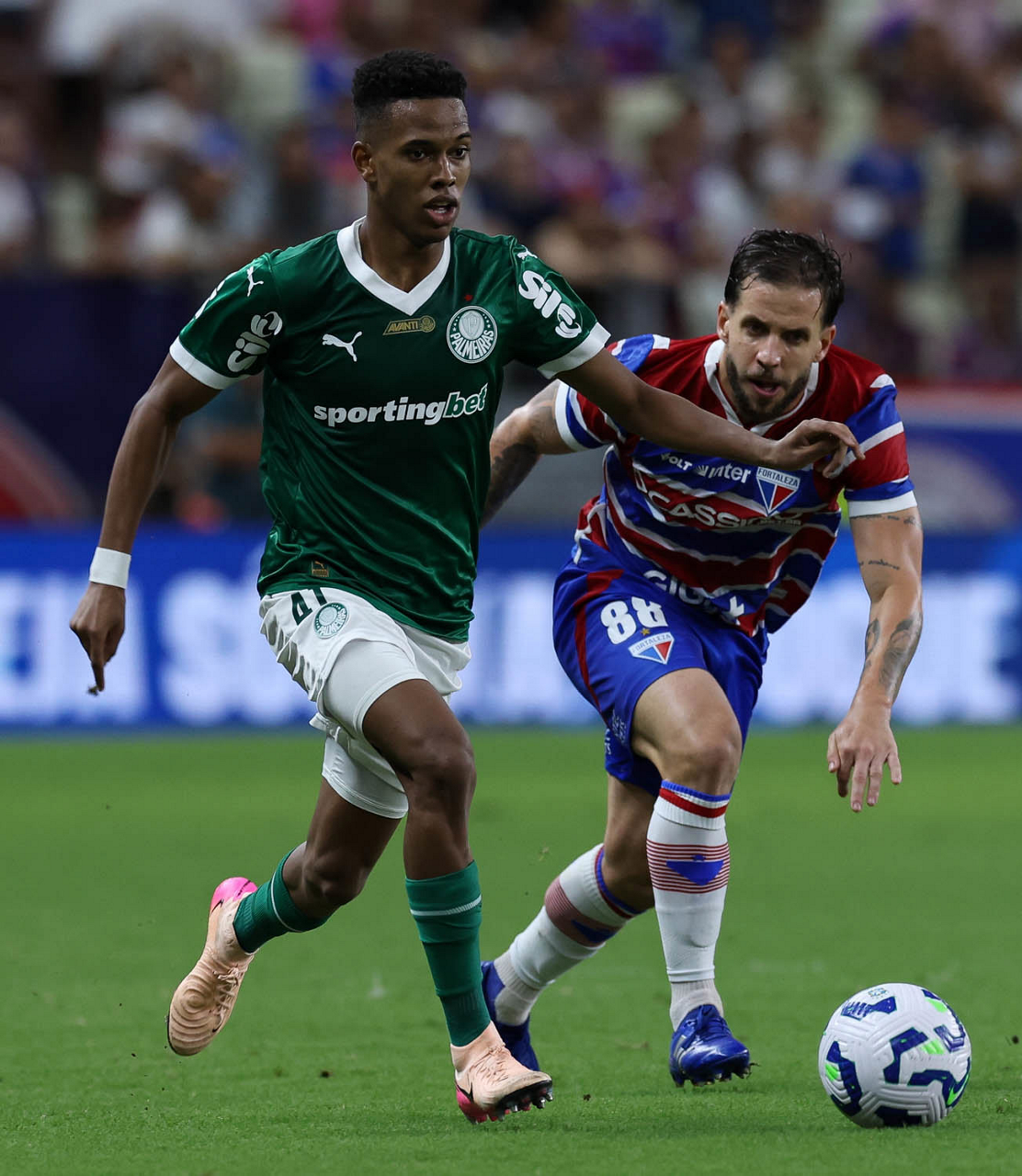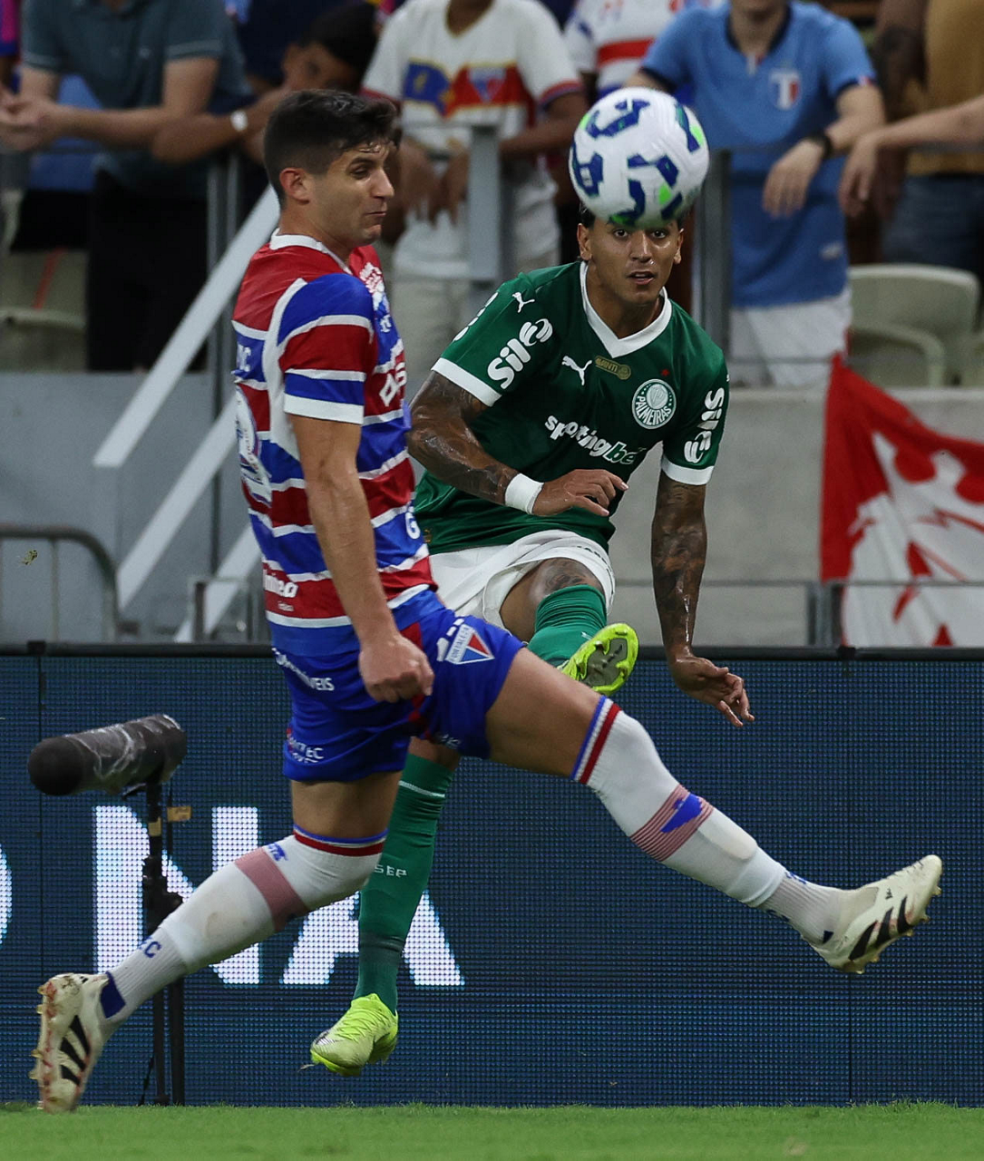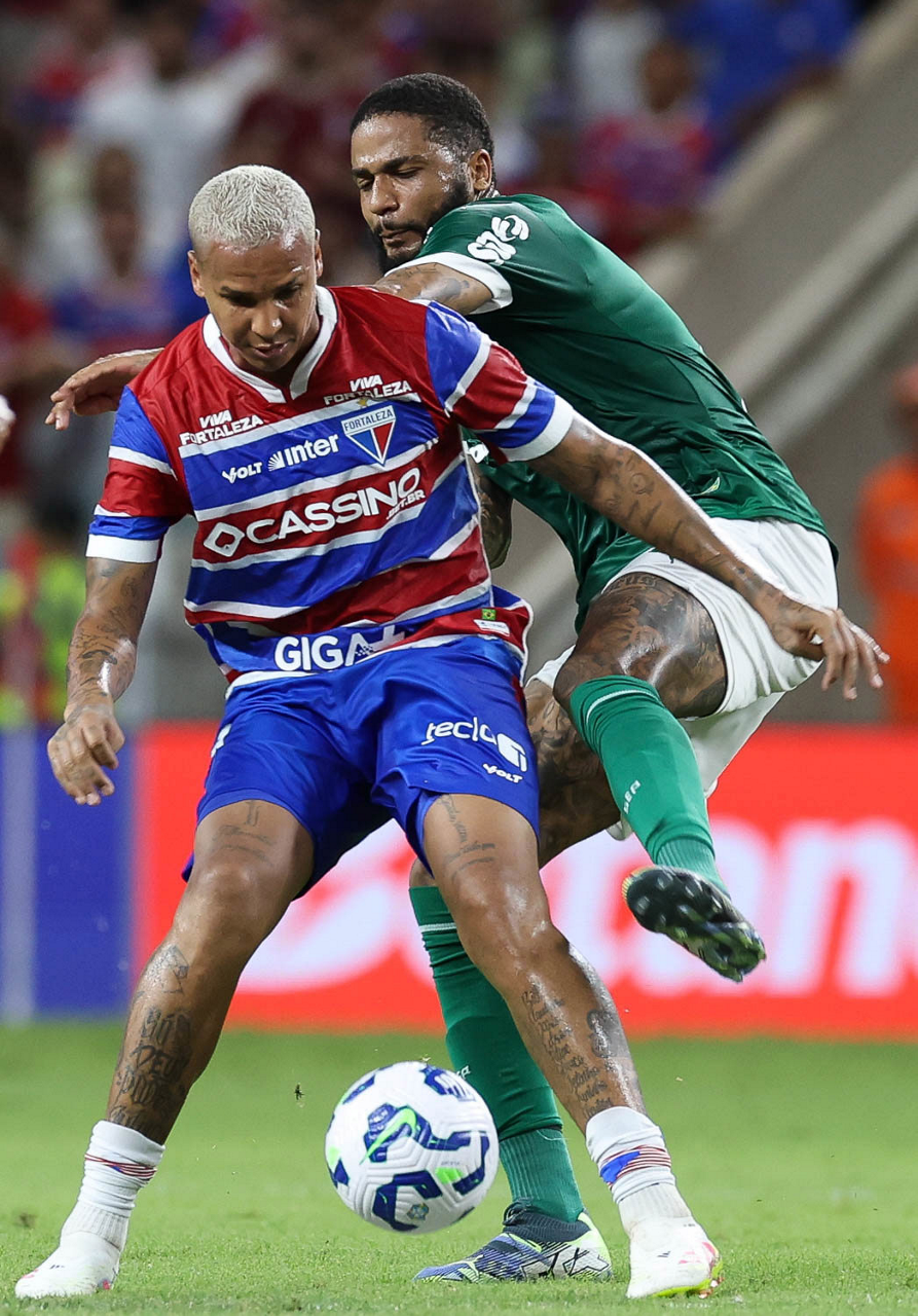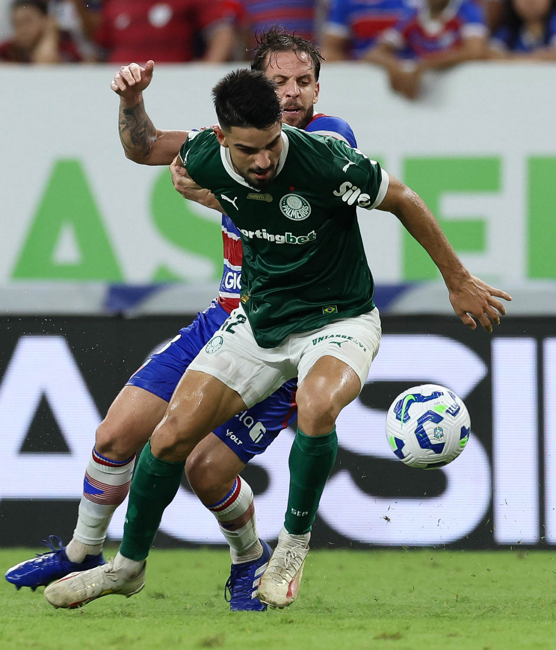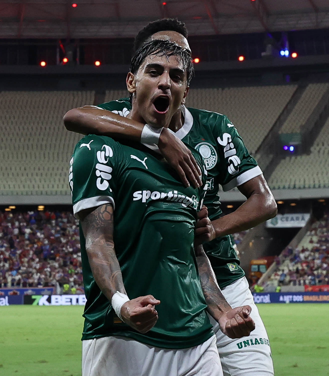 O técnico Abel Ferreira e o preparador físico João Martins (D), da SE Palmeiras, em jogo contra a equipe do Fortaleza EC, durante partida válida pela quinta rodada, do Campeonato Brasileiro, Série A, na Arena Castelão. (Foto: Cesar Greco/Palmeiras/by Canon)