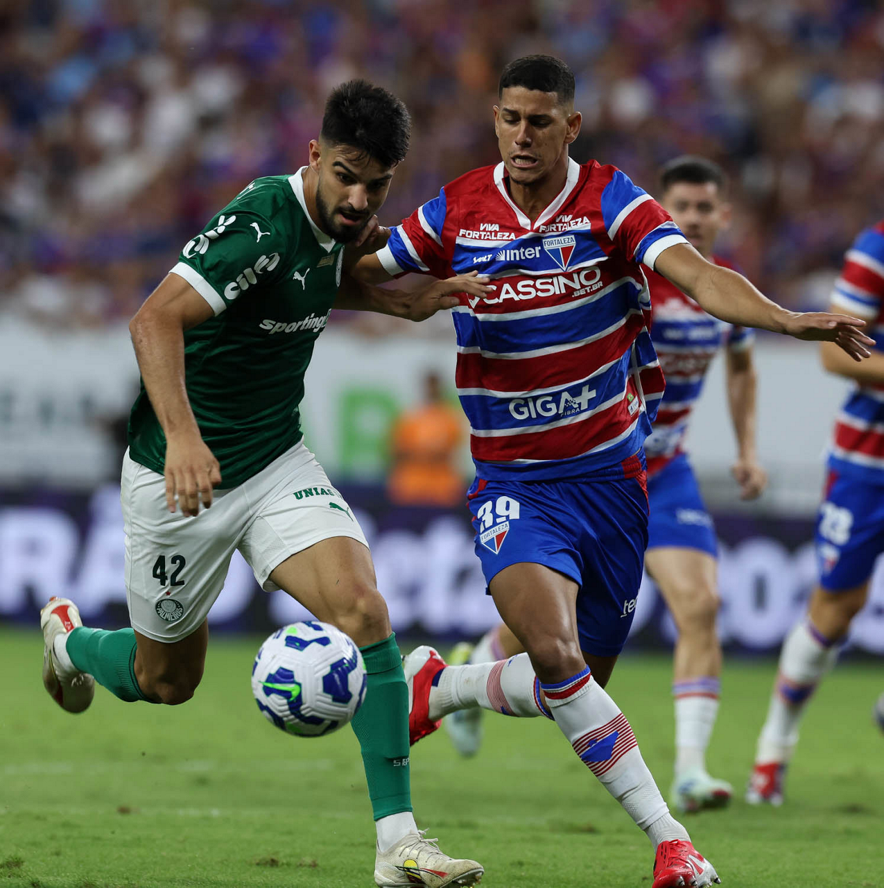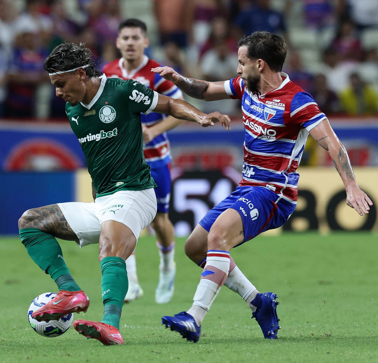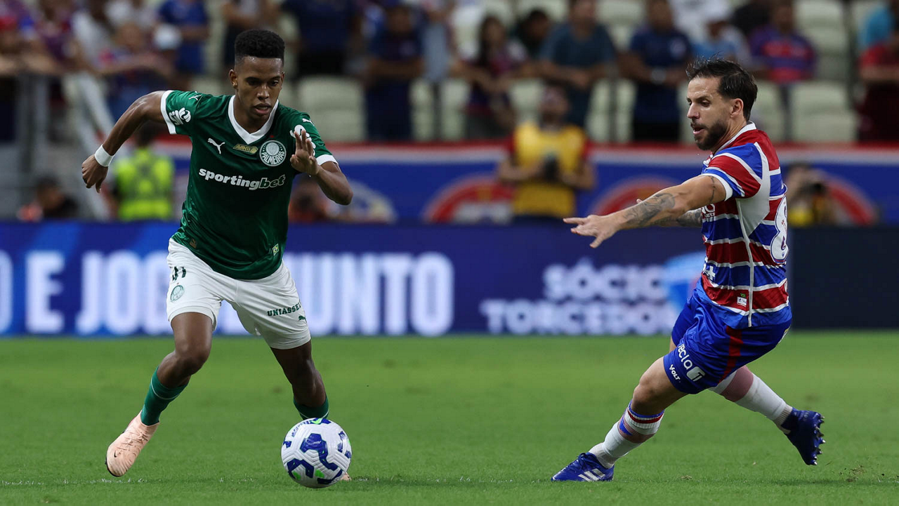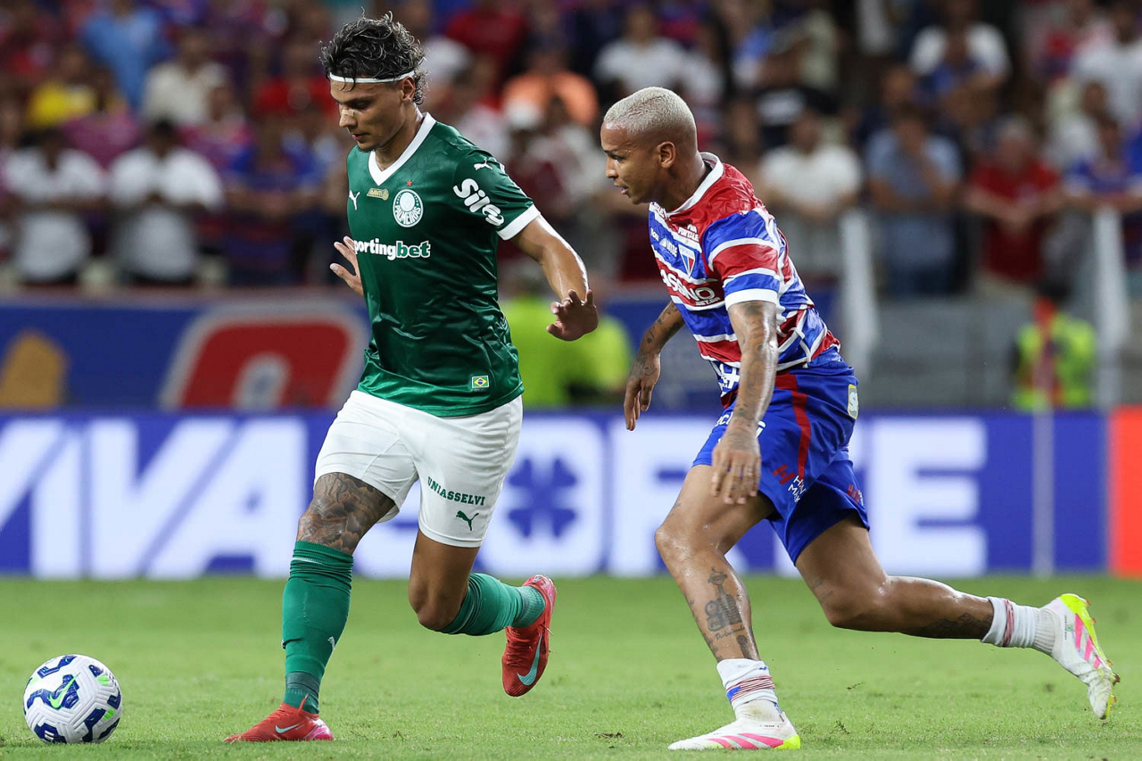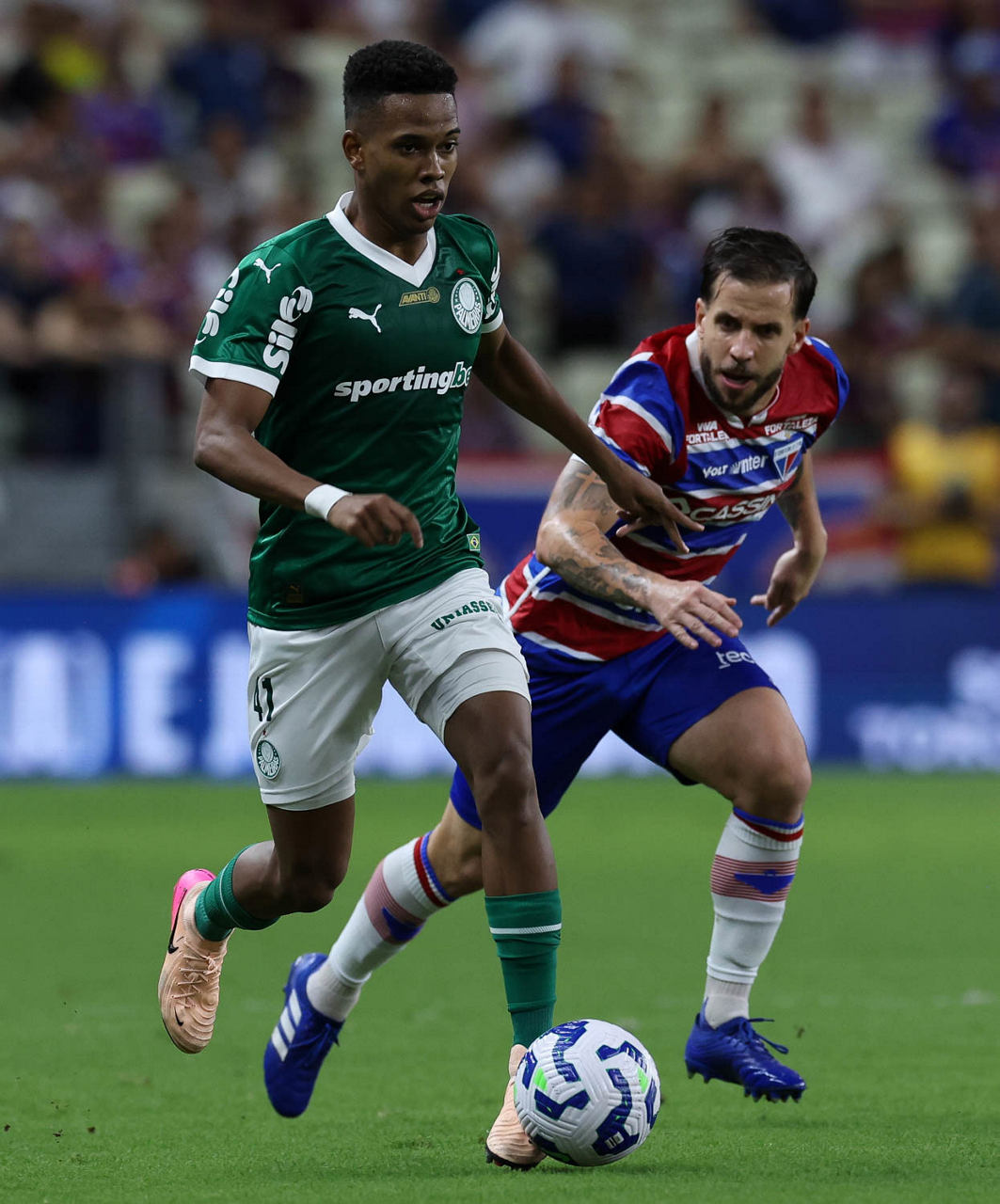 O técnico Abel Ferreira e o preparador físico João Martins (D), da SE Palmeiras, em jogo contra a equipe do Fortaleza EC, durante partida válida pela quinta rodada, do Campeonato Brasileiro, Série A, na Arena Castelão. (Foto: Cesar Greco/Palmeiras/by Canon)