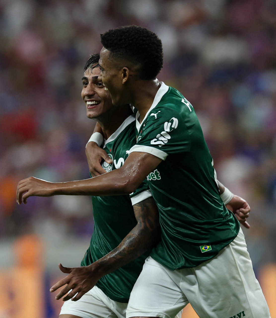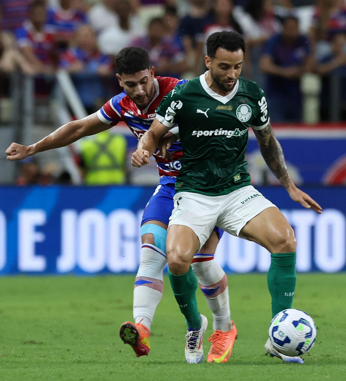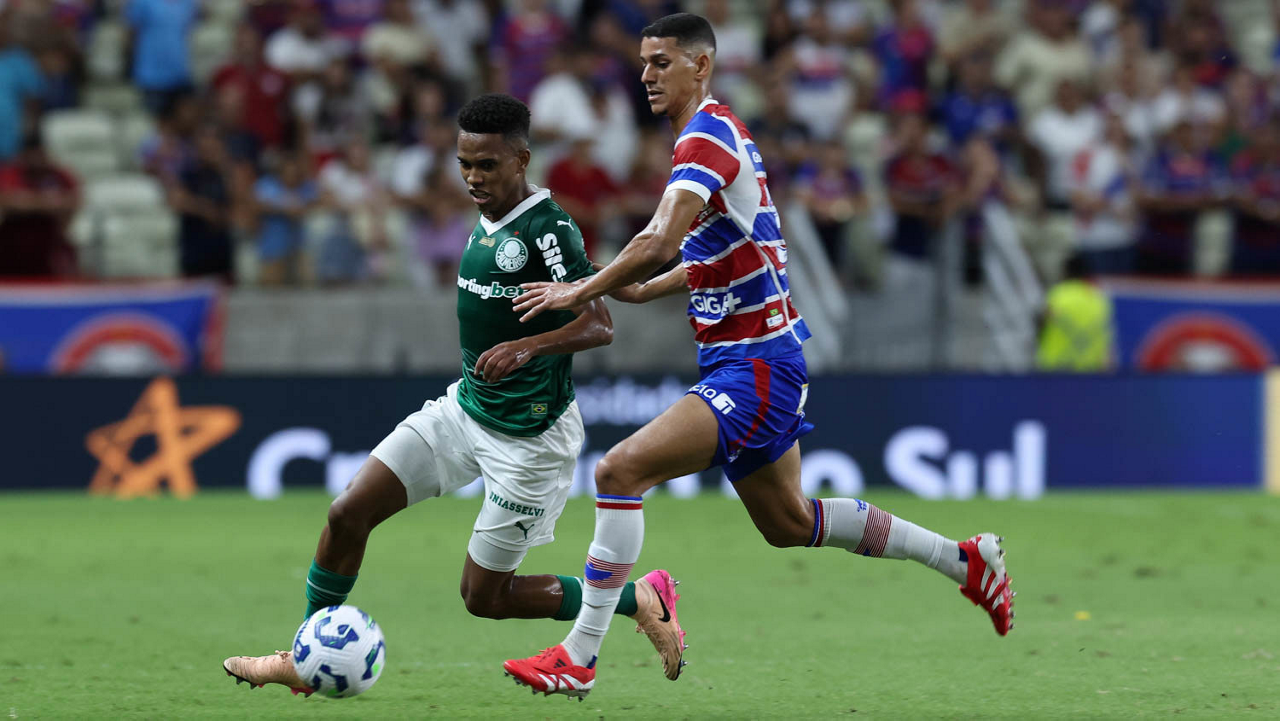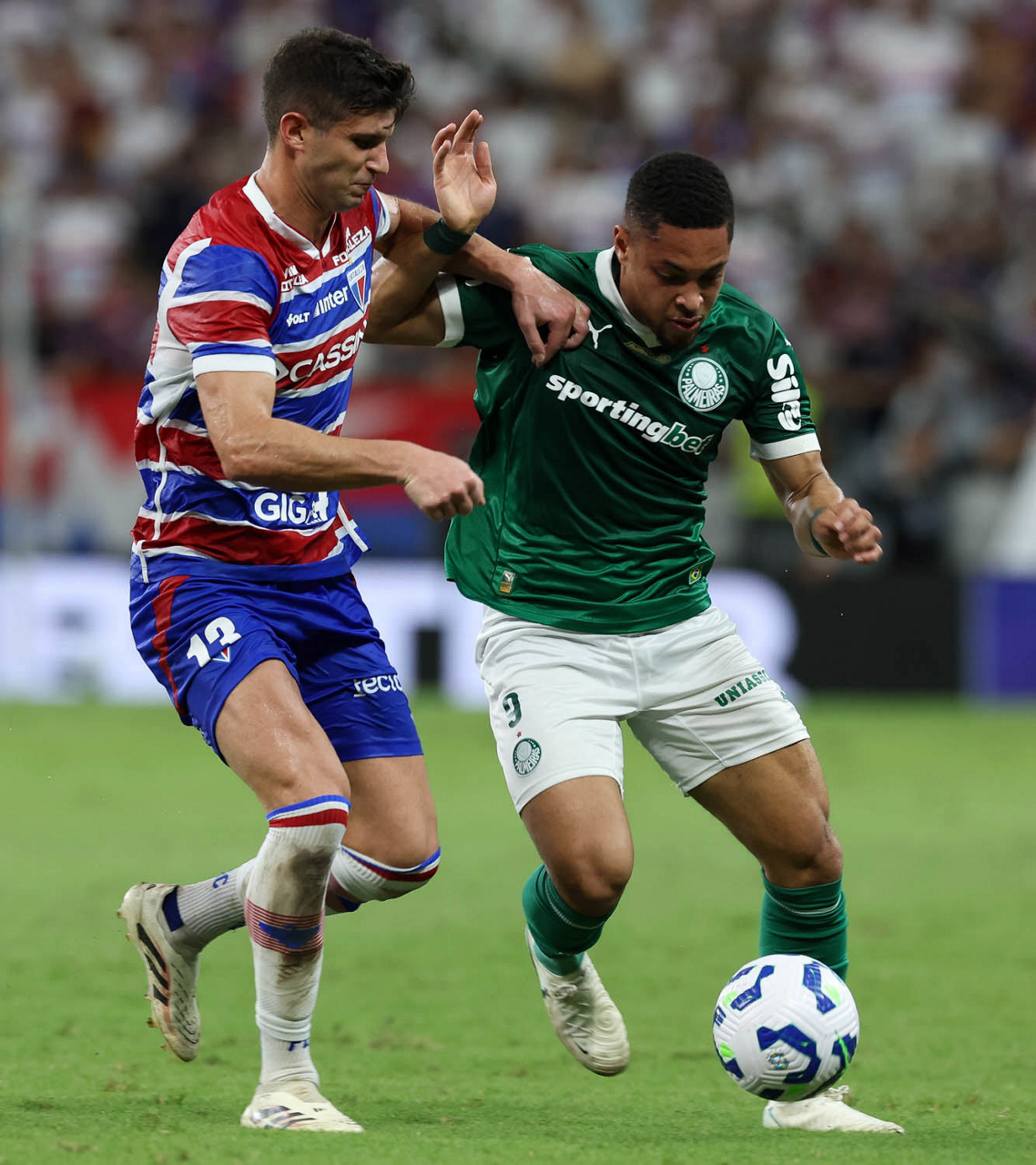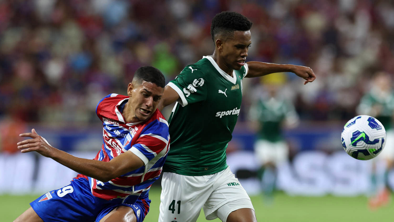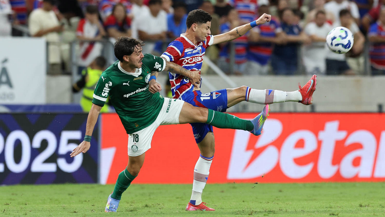 O técnico Abel Ferreira e o preparador físico João Martins (D), da SE Palmeiras, em jogo contra a equipe do Fortaleza EC, durante partida válida pela quinta rodada, do Campeonato Brasileiro, Série A, na Arena Castelão. (Foto: Cesar Greco/Palmeiras/by Canon)