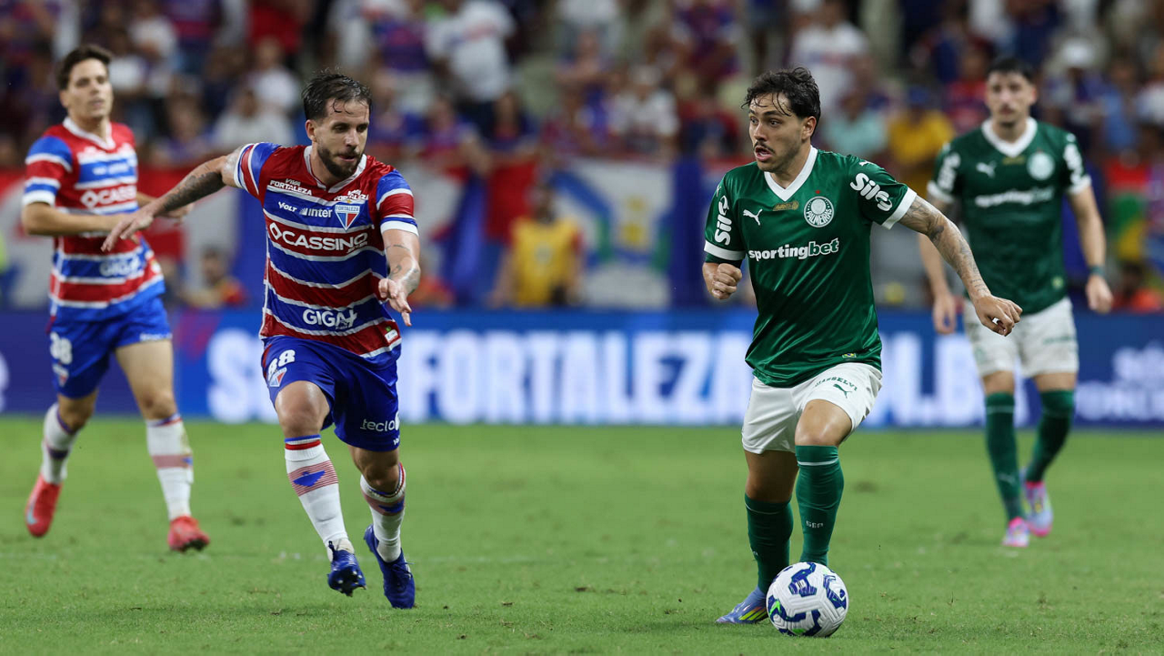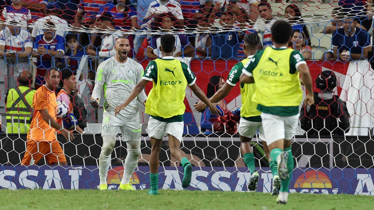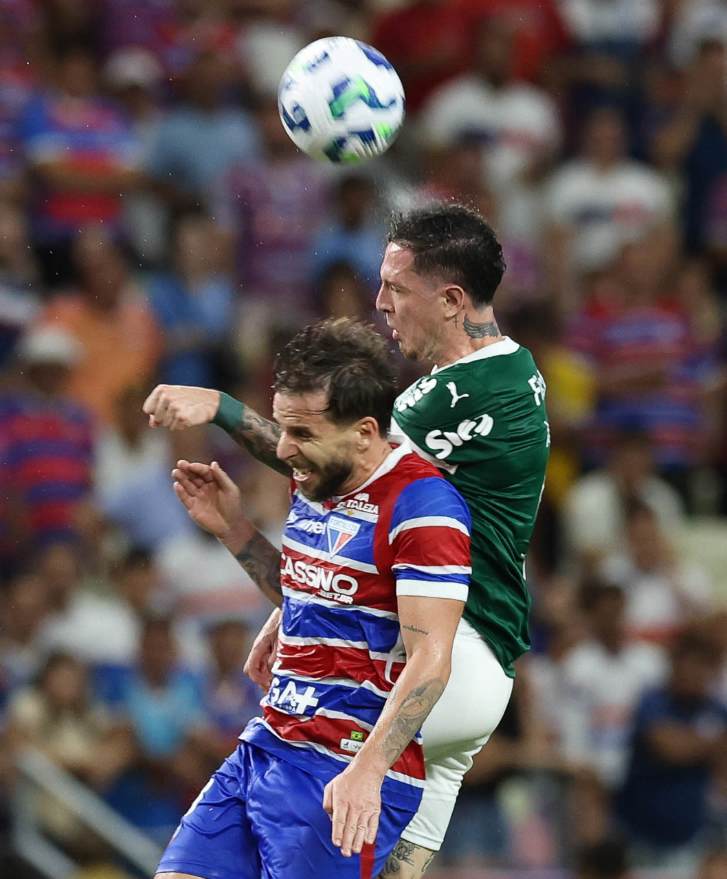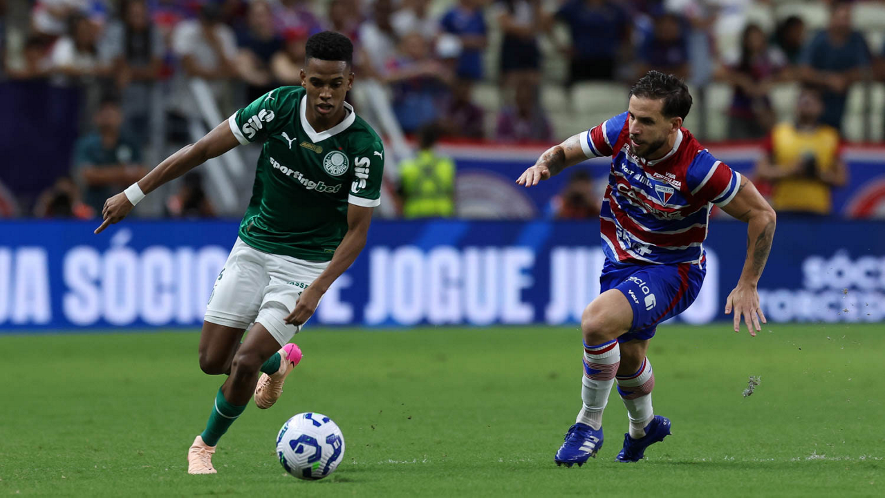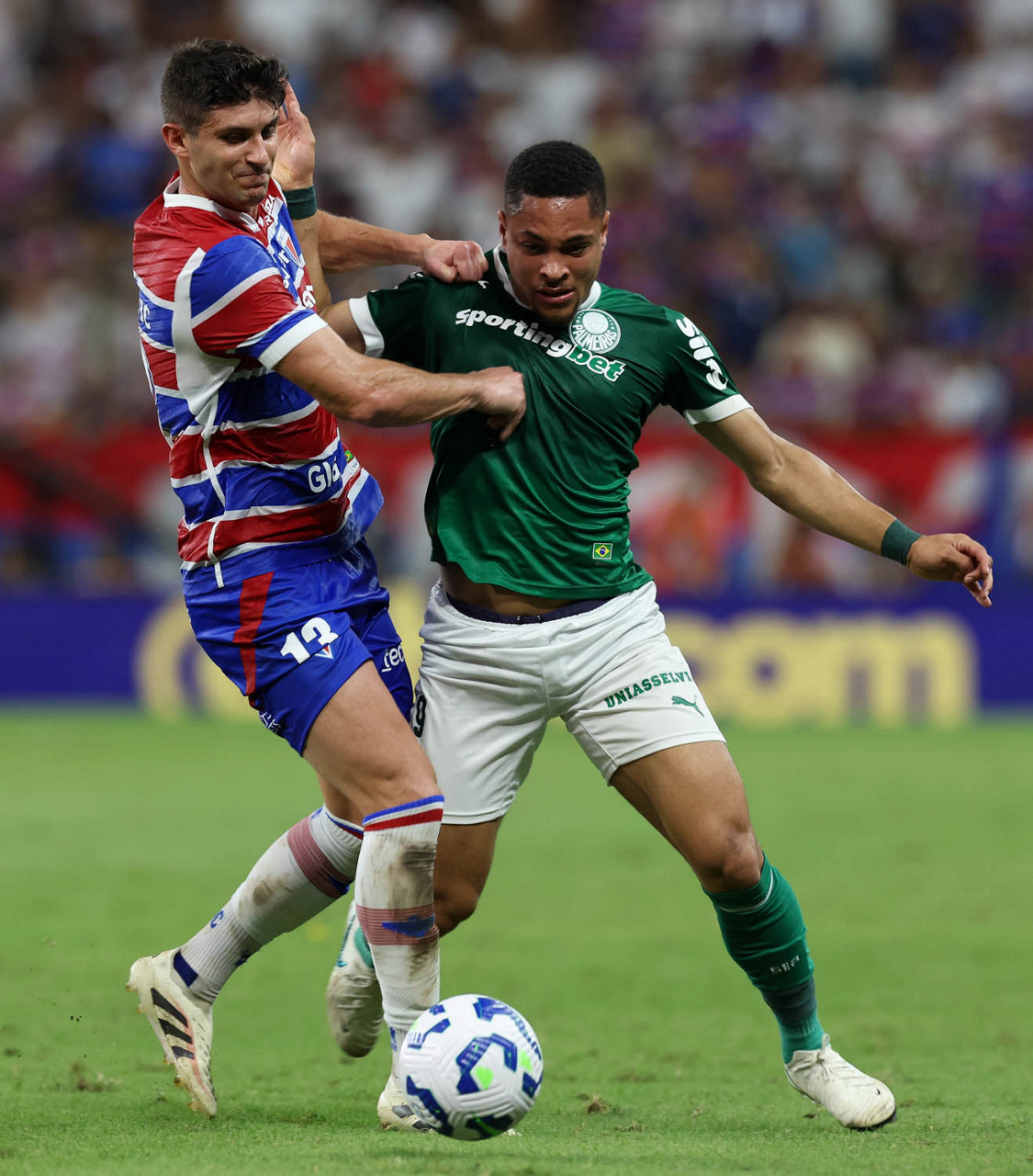 O técnico Abel Ferreira e o preparador físico João Martins (D), da SE Palmeiras, em jogo contra a equipe do Fortaleza EC, durante partida válida pela quinta rodada, do Campeonato Brasileiro, Série A, na Arena Castelão. (Foto: Cesar Greco/Palmeiras/by Canon)