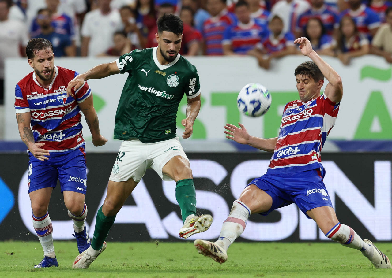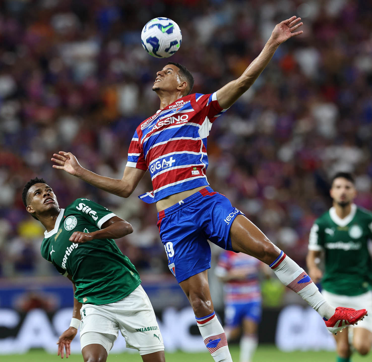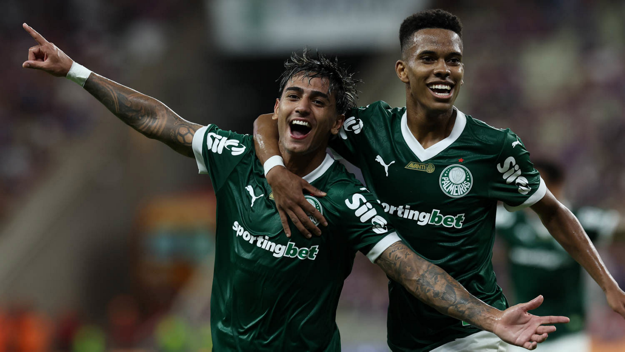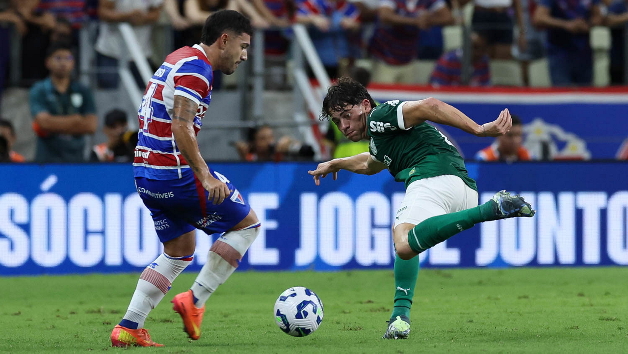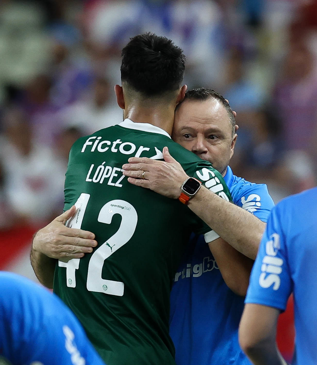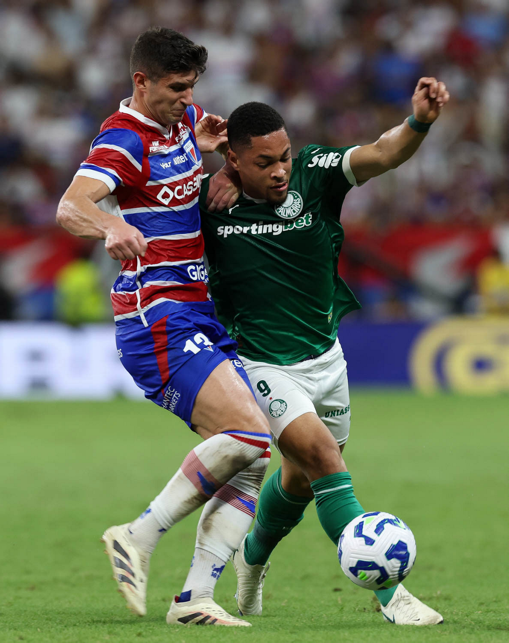 O técnico Abel Ferreira e o preparador físico João Martins (D), da SE Palmeiras, em jogo contra a equipe do Fortaleza EC, durante partida válida pela quinta rodada, do Campeonato Brasileiro, Série A, na Arena Castelão. (Foto: Cesar Greco/Palmeiras/by Canon)