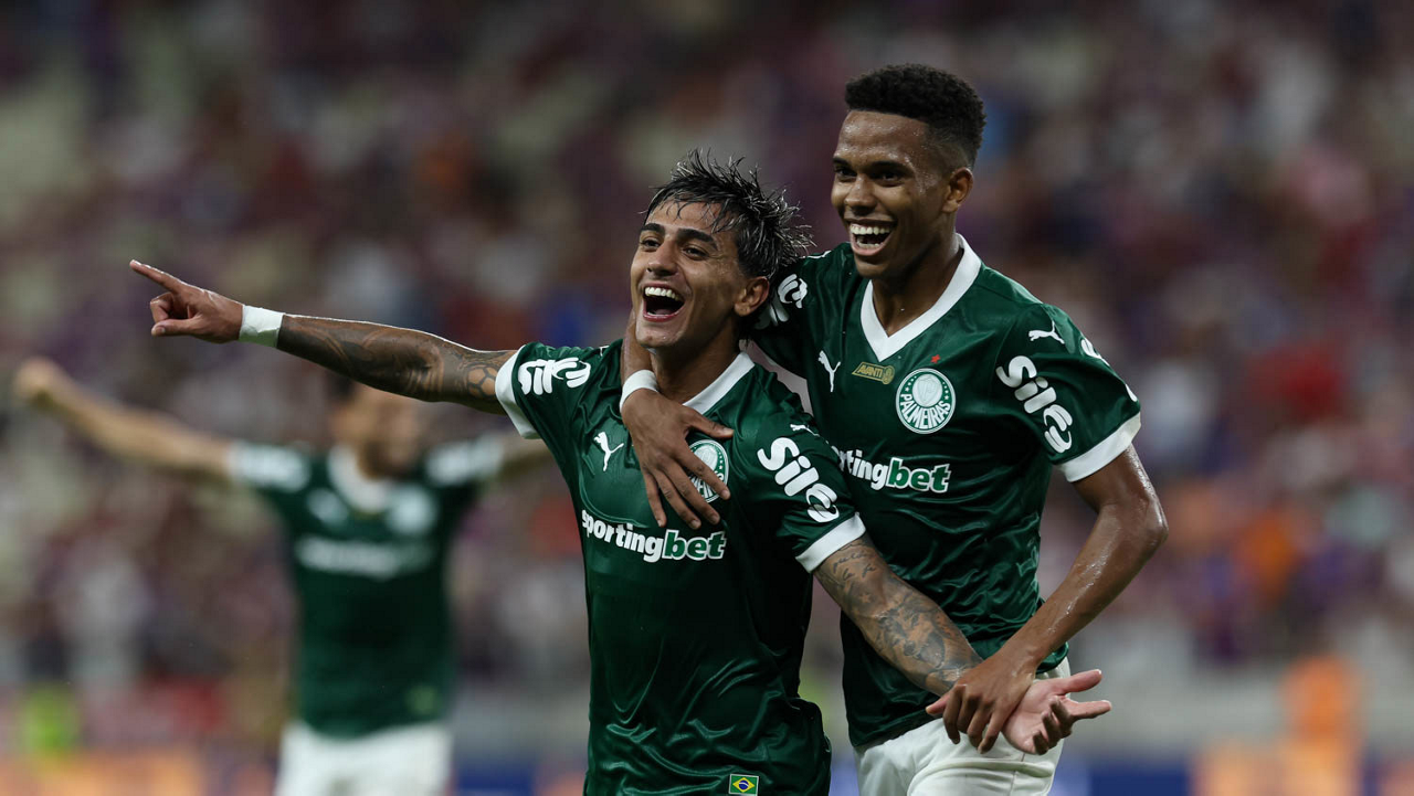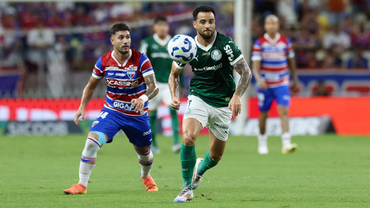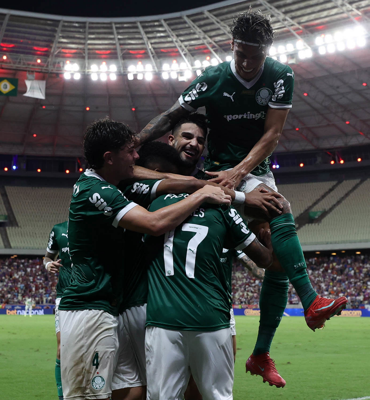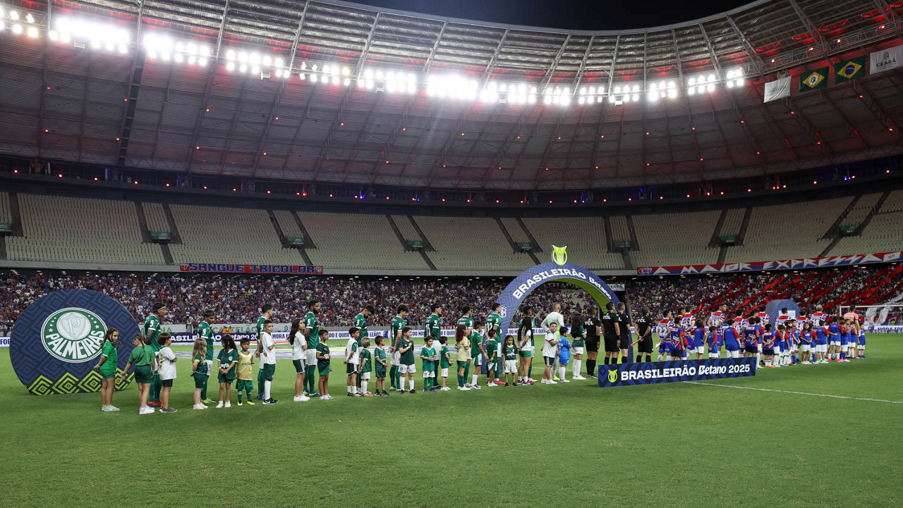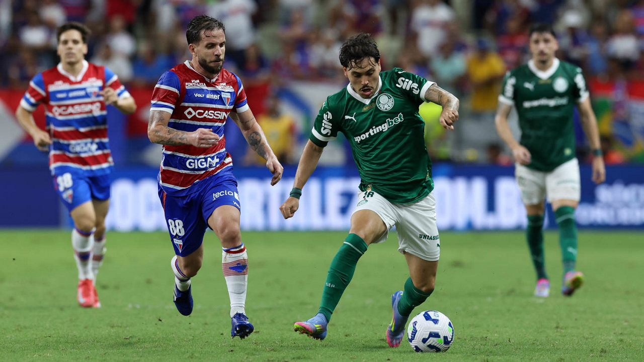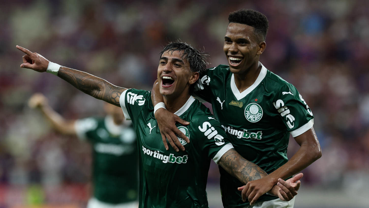 O técnico Abel Ferreira e o preparador físico João Martins (D), da SE Palmeiras, em jogo contra a equipe do Fortaleza EC, durante partida válida pela quinta rodada, do Campeonato Brasileiro, Série A, na Arena Castelão. (Foto: Cesar Greco/Palmeiras/by Canon)