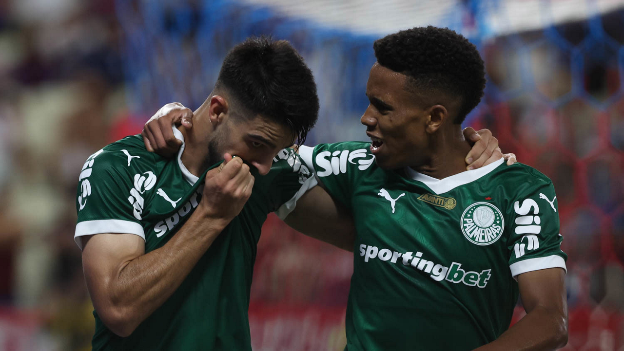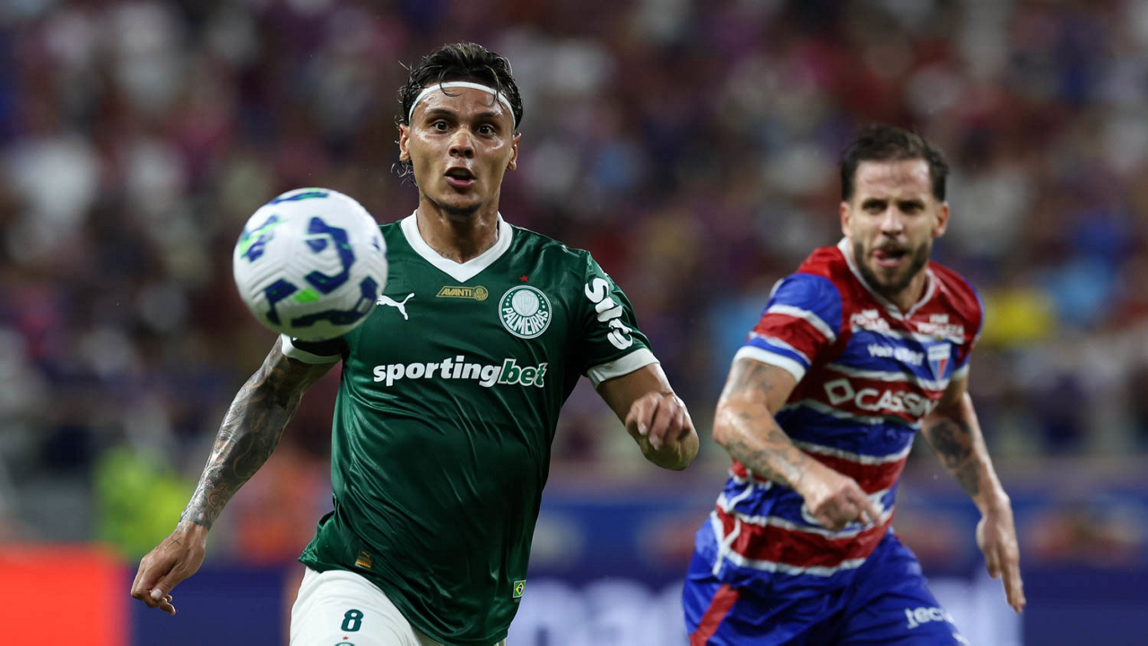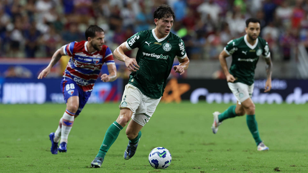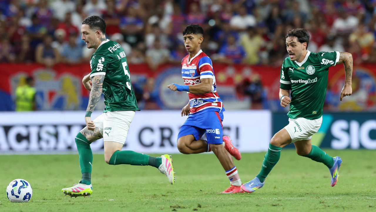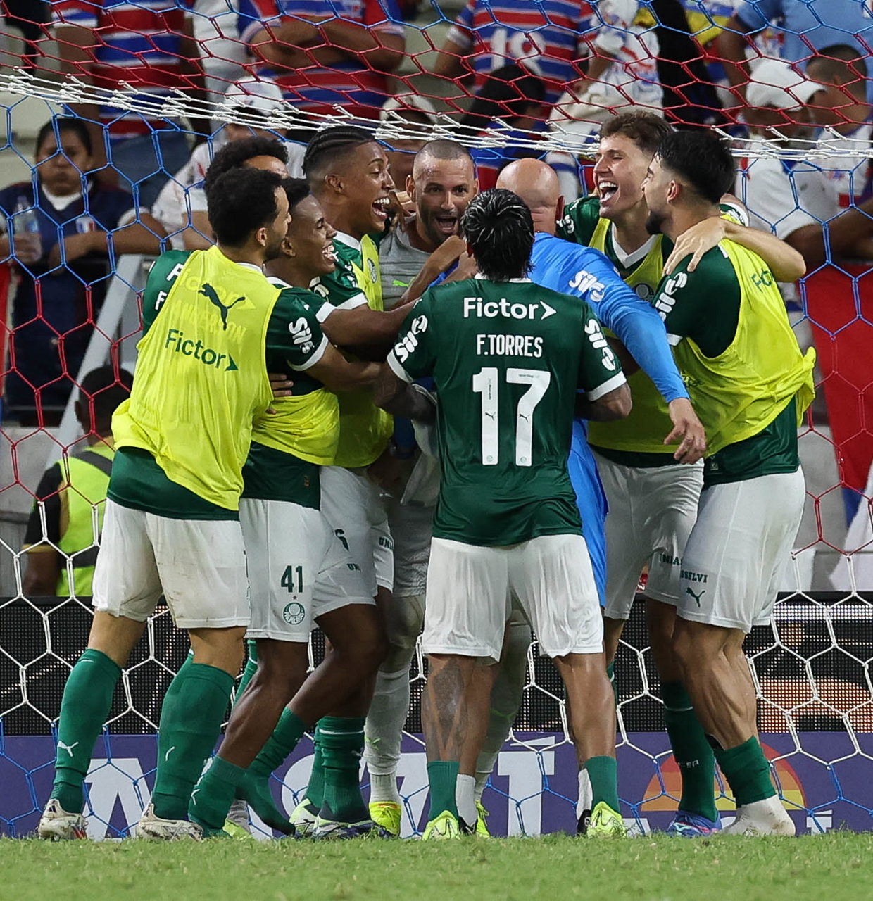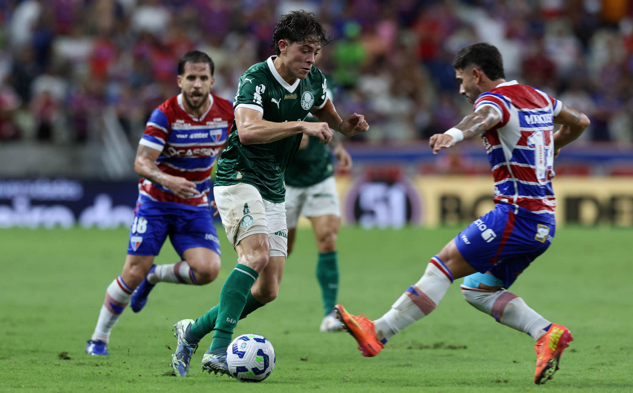 O técnico Abel Ferreira e o preparador físico João Martins (D), da SE Palmeiras, em jogo contra a equipe do Fortaleza EC, durante partida válida pela quinta rodada, do Campeonato Brasileiro, Série A, na Arena Castelão. (Foto: Cesar Greco/Palmeiras/by Canon)