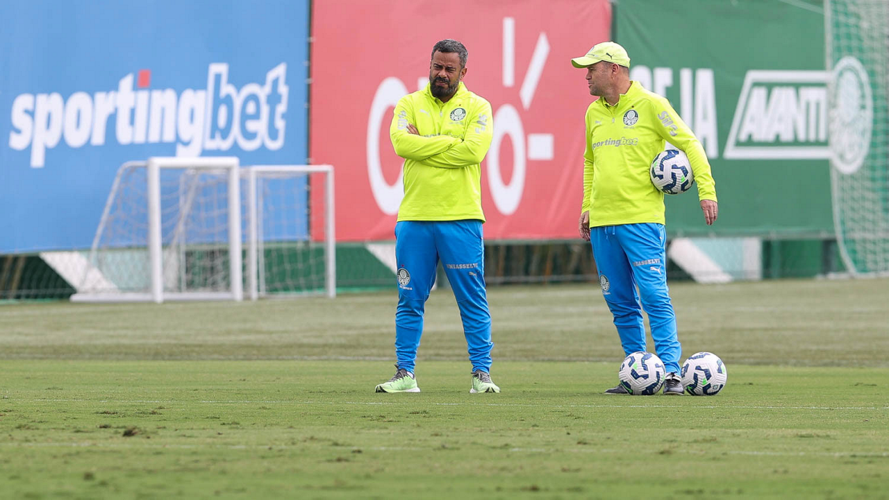 O coordenador científico Daniel Gonçalves e o auxiliar técnico Andrey Lopes (D), da SE Palmeiras, durante treinamento, na Academia de Futebol. (Foto: Cesar Greco/Palmeiras/by Canon)