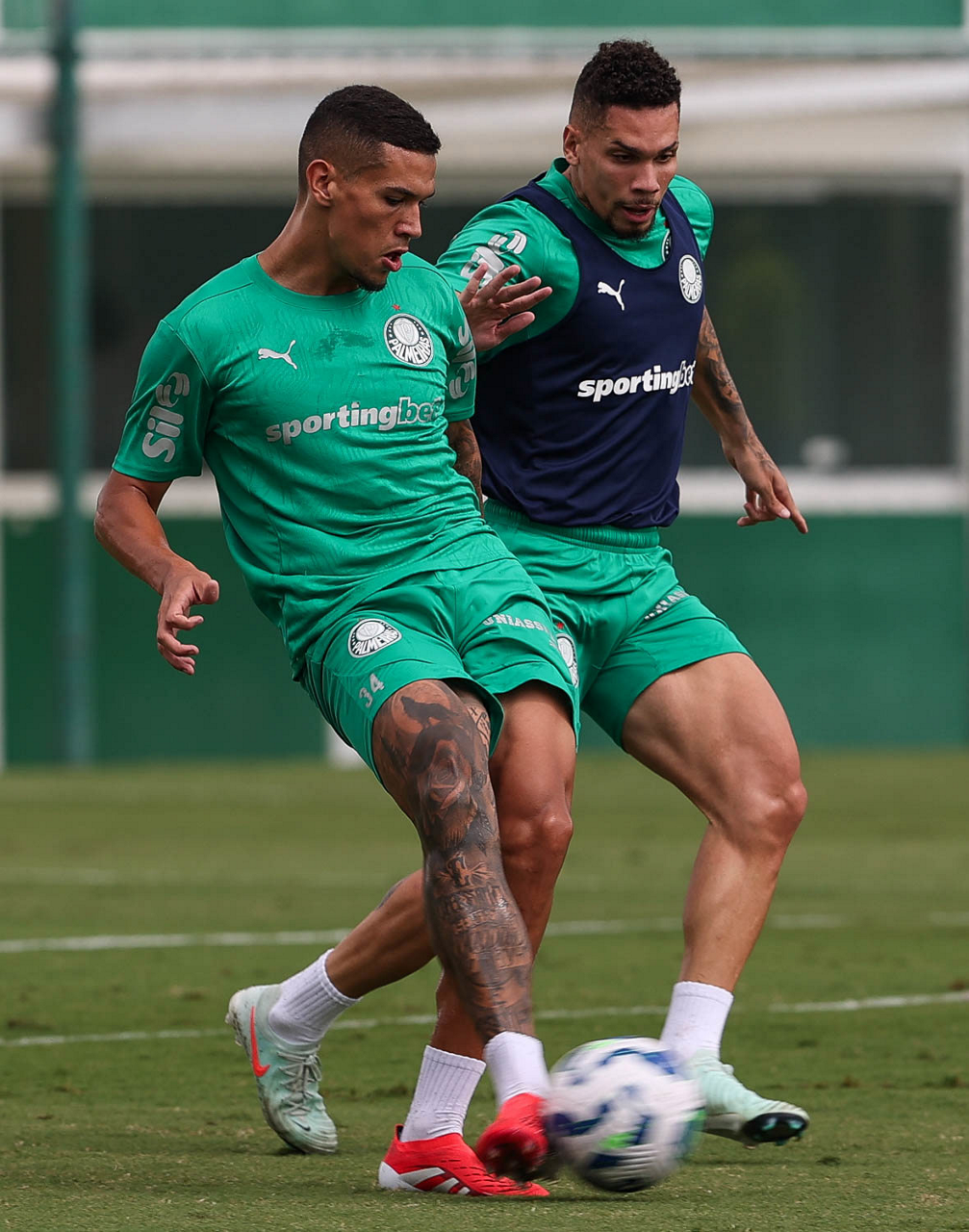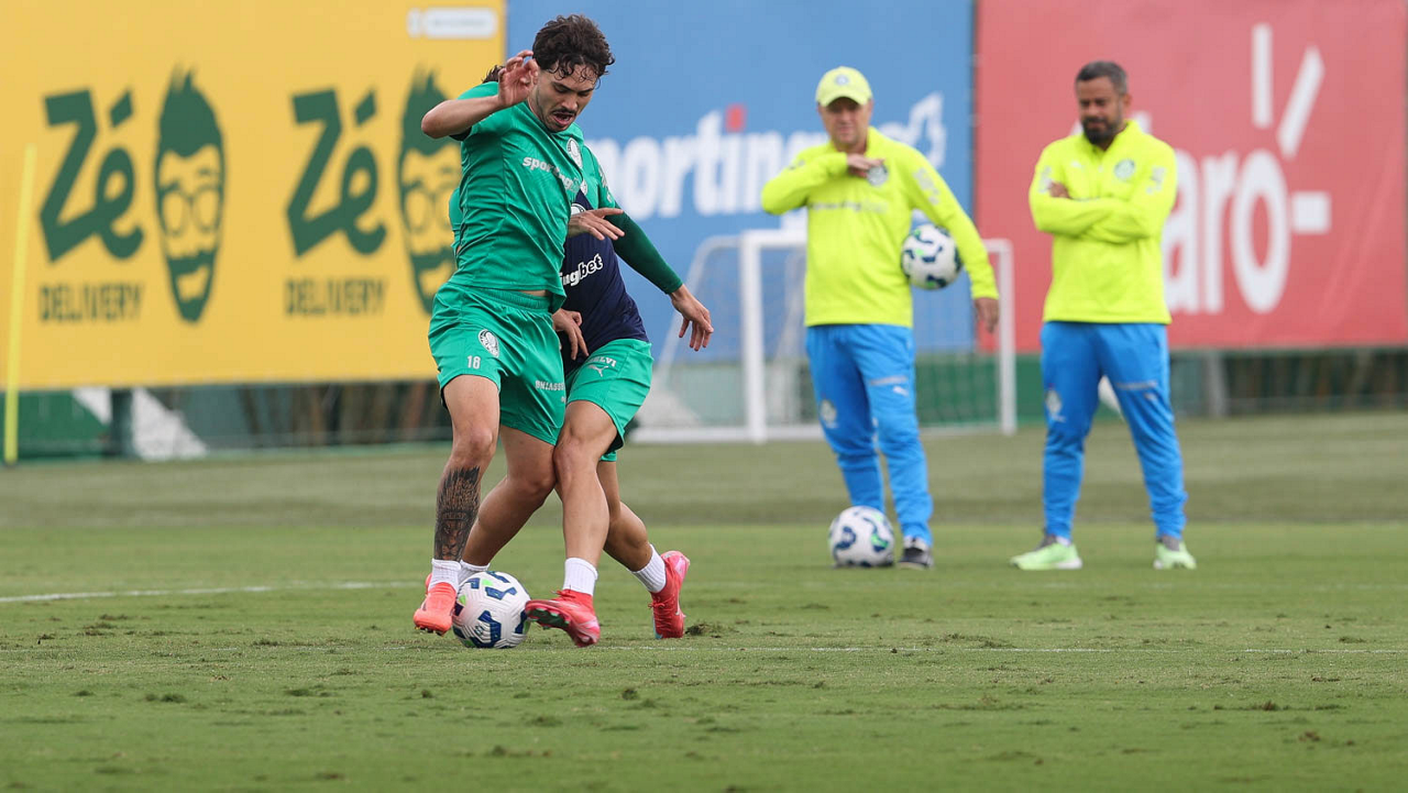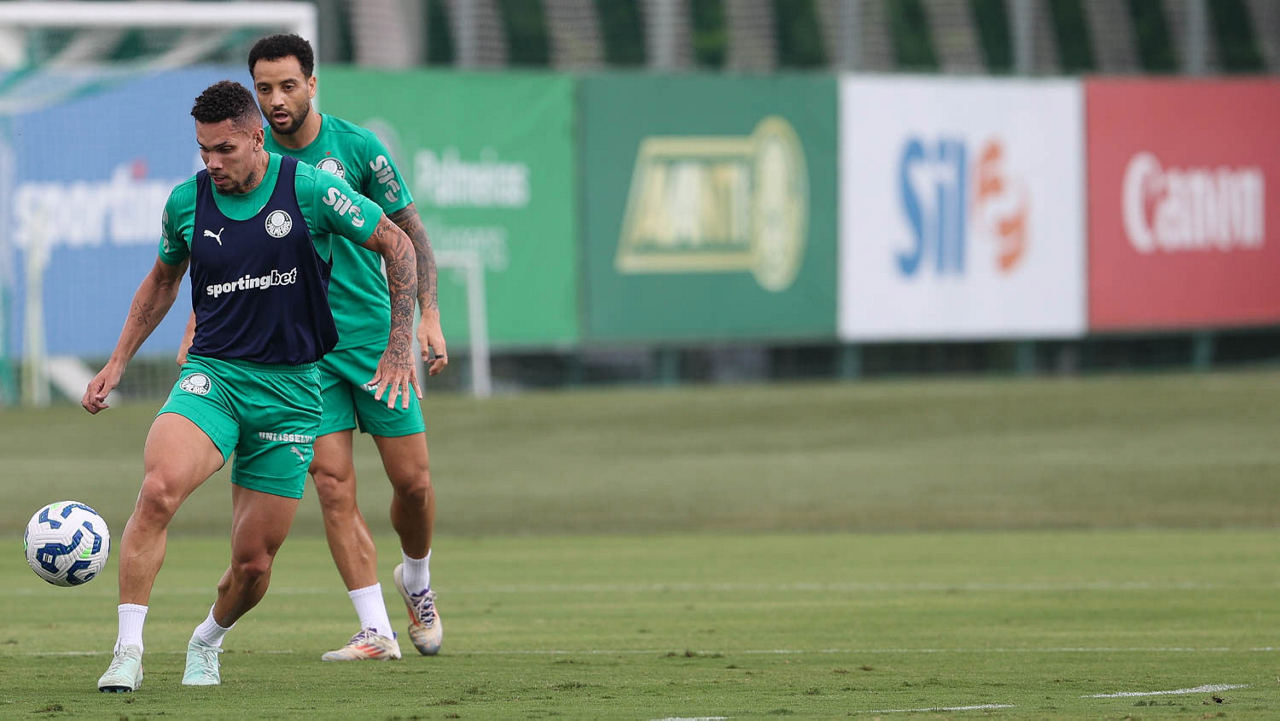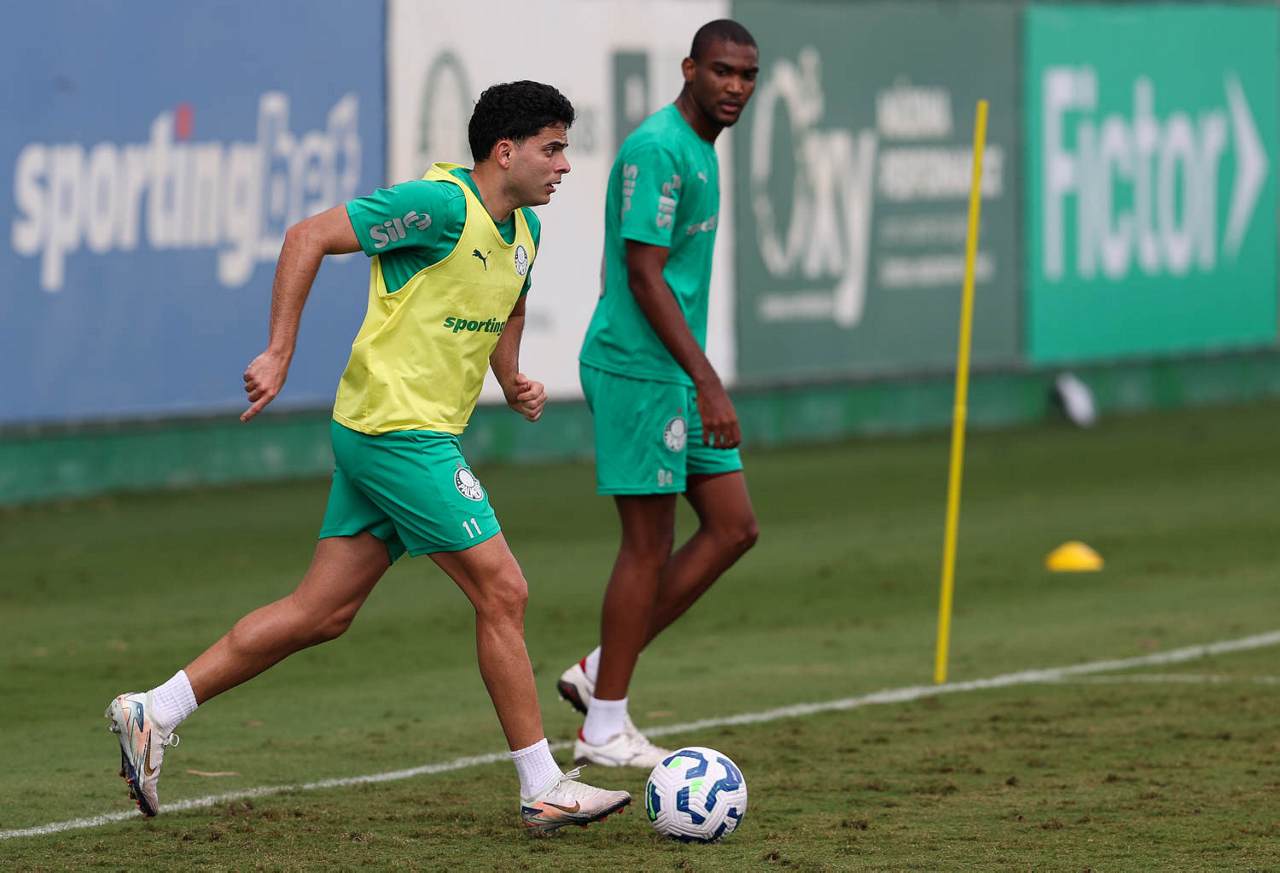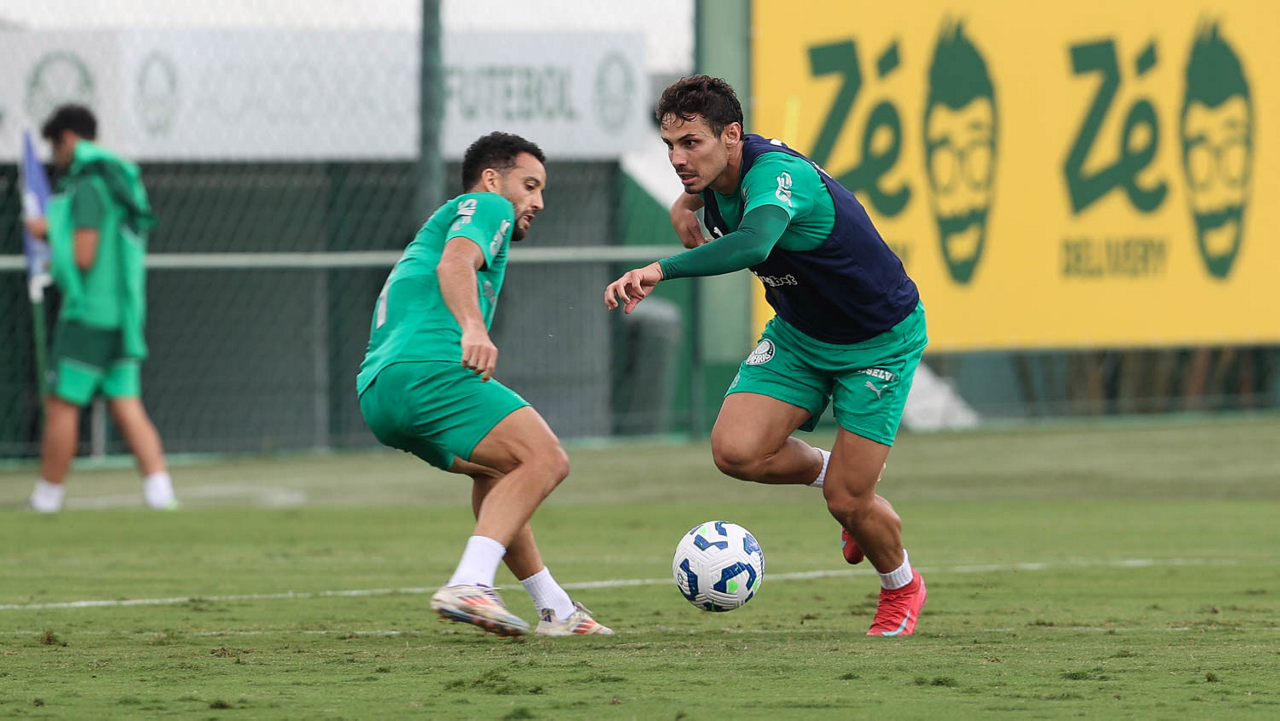 Os jogadores Thalys e Richard Ríos (D), da SE Palmeiras, durante treinamento, na Academia de Futebol. (Foto: Cesar Greco/Palmeiras/by Canon)