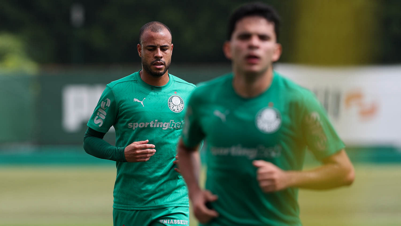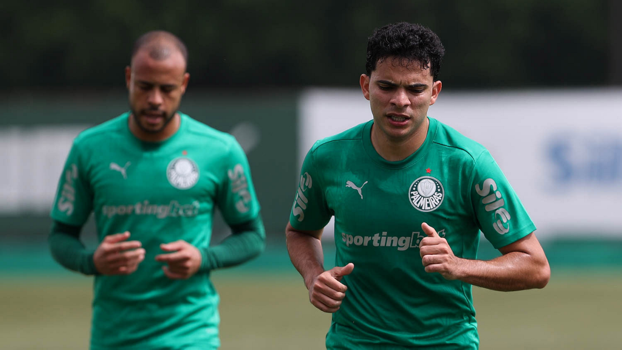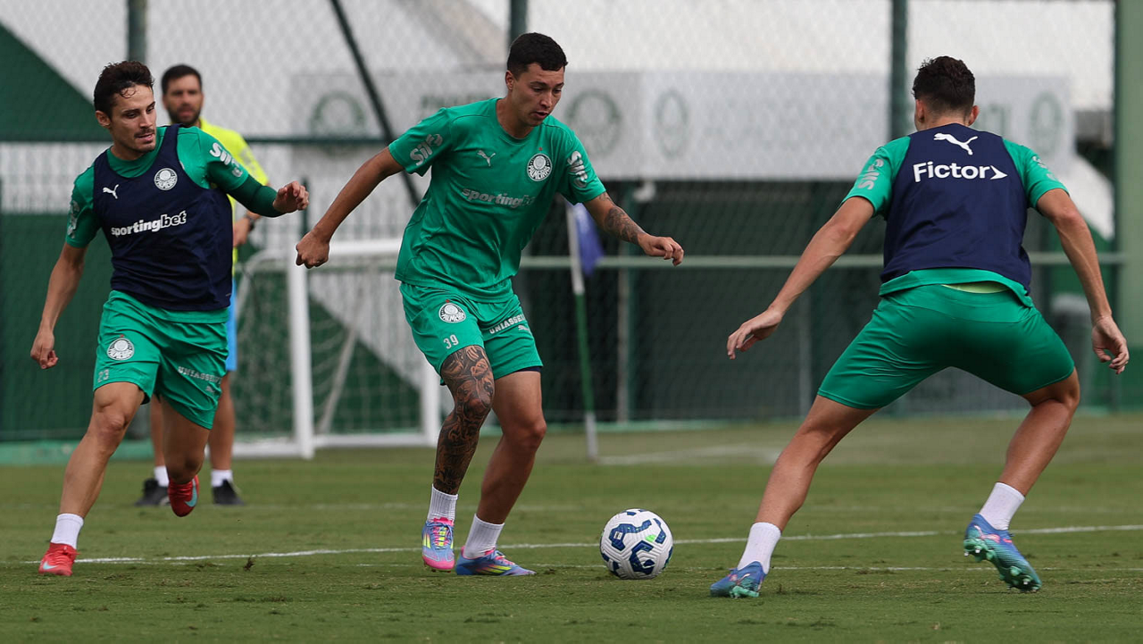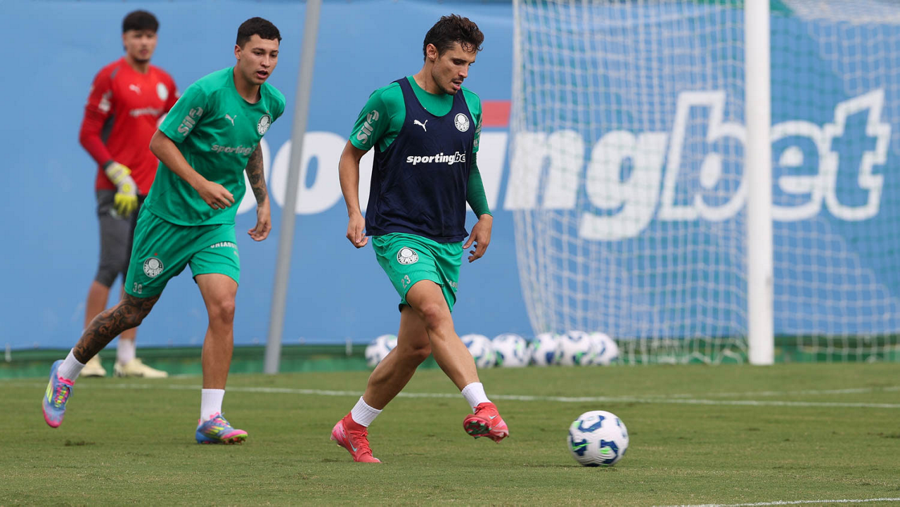 Os jogadores Thalys e Richard Ríos (D), da SE Palmeiras, durante treinamento, na Academia de Futebol. (Foto: Cesar Greco/Palmeiras/by Canon)