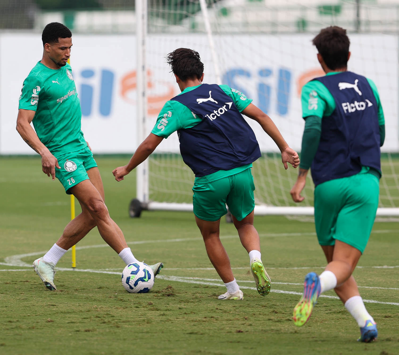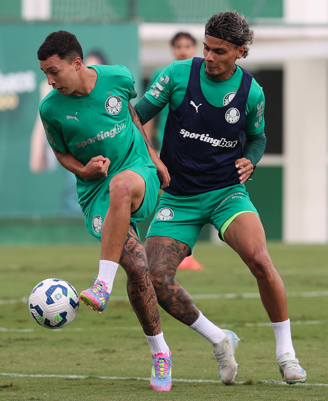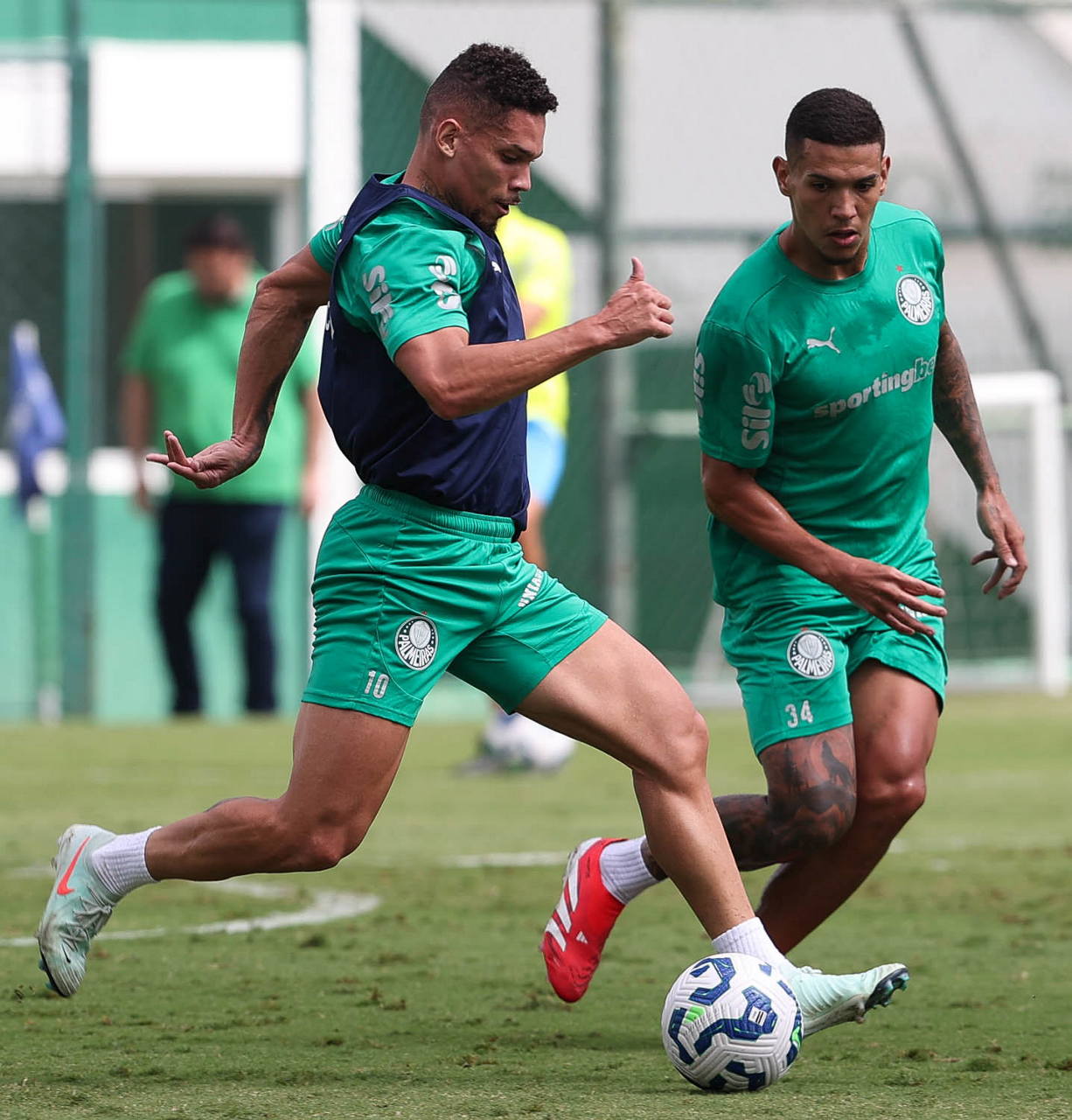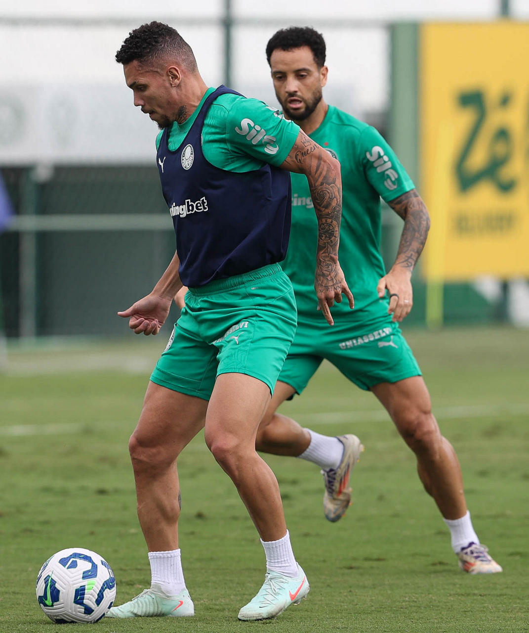 Os jogadores Thalys e Richard Ríos (D), da SE Palmeiras, durante treinamento, na Academia de Futebol. (Foto: Cesar Greco/Palmeiras/by Canon)