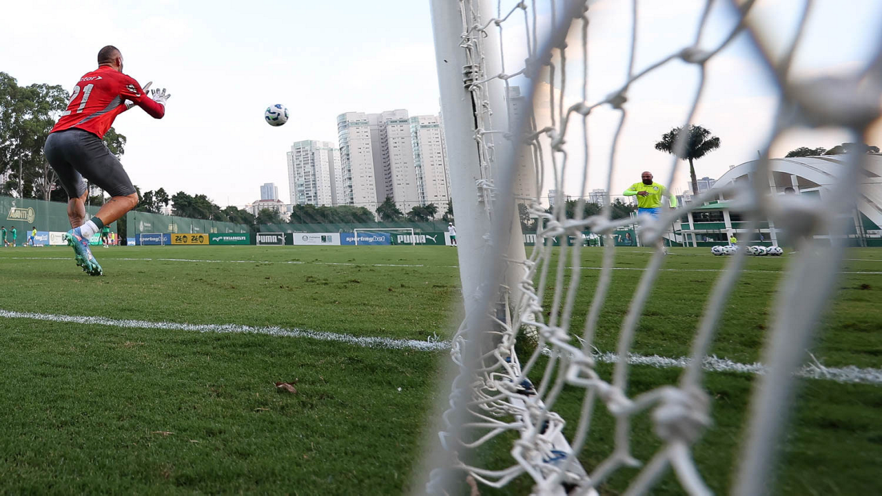 Os jogadores Lucas Evangelista, Raphael Veiga, Mauricio, Marcelo Lomba, Naves, Felipe Anderson, Vanderlan, Bruno Fuchs, Allan e Thalys (E/D em pé) e Luighi, Paulinho e Aranha (E/D agachados), da SE Palmeiras, durante treinamento, na Academia de Futebol. (Foto: Cesar Greco/Palmeiras/by Canon)