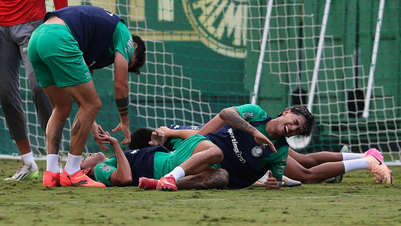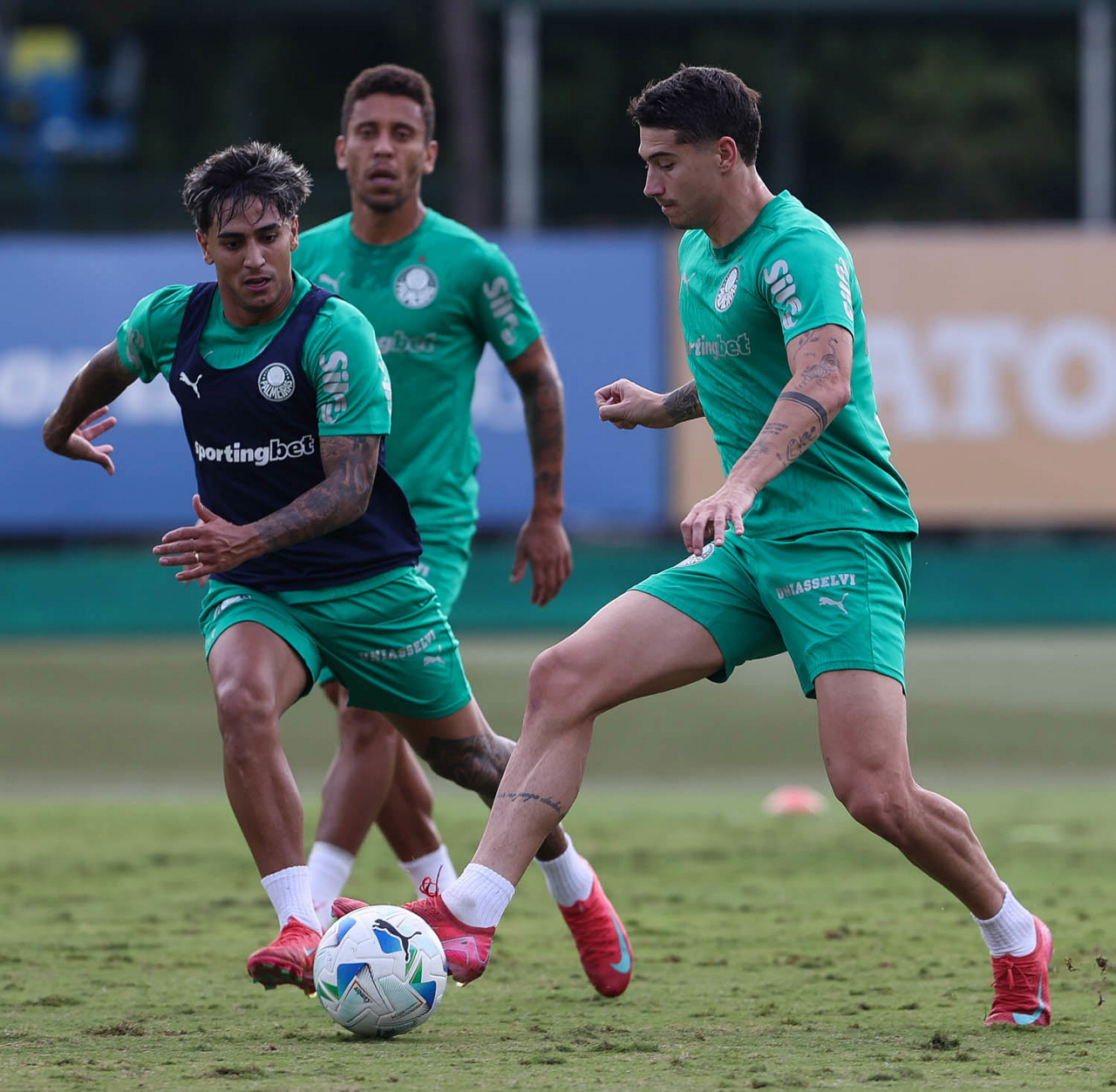 Os jogadores Estêvão, Gustavo Gómez e Raphael Veiga (E/D), da SE Palmeiras, durante treinamento, na Academia de Futebol. (Foto: Cesar Greco/Palmeiras/by Canon)