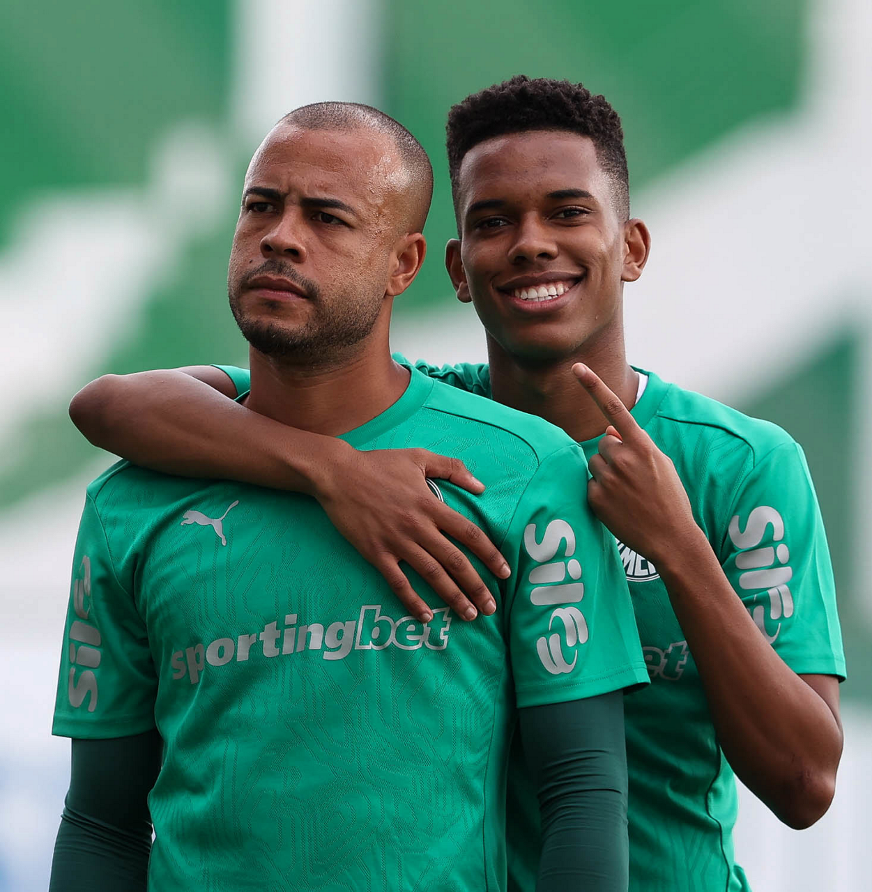 Os jogadores Bruno Rodrigues e Estêvão (D), da SE Palmeiras, durante treinamento, na Academia de Futebol. (Foto: Cesar Greco/Palmeiras/by Canon)