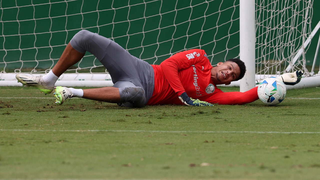 O goleiro Mateus, da SE Palmeiras, durante treinamento, na Academia de Futebol. (Foto: Cesar Greco/Palmeiras/by Canon)