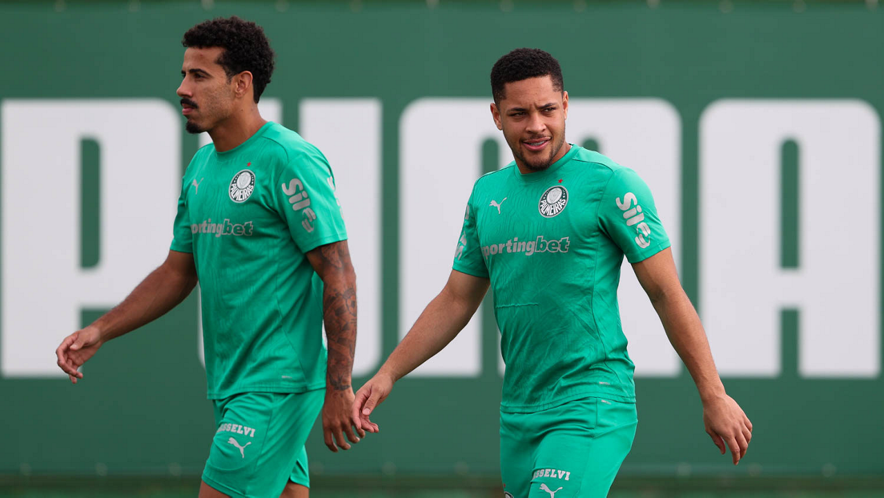 Os jogadores Thalys e Richard Ríos (D), da SE Palmeiras, durante treinamento, na Academia de Futebol. (Foto: Cesar Greco/Palmeiras/by Canon)