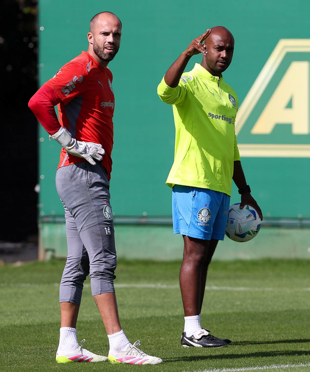 O goleiro Marcelo Lomba e o preparador de goleiro Thales Damasceno (D), da SE Palmeiras, durante treinamento, na Academia de Futebol. (Foto: Cesar Greco/Palmeiras/by Canon)